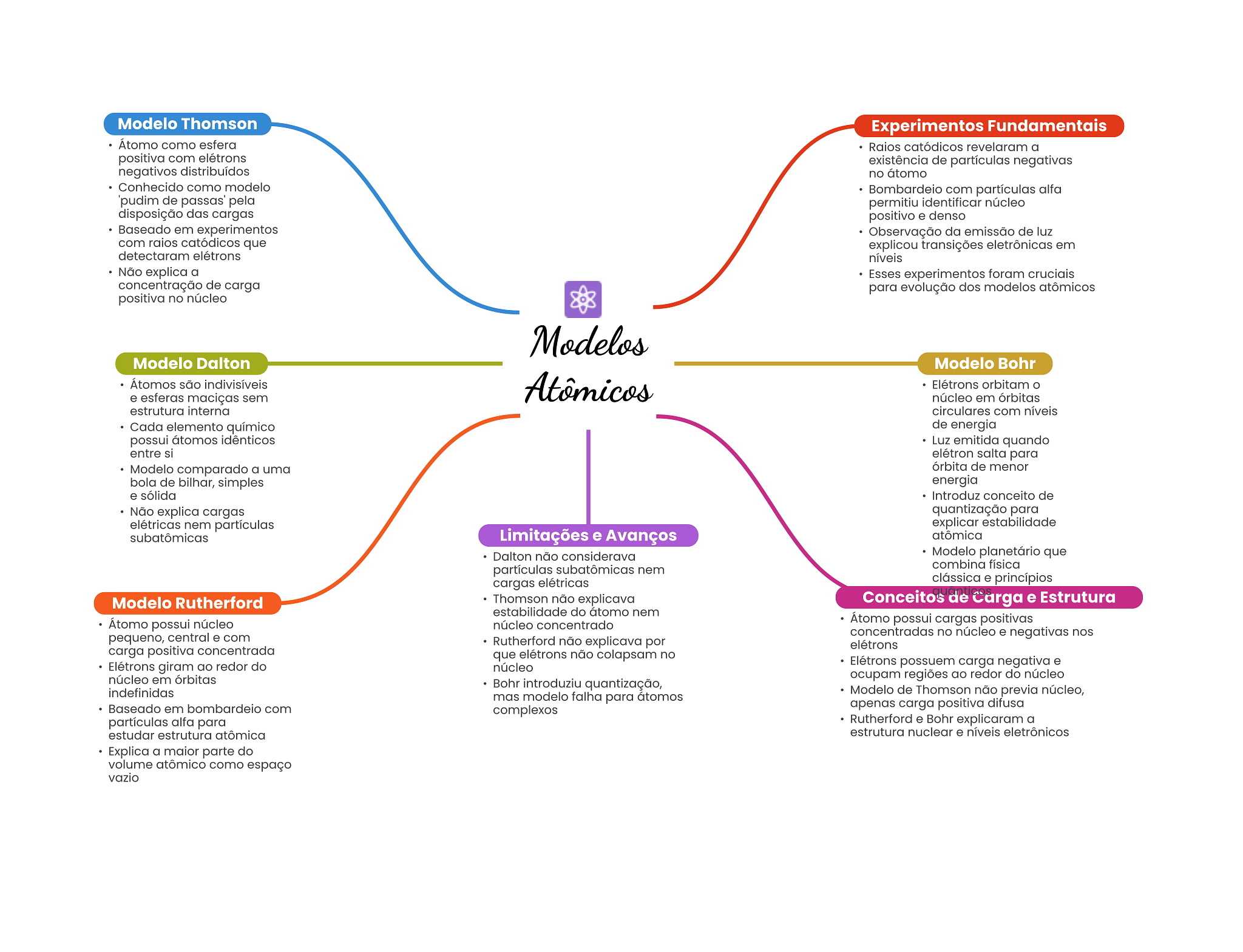 Modelo Thomson Experimentos Fundamentais Átomo como esfera Raios catódicos revelaram a positiva com elétrons existência de partículas negativas negativos distribuídos no átomo Conhecido como modelo Bombardeio com partículas alfa de pela permitiu identificar núcleo disposição das cargas positivo e denso Baseado em experimentos Observação da emissão de luz com raios catódicos que explicou transições eletrônicas em detectaram elétrons níveis Não explica a Esses experimentos foram cruciais concentração de carga para evolução dos modelos atômicos positiva no núcleo Modelos Modelo Dalton Modelo Bohr Átomos são indivisíveis e esferas maciças sem Atômicos Elétrons orbitam núcleo em órbitas estrutura interna circulares com níveis Cada elemento químico de energia possui átomos idênticos Luz emitida quando entre si elétron salta para Modelo comparado a uma órbita de menor bola de bilhar, simples energia e sólida Introduz conceito de Não explica cargas quantização para elétricas nem partículas explicar estabilidade subatômicas Limitações e Avanços atômica Dalton não considerava Modelo planetário que combina física partículas subatômicas nem cargas elétricas clássica e princípios Modelo Rutherford Thomson não explicava Conceitos de Carga e Estrutura estabilidade do átomo nem Átomo possui núcleo núcleo concentrado Átomo possui cargas positivas pequeno, central e com concentradas no núcleo e negativas nos Rutherford não explicava por elétrons carga positiva concentrada que elétrons não colapsam no Elétrons giram ao redor do núcleo Elétrons possuem carga negativa e núcleo em órbitas ocupam regiões ao redor do núcleo Bohr introduziu quantização, indefinidas mas modelo falha para átomos Modelo de Thomson não previa núcleo, Baseado em bombardeio com complexos apenas carga positiva difusa partículas alfa para Rutherford e Bohr explicaram a estudar estrutura atômica estrutura nuclear e níveis eletrônicos Explica a maior parte do volume atômico como espaço vazio