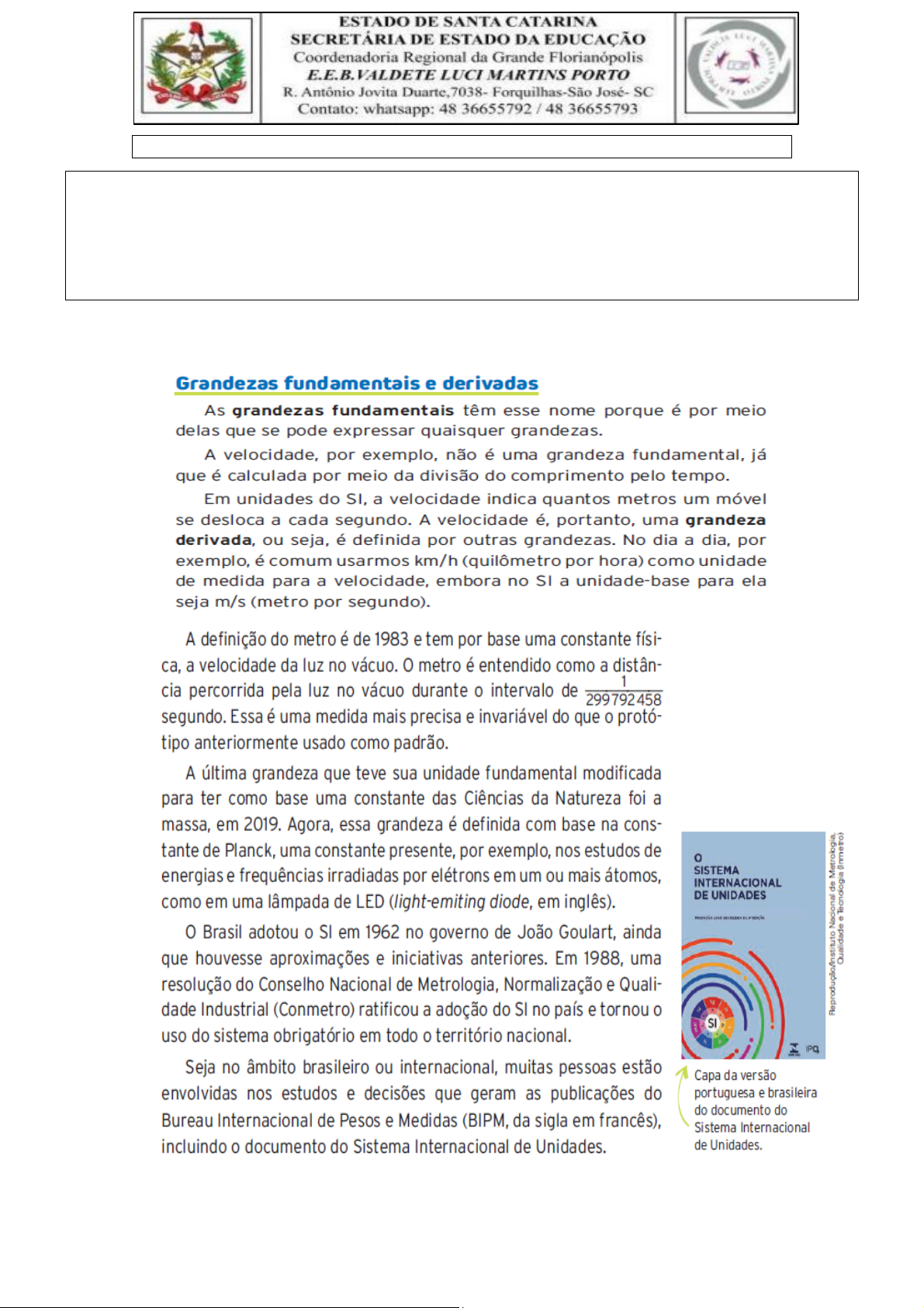 Prof. CELENUBIA LIRA DE OLIVEIRA Estudante:_____________________________________________________________ Turma :102.1 Data: 08/ 08 /2025 Aula: 01 Componente Curricular: CIENCIAS DA NATUREZA FÍSICA; Habilidades / Competências: EM13CNT301; EM13CNT302; analisar fenômenos naturais e processos tecnológicos, com base nas interações e relações entre matéria e energia, para propor ações individuais e coletivas que aperfeiçoem processos produtivos, minimizem impactos socioambientais e melhorem as condições de vida em âmbito local, regional e global. Algumas dessas regras são: • Aplicar um espaço entre o número e a unidade. Exemplo: 10 m, e não 10m. • Escrever o símbolo das unidades em letras minúsculas, exceto quando o nome da unidade homenagear uma pessoa. Exemplo: 2 s, e não 2 S, mas 100 W, porque W é o símbolo de watt, unidade de potência que homenageia o engenheiro escocês James Watt (1736-1819). ATIVIDADES EM SALA DE AULA 01. Uma forma de organizar o conhecimento é por meio de mapas conceituais. Construa um mapa conceitual do que foi aprendido neste capítulo. Seu mapa deve ter, pelo menos, os seguintes itens: • O que são grandezas físicas e sua classificação em escalares e vetoriais, com exemplos das grandezas físicas que você conhece. • Ao menos uma justificativa para a padronização das unidades de medida. • O que é o Sistema Internacional de Unidades. • Quais são as sete grandezas fundamentais estabelecidas pelo SI e suas unidades de medida. • Ao menos dois exemplos de regras utilizadas para expressão de unidades de medida. • Ao menos três prefixos de múltiplos e submúltiplos usados para expressar unidades de medida. • Cálculos de ao menos três exemplos de conversão de unidades de medida que envolvam unidades do SI. Em seguida, responda: a) Descreva: Como foi para fazer o mapa conceitual? Você identificou alguma facilidade ou dificuldade? ______________________________________________________________________ ______________________________________________________________________ _____________________________________________________________________ b) Como você avalia sua aprendizagem dos conceitos relacionados às grandezas físicas e da importância da padronização de unidades para a sociedade? ______________________________________________________________________ ______________________________________________________________________ ______________________________________________________________________ Construa sêu mapa concêitual:Obs:sêm rasuras ê borro ês.