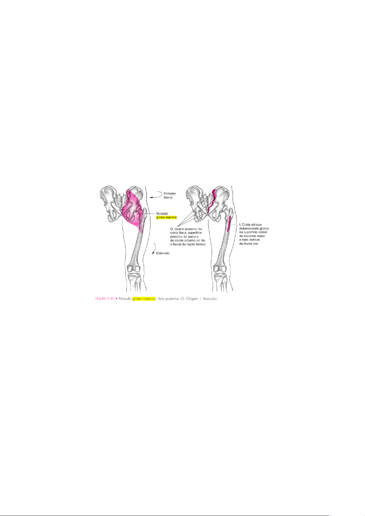 MÚSCULOS DO MEMBRO INFERIOR ● M. GLÚTEO MÁXIMO O: Quarto posterior da crista ilíaca, superfície posterior do sacro e do cóccix próximo ao ílio, e fáscia da região lombar I: Crista oblíqua (tuberosidade glútea) na superfície lateral do trocanter maior e trato iliotibial da fáscia lata. A: Extensão do quadril. Rotação lateral do quadril. Abdução do quadril. Adução do quadril. ● M. TENSOR DA FÁSCIA LATA O: Porção anterior da crista ilíaca e superfície do ílio abaixo da crista. I: Porção ântero-lateral do côndilo da tíbia (tubérculo de Gerdy). A: Abdução do quadril. Flexão do quadril. Rotação medial do quadril. MÚSCULOS DO QUADRÍCEPS ● M. RETO FEMORAL O: Espinha ilíaca anteroinferior do ílio e margem superior do acetábulo. I: Face superior da patela e, por meio do tendão patelar, na tuberosidade da tíbia. A: Flexão do quadril. Extensão do joelho. Rotação anterior da pelve. ● M. VASTO LATERAL O: Linha intertrocantérica, bordas anterior e inferior do trocanter maior, tuberosidade glútea, metade superior da linha áspera e toda a face lateral do septo intermuscular. I: Borda lateral da patela e, por meio do tendão patelar, na tuberosidade da tíbia. A: Extensão do joelho. ● M. VASTO INTERMÉDIO O: ⅔ superiores da superfície anterior do fêmur. I: Borda superior da patela e, por meio do tendão patelar, na tuberosidade da tíbia. A: Extensão do joelho. ● M. VASTO MEDIAL O: Toda a extensão da linha áspera e porção medial da crista epicondilar. I: Metade medial da borda superior da patela e, por meio do tendão patelar, na tuberosidade da tíbia. A: Extensão do joelho. MÚSCULOS POSTERIORES DA COXA ● M. SEMITENDÍNEO O: Túber isquiático. I: Superfície ântero medial da tíbia abaixo do côndilo. A: Flexão do joelho. Extensão do quadril. Rotação medial do quadril. Rotação medial do joelho flexionado. Rotação posterior da pelve. ● M. SEMIMEMBRANÁCEO O: Túber isquiático. I: Superfície póstero medial do côndilo medial da tíbia. A: Flexão do joelho. Extensão do quadril. Rotação medial do quadril. Rotação medial do joelho flexionado. Rotação posterior da pelve. ● M. BÍCEPS FEMORAL O: Cabeça longa: túber isquiático. Cabeça curta: metade inferior da linha áspera e porção lateral da crista supraepicondilar. I: Côndilo lateral da tíbia e cabeça da fíbula. A: Flexão do joelho. Extensão do quadril. Rotação lateral do quadril. Rotação lateral do joelho flexionado. ● M. GRÁCIL O: Borda ântero medial do ramo descendente do púbis. I: Superfície ântero medial da tíbia abaixo do côndilo. A: Adução do quadril. Flexão fraca do joelho. Rotação medial do quadril. Auxílio na flexão do quadril. Rotação medial fraca do joelho. ● M. TIBIAL ANTERIOR O: ⅔ superiores da superfície lateral da tíbia. I: Superfície interna do cuneiforme medial e base do I metatarsal. A: Dorsiflexão do tornozelo. Inversão do pé. ● M. EXTENSOR LONGO DOS DEDOS O: Côndilo lateral da tíbia, cabeça da fíbula e ⅔ superiores da superfície anterior da fíbula. I: Parte superior das falanges médias e distais dos quatro artesãos menores. A: Extensão das articulações metatarsofalângicas e interfalângicas proximais e distais. Dorsiflexão do tornozelo. Eversão do pé. ● M. GASTROCNÊMIO O: Cabeça medial: superfície posterior do côndilo femoral medial. Cabeça lateral: superfície posterior do côndilo femoral lateral. I: Superfície posterior do calcâneo (tendão do calcâneo). A: Flexão plantar do tornozelo. Flexão do joelho. ● M. SÓLEO O: Superfície posterior da porção proximal da fíbula e ⅔ proximais da superfície posterior da tíbia. I: Superfície posterior do calcâneo (tendão do calcâneo). A: Flexão plantar do tornozelo.