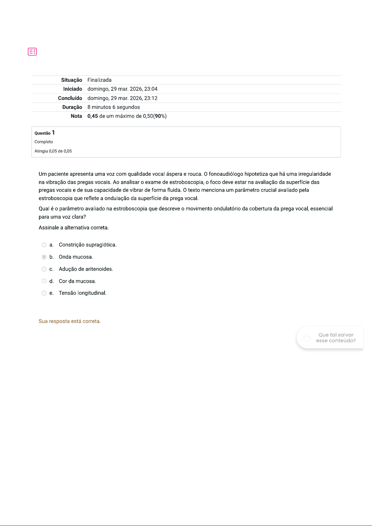 Situação Finalizada Iniciado domingo, 29 mar. 2026, 23:04 Concluído domingo, 29 mar. 2026, 23:12 Duração 8 minutos 6 segundos Nota 0,45 de um máximo de 0,50(90%) Questão 1 Completo Atingiu 0,05 de 0,05 Um paciente apresenta uma voz com qualidade vocal áspera e rouca. 0 fonoaudiólogo hipotetiza que há uma irregularidade na vibração das pregas vocais. Ao analisar o exame de estroboscopia, o foco deve estar na avaliação da superfície das pregas vocais e de sua capacidade de vibrar de forma fluida. 0 texto menciona um parâmetro crucial avaliado pela estroboscopia que reflete a ondulação da superfície da prega vocal. Qual é o parâmetro avaliado na estroboscopia que descreve o movimento ondulatório da cobertura da prega vocal, essencial para uma voz clara? Assinale a alternativa correta. a. Constrição supraglótica. b. Onda mucosa. Adução de aritenoides. d. Cor da mucosa. e. Tensão longitudinal. Sua resposta está correta. Que tal salvar esse conteúdo?Questão 2 Completo Atingiu 0,05 de 0,05 raciocínio clínico fonoaudiológico depende da correlação entre o que se ouve (sinal vocal) e o que acontece na fisiologia (evento laríngeo). Um paciente, fumante crônico de longa data e que também abusa da voz, apresenta uma qualidade vocal extremamente grave, "molhada" e "crepitante". fonoaudiólogo suspeita de uma lesão orgânico-funcional específica, fortemente associada ao tabagismo. Qual é a lesão orgânico-funcional que mais se correlaciona com essa descrição (voz muito grave e forte associação com tabagismo)? Assinale a alternativa correta. a. Pólipo Vocal. b. Presbifonia. C. Afonia de Conversão. d. Nódulos Vocais. e. Edema de Reinke. Sua resposta está correta. Questão 3 Completo Atingiu 0,05 de 0,05 Videolaringoscopia de Alta Velocidade (HSV) é apresentada na seção "Saiba Mais" como uma tecnologia promissora para a análise da vibração das pregas vocais. Diferente da estroboscopia, que cria uma ilusão de ótica e depende de uma voz periódica (regular), a HSV captura milhares de imagens reais por segundo. Segundo o texto, qual é a principal vantagem da Videolaringoscopia de Alta Velocidade (HSV) sobre a estroboscopia tradicional? Assinale a alternativa correta. a. Permite analisar a vibração real das pregas vocais mesmo em vozes muito irregulares ou aperiódicas, Que tal salvar estroboscopia falha. esse conteúdo? b. Permite ver a laringe sem a necessidade de introduzir nenhum endoscópio no paciente. Substitui completamente a necessidade de avaliação auditiva da voz pelo fonoaudiólogo. d. Utiliza luz estroboscópica para gerar imagens mais brilhantes e coloridas que a videolaringoscopia comum. e. É um exame muito mais barato e acessível, disponível na maioria das clínicas populares. Sua resposta está correta.Questão 4 Completo Atingiu 0,00 de 0,05 Esta é a categoria de disfonias mais frequente na clínica fonoaudiológica, ela começa como uma disfonia funcional (um comportamento de mau uso, como a hiperfunção). No entanto, a manutenção desse comportamento de fonotrauma por tempo prolongado acaba gerando uma reação no tecido das pregas vocais, levando ao surgimento de uma lesão benigna. Qual é a classificação correta para uma disfonia onde uma lesão benigna (como nódulo ou pólipo) foi causada pelo comportamento vocal inadequado? Assinale a alternativa correta. a. Disfonia Congênita. b. Disfonia Funcional Pura. Disfonia Orgânica Pura. d. Disfonia Orgânico-Funcional. e. Disfonia Psicossomática. Sua resposta está incorreta. Questão 5 Completo Atingiu 0,05 de 0,05 A atuação em equipe multidisciplinar é fundamental no cuidado da voz. fonoaudiólogo e o médico otorrinolaringologista possuem papéis distintos e complementares. Enquanto um foca na identificação da doença ou lesão estrutural, o outro foca no comportamento vocal e na reabilitação. De acordo com o texto, qual é a responsabilidade específica do fonoaudiólogo na equipe de voz, diferenciando-o do médico? Assinale a alternativa correta. a. Tratar as alergias e infecções das vias aéreas superiores que afetam a voz. b. Realizar os exames de laringoscopia e prescrever medicamentos para o tratamento da disfonia. Que tal salvar esse conteúdo? C. Definir a conduta cirúrgica para a remoção de lesões nas pregas vocais. d. Realizar o diagnóstico nosológico, identificando a presença de doenças e lesões como câncer ou papiloma. e. Realizar o diagnóstico funcional da voz, avaliando o comportamento vocal e interpretando a imagem sob a ótica da função. Sua resposta está correta.Questão 6 Completo Atingiu 0,05 de 0,05 A escolha do exame de imagem mais adequado depende do objetivo da avaliação. Um fonoaudiólogo recebe um cantor profissional que se queixa de falhas na voz apenas quando canta notas agudas em alta intensidade. Na fala habitual, a voz é normal. 0 fonoaudiólogo precisa sugerir ao médico um exame que permita visualizar a laringe especificamente durante a execução dessas tarefas musicais complexas, sem interferir na articulação. Considerando as características dos exames, qual seria o procedimento de escolha para avaliar esse cantor durante o canto? Assinale a alternativa correta. a. Tomografia de pescoço, para avaliar a estrutura interna dos músculos. b. Radiografia simples do pescoço, para ver a posição do osso hioide. Videolaringoscopia com endoscópio rígido, pois possui melhor qualidade de imagem, mesmo impedindo o canto. d. Laringoscopia indireta com espelho, pois é o método mais rápido e barato. e. Nasofibroscopia, pois permite a avaliação durante a fala encadeada e o canto natural. Sua resposta está correta. Questão 7 Completo Atingiu 0,05 de 0,05 Unidade III classifica as disfonias em grandes grupos. Um desses grupos é a disfonia orgânica, causada por uma alteração estrutural. Um tipo específico de disfonia orgânica é a presbifonia, que ocorre devido ao processo natural de envelhecimento da la