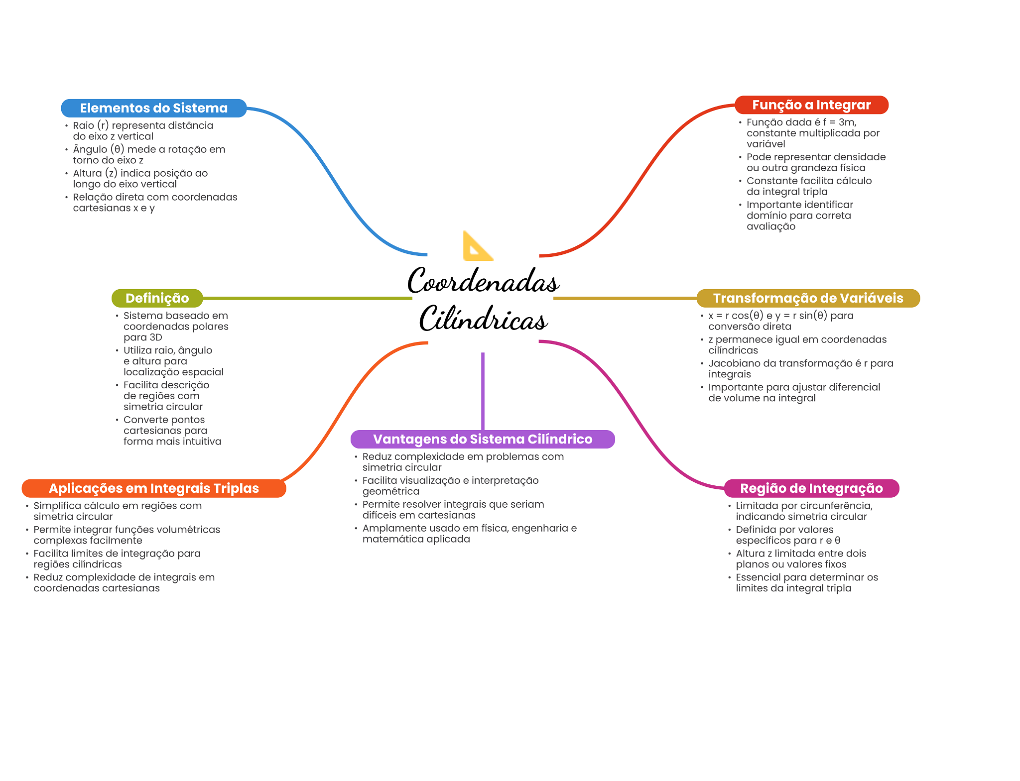 Elementos do Sistema Função a Integrar Raio (r) representa distância Função dada é f = 3m, do eixo Z vertical constante multiplicada por Ângulo mede a rotação em variável torno do eixo Z Pode representar densidade Altura (z) indica posição ao ou outra grandeza física longo do eixo vertical Constante facilita cálculo Relação direta com coordenadas da integral tripla cartesianas X e y Importante identificar domínio para correta avaliação Coordenadas Definição Transformação de Variáveis Sistema baseado em coordenadas polares Cilindricas X = r cos(Θ) = r para conversão direta para 3D Z permanece igual em coordenadas Utiliza raio, ângulo cilíndricas e altura para Jacobiano da transformação é r para localização espacial integrais Facilita descrição Importante para ajustar diferencial de regiões com de volume na integral simetria circular Converte pontos cartesianas para forma mais intuitiva Vantagens do Sistema Cilíndrico Reduz complexidade em problemas com simetria circular Facilita visualização e interpretação Aplicações em Integrais Triplas geométrica Região de Integração Simplifica cálculo em regiões com Permite resolver integrais que seriam Limitada por circunferência, simetria circular difíceis em cartesianas indicando simetria circular Permite integrar funções volumétricas Amplamente usado em física, engenharia e Definida por valores complexas facilmente matemática aplicada específicos para r e Facilita limites de integração para Altura Z limitada entre dois regiões cilíndricas planos ou valores fixos Reduz complexidade de integrais em Essencial para determinar coordenadas cartesianas limites da integral tripla