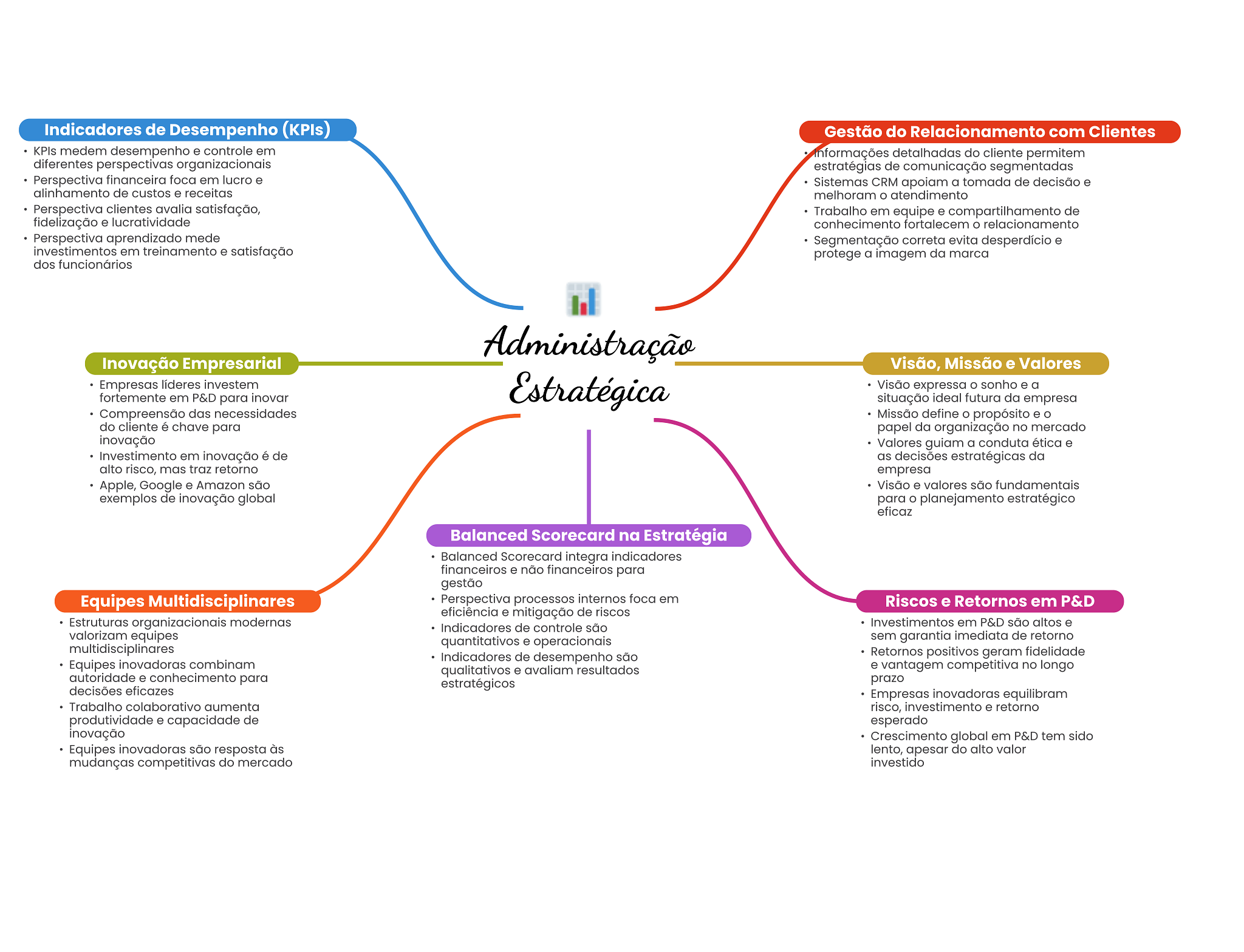 Indicadores de Desempenho Gestão do Relacionamento com Clientes KPIs medem desempenho e controle em detalhadas do cliente permitem diferentes perspectivas organizacionais estratégias de comunicação segmentadas Perspectiva financeira foca em lucro e Sistemas CRM apoiam a tomada de decisão e alinhamento de custos e receitas melhoram atendimento Perspectiva clientes avalia satisfação, Trabalho em equipe e compartilhamento de fidelização e lucratividade conhecimento fortalecem relacionamento Perspectiva aprendizado mede Segmentação correta evita desperdício e investimentos em treinamento e satisfação protege a imagem da marca dos funcionários Administração Inovação Empresarial Visão, Missão e Valores Empresas líderes investem fortemente em P&D para inovar Estratégica Visão expressa sonho e a situação ideal futura da empresa Compreensão das necessidades Missão define O propósito e O do cliente é chave para papel da organização no mercado inovação Valores guiam a conduta ética e Investimento em inovação é de as decisões estratégicas da alto risco, mas traz retorno empresa Apple, Google e Amazon são Visão e valores são fundamentais exemplos de inovação global para planejamento estratégico eficaz Balanced Scorecard na Estratégia Balanced Scorecard integra indicadores financeiros e não financeiros para gestão Equipes Multidisciplinares Perspectiva processos internos foca em Riscos e Retornos em P&D eficiência e mitigação de riscos Estruturas organizacionais modernas Indicadores de controle são Investimentos em P&D são altos e valorizam equipes quantitativos e operacionais sem garantia imediata de retorno multidisciplinares Indicadores de desempenho são Retornos positivos geram fidelidade Equipes inovadoras combinam qualitativos e avaliam resultados e vantagem competitiva no longo autoridade e conhecimento para estratégicos prazo decisões eficazes Empresas inovadoras equilibram Trabalho colaborativo aumenta risco, investimento e retorno produtividade e capacidade de esperado inovação Crescimento global em P&D tem sido Equipes inovadoras são resposta às lento, apesar do alto valor mudanças competitivas do mercado investido