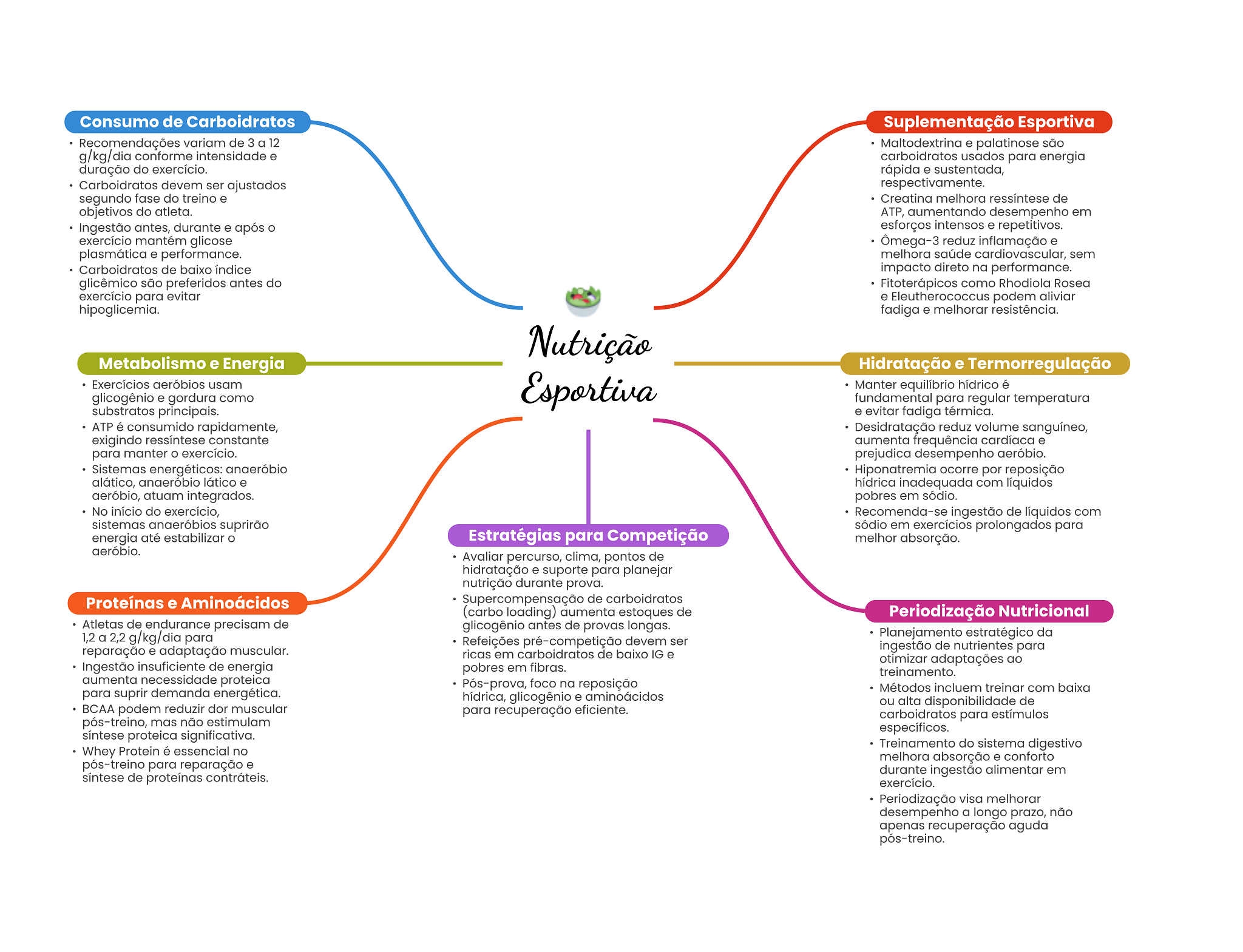 Consumo de Carboidratos Suplementação Esportiva Recomendações variam de 3 a 12 Maltodextrina e palatinose são g/kg/dia conforme intensidade e carboidratos usados para energia duração do exercício. rápida e sustentada, Carboidratos devem ser ajustados respectivamente. segundo fase do treino e Creatina melhora ressíntese de objetivos do atleta. ATP, aumentando desempenho em Ingestão antes, durante e após esforços intensos e repetitivos. exercício mantém glicose Ômega-3 reduz inflamação e plasmática e performance. melhora saúde cardiovascular, sem Carboidratos de baixo índice impacto direto na performance. glicêmico são preferidos antes do Fitoterápicos como Rhodiola Rosea exercício para evitar e Eleutherococcus podem aliviar hipoglicemia. fadiga e melhorar resistência. Nutrição Metabolismo e Energia Hidratação e Termorregulação Exercícios aeróbios usam Esportiva Manter equilíbrio hídrico é glicogênio e gordura como fundamental para regular temperatura substratos principais. e evitar fadiga térmica. ATP é consumido rapidamente, Desidratação reduz volume sanguíneo, exigindo ressíntese constante aumenta frequência cardíaca e para manter exercício. prejudica desempenho aeróbio. Sistemas energéticos: anaeróbio Hiponatremia ocorre por reposição alático, anaeróbio lático e hídrica inadequada com líquidos aeróbio, atuam integrados. pobres em sódio. No início do exercício, Recomenda-se ingestão de líquidos com sistemas anaeróbios suprirão sódio em exercícios prolongados para energia até estabilizar Estratégias para Competição melhor absorção. aeróbio. Avaliar percurso, clima, pontos de hidratação e suporte para planejar nutrição durante prova. Proteínas e Aminoácidos Supercompensação de carboidratos (carbo loading) aumenta estoques de Periodização Nutricional Atletas de endurance precisam de glicogênio antes de provas longas. 1,2 a 2,2 g/kg/dia para Planejamento estratégico da Refeições pré-competição devem ser reparação e adaptação muscular. ingestão de nutrientes para ricas em carboidratos de baixo IG e otimizar adaptações ao Ingestão insuficiente de energia pobres em fibras. treinamento. aumenta necessidade proteica Pós-prova, foco na reposição para suprir demanda energética. Métodos incluem treinar com baixa hídrica, glicogênio e aminoácidos ou alta disponibilidade de BCAA podem reduzir dor muscular para recuperação eficiente. carboidratos para estímulos pós-treino, mas não estimulam específicos. síntese proteica significativa. Treinamento do sistema digestivo Whey Protein é essencial no melhora absorção e conforto pós-treino para reparação e durante ingestão alimentar em síntese de proteínas contráteis. exercício. Periodização visa melhorar desempenho a longo prazo, não apenas recuperação aguda pós-treino.