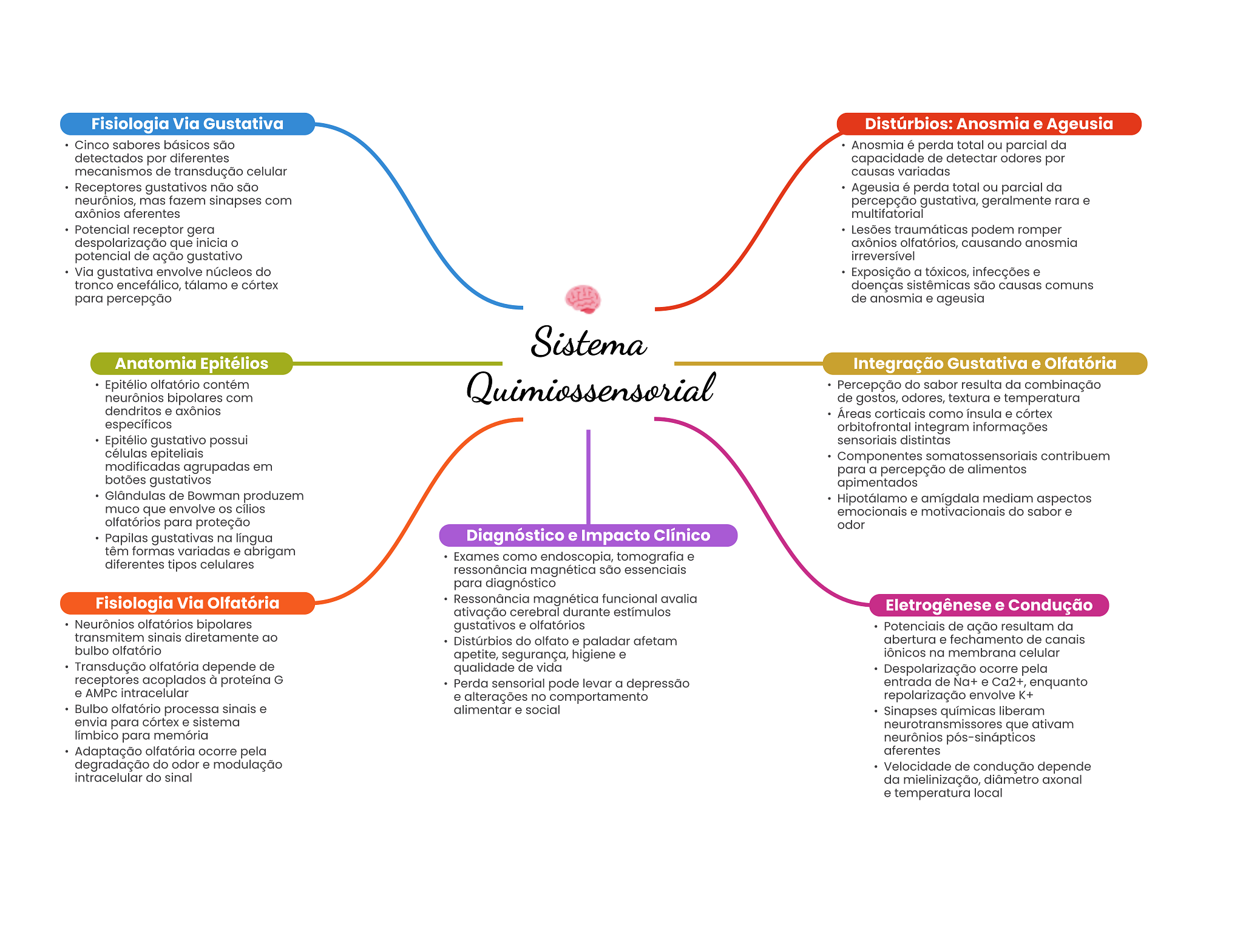 Fisiologia Via Gustativa Distúrbios: Anosmia e Ageusia Cinco sabores básicos são Anosmia é perda total ou parcial da detectados por diferentes capacidade de detectar odores por mecanismos de transdução celular causas variadas Receptores gustativos não são Ageusia é perda total ou parcial da neurônios, mas fazem sinapses com percepção gustativa, geralmente rara e axônios aferentes multifatorial Potencial receptor gera Lesões traumáticas podem romper despolarização que inicia axônios olfatórios, causando anosmia potencial de ação gustativo irreversível Via gustativa envolve núcleos do Exposição a tóxicos, infecções e tronco encefálico, tálamo e córtex doenças sistêmicas são causas comuns para percepção de e ageusia Sistema Anatomia Epitélios Integração Gustativa e Olfatória Epitélio olfatório contém neurônios bipolares com Quimiossensorial Percepção do sabor resulta da combinação de gostos, odores, textura e temperatura dendritos e axônios Áreas corticais como ínsula e córtex específicos orbitofrontal integram informações Epitélio gustativo possui sensoriais distintas células epiteliais Componentes somatossensoriais contribuem modificadas agrupadas em para a percepção de alimentos botões gustativos apimentados Glândulas de Bowman produzem Hipotálamo e amígdala mediam aspectos muco que envolve OS cílios emocionais e motivacionais do sabor e olfatórios para proteção odor Papilas gustativas na língua Diagnóstico e Impacto Clínico têm formas variadas e abrigam Exames como endoscopia, tomografia e diferentes tipos celulares ressonância magnética são essenciais para diagnóstico Fisiologia Via Olfatória Ressonância magnética funcional avalia ativação cerebral durante estímulos Eletrogênese e Condução Neurônios olfatórios bipolares gustativos e olfatórios Potenciais de ação resultam da transmitem sinais diretamente ao Distúrbios do olfato e paladar afetam abertura e fechamento de canais bulbo olfatório apetite, segurança, higiene e iônicos na membrana celular Transdução olfatória depende de qualidade de vida Despolarização ocorre pela receptores acoplados à proteína G Perda sensorial pode levar a depressão entrada de Na+ e Ca2+, enquanto e AMPc intracelular e alterações no comportamento repolarização envolve K+ Bulbo olfatório processa sinais e alimentar e social Sinapses químicas liberam envia para córtex e sistema neurotransmissores que ativam límbico para memória neurônios pós-sinápticos Adaptação olfatória ocorre pela aferentes degradação do odor e modulação Velocidade de condução depende intracelular do sinal da mielinização, diâmetro axonal e temperatura local