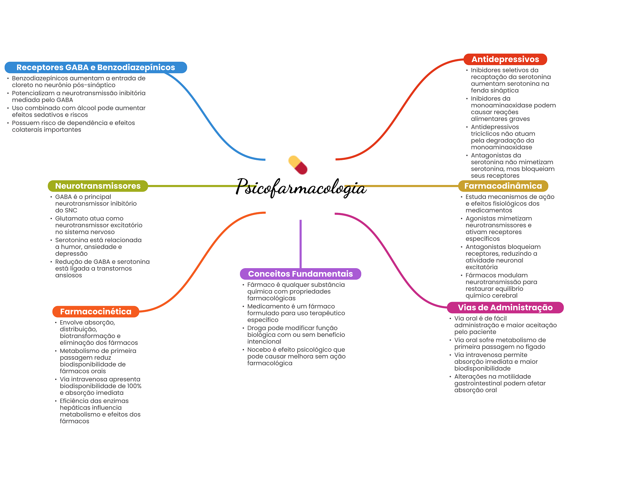 Antidepressivos Receptores GABA e Benzodiazepínicos Inibidores seletivos da Benzodiazepínicos aumentam a entrada de recaptação da serotonina cloreto no neurônio pós-sináptico aumentam serotonina na Potencializam a neurotransmissão inibitória fenda sináptica mediada pelo GABA Inibidores da Uso combinado com álcool pode aumentar monoaminaoxidase podem efeitos sedativos e riscos causar reações alimentares graves Possuem risco de dependência e efeitos colaterais importantes Antidepressivos tricíclicos não atuam pela degradação da monoaminaoxidase Antagonistas da serotonina não mimetizam serotonina, mas bloqueiam seus receptores Neurotransmissores Psicofarmacologia Farmacodinâmica GABA é O principal Estuda mecanismos de ação neurotransmissor inibitório e efeitos fisiológicos dos do SNC medicamentos Glutamato atua como Agonistas mimetizam neurotransmissor excitatório neurotransmissores e no sistema nervoso ativam receptores Serotonina está relacionada específicos a humor, ansiedade e Antagonistas bloqueiam depressão receptores, reduzindo a Redução de GABA e serotonina atividade neuronal está ligada a transtornos excitatória ansiosos Conceitos Fundamentais Fármacos modulam Fármaco é qualquer substância neurotransmissão para química com propriedades restaurar equilíbrio farmacológicas químico cerebral Medicamento é um fármaco Farmacocinética Vias de Administração formulado para uso terapêutico Envolve absorção, específico Via oral é de fácil distribuição, Droga pode modificar função administração e maior aceitação biológica com ou sem benefício pelo paciente biotransformação e eliminação dos fármacos intencional Via oral sofre metabolismo de Nocebo é efeito psicológico que primeira passagem no fígado Metabolismo de primeira passagem reduz pode causar melhora sem ação Via intravenosa permite biodisponibilidade de farmacológica absorção imediata e maior fármacos orais biodisponibilidade Via intravenosa apresenta Alterações na motilidade biodisponibilidade de 100% gastrointestinal podem afetar e absorção imediata absorção oral Eficiência das enzimas hepáticas influencia metabolismo e efeitos dos fármacos