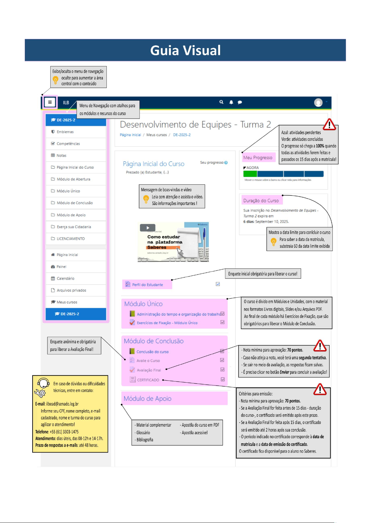 Guia do Estudante – ILB EaD O objetivo deste guia é aproximar você da realidade da Educação a Distância do Instituto Legislativo Brasileiro – ILB, apresentando os principais recursos e características do nosso Ambiente Virtual de Aprendizagem – AVA: a plataforma Saberes. Informações essenciais As orientações presentes neste guia são aplicáveis aos cursos on-line sem tutoria. Considerando que nessa modalidade de oferta não existem atividades síncronas (em tempo real) ou a figura de um professor, facilitador de aprendizagem ou tutor, você possui liberdade para organizar seu próprio horário de estudos. Para auxiliar você a estabelecer uma programação que atenda às suas necessidades, destacamos de início algumas regras da plataforma Saberes, que serão reforçadas mais adiante: • Acesso ao curso: será garantido pelo período máximo de 60 (sessenta) dias, contados da data da matrícula. • Quantidade máxima de cursos simultâneos: até 2 (dois) cursos. • Nota necessária para aprovação no curso: no mínimo 70 (setenta) pontos na Avaliação Final. Caso não consiga nota suficiente na primeira tentativa, será garantida uma segunda oportunidade, definitiva. • Cenários possíveis: 1) Aprovação – ocorrerá se os critérios para emissão do certificado de conclusão forem cumpridos; 2) Abandono – ocorrerá se o prazo máximo de acesso ao curso acabar sem aprovação ou reprovação; e 3) Reprovação – ocorrerá se não for atingida a nota necessária para aprovação no curso nas duas oportunidades disponibilizadas. • Critérios para emissão do certificado de conclusão: 1) atingir a nota necessária para aprovação no curso; e 2) completar o mínimo de 15 (quinze) dias de matrícula no curso. Cumpridas essas duas condições, seu certificado deverá ser emitido em até 2 (duas) horas. • Período indicado no certificado de conclusão: o dia de matrícula será a data de início, e o dia de emissão do certificado será a data de conclusão do curso. • Punições: no caso de Abandono ou Reprovação, a vaga ocupada pelo curso não concluído ficará bloqueada pelos 60 (sessenta) dias de duração regular, mais o período adicional de 30 (trinta) dias. Além disso, caso tenha interesse em se matricular no mesmo curso novamente, será necessário aguardar pela próxima Turma. • Cancelamento de matrícula: não é possível cancelar a matrícula em cursos on-line sem tutoria. Navegando no AVA Saberes Ao entrar no curso, você estará no AVA Saberes, composto pelos seguintes elementos principais: Página do Curso A página do curso é o espaço virtual onde ficam os conteúdos, atividades e recursos. É a sua sala de aula online, onde você encontra tudo o que precisa para acompanhar o aprendizado. Ela é composta por: • Nome do curso – exibido no topo. • Página inicial do curso – área central, com orientações e recursos. • Meu Progresso – barra à direita que mostra o andamento das suas atividades. • Duração do curso – também à direita, exibe a data limite para conclusão. • Menu de Navegação – à esquerda, com atalhos para módulos e recursos. Página Inicial do Curso Na página inicial você encontrará: • Mensagem de boas-vindas. • O Guia do Estudante – este documento. • Perfil do Estudante – uma enquete inicial obrigatória para liberar o curso. Após preencher o Perfil do Estudante, encontrará também: • Mural de Aviso – canal de comunicação da coordenação com os alunos. • Requisitos de Navegação – dicas para configurar seu navegador. • Netiqueta – orientações de boa convivência no ambiente virtual. • Suporte Técnico – informações de contato com a equipe de suporte. Menu de Navegação O menu lateral traz atalhos para os módulos e recursos do curso. Ele pode ser ocultado ou exibido clicando no botão no alto, à esquerda. A organização padrão dos cursos é: 1. Página Inicial do Curso 2. Módulo de Abertura 3. Módulos de Conteúdo 4. Módulo de Conclusão 5. Módulo de Apoio Meu Progresso Ajuda você a visualizar em que parte do curso está. • Verde: atividades concluídas. • Azul: atividades pendentes. Atenção! O progresso do curso só alcança 100% quando todas as condições para a conclusão do curso são atendidas: a realização de todas as atividades obrigatórias e o cumprimento do prazo mínimo de 15 dias de permanência. Duração do Curso Mostra a data limite para concluir o curso. Dica Para saber a data da matrícula, basta subtrair 60 dias da data limite exibida. Atenção! • Após 60 dias da matrícula, o acesso ao curso é bloqueado. • Você pode estar matriculado em até dois cursos ao mesmo tempo, ou seja, conta com duas vagas para uso simultâneo. • O prazo máximo para concluir cada curso é de 60 dias. • Caso não conclua dentro desse prazo ou seja reprovado, a vaga permanecerá suspensa por mais 30 dias além da data limite. • Quando o aluno é aprovado, a vaga é liberada automaticamente após a emissão do certificado e você já pode se inscrever em outro curso. • Não é permitido se inscrever novamente na mesma turma para refazer um curso; é necessário aguardar a abertura de nova turma. • O cancelamento de matrícula é expressamente proibido. • A plataforma Saberes segue o horário de Brasília. Módulo de Abertura • Mensagem da Coordenação – boas-vindas e orientações. • Apresentação do Curso – informações sobre carga horária, conteúdo e objetivos. • Diário – espaço pessoal para anotações durante os estudos. • Duração do Curso – lembrete sobre prazos e consequências do abandono. Módulos de Conteúdo Os cursos são autoinstrucionais (sem tutoria). Você é responsável pelo seu próprio ritmo de aprendizagem. Cada curso é dividido em Módulos e Unidades, com materiais em formato de: • Livros digitais • Slides • Videoaulas • Arquivos PDF Na maioria dos cursos, ao final de c