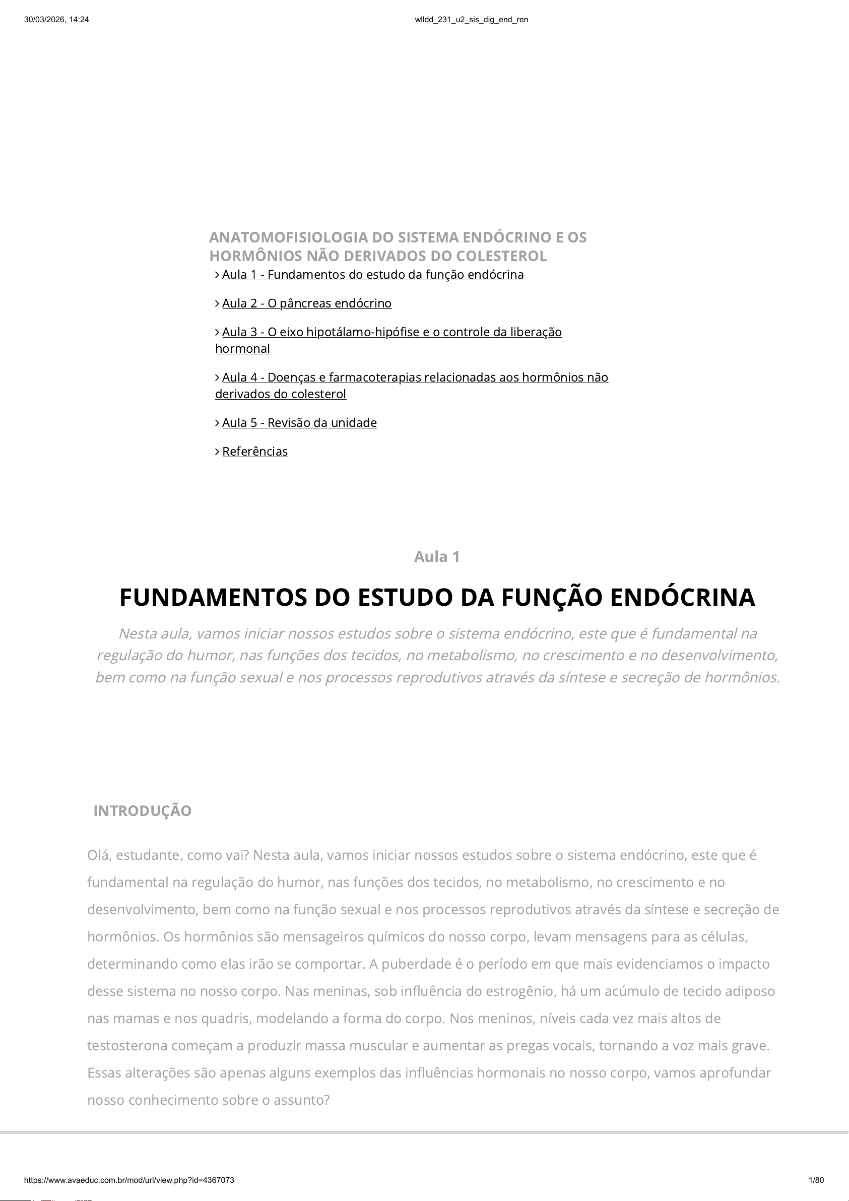 Imprimir INTRODUÇÃO Olá, estudante, como vai? Nesta aula, vamos iniciar nossos estudos sobre o sistema endócrino, este que é fundamental na regulação do humor, nas funções dos tecidos, no metabolismo, no crescimento e no desenvolvimento, bem como na função sexual e nos processos reprodutivos através da síntese e secreção de hormônios. Os hormônios são mensageiros químicos do nosso corpo, levam mensagens para as células, determinando como elas irão se comportar. A puberdade é o período em que mais evidenciamos o impacto desse sistema no nosso corpo. Nas meninas, sob influência do estrogênio, há um acúmulo de tecido adiposo nas mamas e nos quadris, modelando a forma do corpo. Nos meninos, níveis cada vez mais altos de testosterona começam a produzir massa muscular e aumentar as pregas vocais, tornando a voz mais grave. Essas alterações são apenas alguns exemplos das influências hormonais no nosso corpo, vamos aprofundar nosso conhecimento sobre o assunto? Aula 1 FUNDAMENTOS DO ESTUDO DA FUNÇÃO ENDÓCRINA Nesta aula, vamos iniciar nossos estudos sobre o sistema endócrino, este que é fundamental na regulação do humor, nas funções dos tecidos, no metabolismo, no crescimento e no desenvolvimento, bem como na função sexual e nos processos reprodutivos através da síntese e secreção de hormônios. ANATOMOFISIOLOGIA DO SISTEMA ENDÓCRINO E OS HORMÔNIOS NÃO DERIVADOS DO COLESTEROL Aula 1 - Fundamentos do estudo da função endócrina Aula 2 - O pâncreas endócrino Aula 3 - O eixo hipotálamo-hipófise e o controle da liberação hormonal Aula 4 - Doenças e farmacoterapias relacionadas aos hormônios não derivados do colesterol Aula 5 - Revisão da unidade Referências 30/03/2026, 14:24 wlldd_231_u2_sis_dig_end_ren https://www.avaeduc.com.br/mod/url/view.php?id=4367073 1/80 INTRODUÇÃO AO SISTEMA ENDÓCRINO O sistema endócrino é considerado um conjunto de células e glândulas responsáveis pela secreção de hormônios, exercendo controle químico sobre o corpo humano por meio da manutenção da homeostase. Os sistemas nervoso e endócrino atuam juntos para coordenar funções de todos os sistemas do corpo, as glândulas endócrinas são reguladas pelo sistema nervoso, ou por outras glândulas endócrinas, formando um mecanismo de inter-relação. O corpo contém dois tipos diferentes de glândulas: as endócrinas e as exócrinas. As glândulas exócrinas possuem ductos tubulares que conduzem as secreções glandulares para cavidades corporais, para o lúmen de um órgão, ou para a superfície externa no corpo, como as glândulas sudoríparas, sebáceas, mucosas e digestivas. O sistema endócrino é constituído por glândulas sem ductos, denominadas glândulas endócrinas, que secretam seus produtos, os hormônios, no líquido intersticial que as circunda e se difundem para o sangue. O sangue circulante transporta esses hormônios para os órgãos correspondentes para que seus efeitos sejam vistos como respostas específicas. Tanto os neurotransmissores, quanto os hormônios exercem seus efeitos ligando-se a receptores encontrados em suas células-alvo, os receptores das células-alvo podem estar localizados na superfície celular ou no citoplasma e no núcleo. As glândulas endócrinas incluem: glândulas pituitárias (hipófise), pineal, tireoide, paratireoides, suprarrenais (ou adrenais) e as ilhotas de Langerhans (pâncreas). Além das glândulas com funções endócrinas, vários órgãos e tecidos secretam hormônios como função secundária, como o hipotálamo, timo, rins, estômago, fígado, intestino delgado, pele, coração, tecido adiposo, testículos nos homens e ovários e placenta nas mulheres (Figura 1). Vamos conhecer agora as principais glândulas endócrinas e os hormônios liberados por elas. Figura 1 | Localização das glândulas endócrinas e órgãos que contêm células endócrinas 30/03/2026, 14:24 wlldd_231_u2_sis_dig_end_ren https://www.avaeduc.com.br/mod/url/view.php?id=4367073 2/80 Fonte: Tortora e Derrickson (2019, p. 620). Principais glândulas endócrinas A hipófise, também chamada de glândula pituitária, é uma pequena glândula, localizada na base do encéfalo, exatamente abaixo do hipotálamo, formada por duas porções: hipófise anterior ou adeno-hipófise e hipófise posterior ou neuro-hipófise. Alguns de seus hormônios produzidos afetam as funções de muitas outras glândulas endócrinas como os testículos, os ovários, o córtex adrenal e a glândula tireoide (Quadro 1). Quadro 1 - Lorem ipsum dolor sit amet Hormônio Tecido-alvo Principais ações Hormônios da adeno-hipófise Hormônio do crescimento (GH) Fígado e outros tecidos Estimula o crescimento corporal e a reprodução celular. Hormônio tireoestimulante (TSH) Glândula tireoide Estimula a síntese e a secreção de hormônios pela glândula tireoide. 30/03/2026, 14:24 wlldd_231_u2_sis_dig_end_ren https://www.avaeduc.com.br/mod/url/view.php?id=4367073 3/80 Hormônio Tecido-alvo Principais ações Hormônio foliculoestimulante (FSH) Ovários e testículos Nas mulheres, inicia o desenvolvimento de ovócitos e induz à ovulação; nos homens estimula a produção de espermatozoides. Hormônio luteinizante (LH) Ovários e testículos Nas mulheres, estimula a secreção de progesterona e estrogênios; nos homens estimula a produção de testosterona. Prolactina (PRL) Glândulas mamárias Junto com outros hormônios, promove a liberação de leite. Hormônio adrenocorticotrófico (ACTH) Córtex da glândula suprarrenal Estimula a secreção de cortisol. Hormônios da neuro-hipófise Ocitocina (OT) Útero e glândulas mamárias Estimula a contração das células musculares lisas do útero durante o parto; estimula a contração de células nas glândulas mamárias para promover a ejeção de leite. Hormônio antidiurético (ADH) Rins, glândulas sudoríparas, arteríolas Conserva a água corporal por meio da diminuição do volume de urina