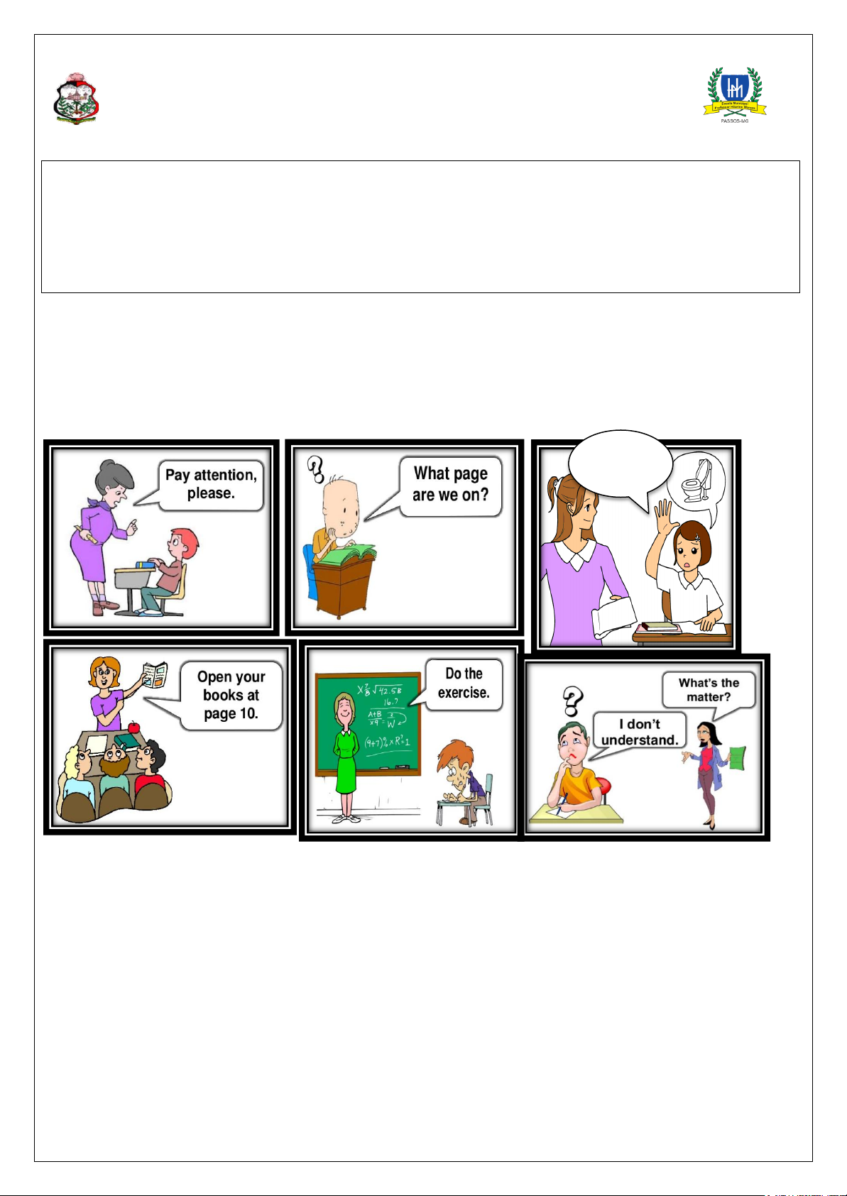 PREFEITURA MUNICIPAL DE PASSOS SECRETARIA MUNICIPAL DE EDUCAÇÃO – SME ENSINO FUNDAMENTAL – 5º ANO ORIENTAÇÕES PEDAGÓGICAS Hello, students! Nesta semana, vamos matar a saudade que estamos da nossa escola, relembrando a rotina que vivemos dentro da sala de aula. Vamos aprender algumas frases que usamos e repetimos várias vezes durante o ano letivo quando estamos na escola. CLASSROOM LANGUAGE Google imagens Quem se lembra da professora pedindo para você prestar atenção (Pay attention, please.) E você? Quantas vezes já perguntou ao seu professor qual página estava a atividade? (What page are we on?) No início da aula, a professora pedindo para abrir os livros em uma determinada página. (Open your books at page 10), em seguida pedindo para responder o exercício (Do the exercise). E os alunos pedindo para ir ao banheiro (May I go to the restroom?). E quando bate aquela dúvida, a professora pergunta o que aconteceu (What 's the matter?) e você diz que não entendeu a matéria (I don’t understand). Tenho certeza de que estão com muitas saudades de falar e ouvir essas frases. Escola Municipal Professor Hilarino Moraes EXTRA ACTIVITY – 2026 Aluno(a): _____________________________________________ __º Ano. Turma: ____ Professor (a): TEACHER LAURA/TEACHER SAM™ Pedagogo: _________ Data: ___ /____/ 2026. Componente Curricular: LÍNGUA INGLESA Can I go to the restroom? Vamos aprender alguns verbos que usamos bastante na sala de aula. ATIVIDADES 1) Observe as figuras e escreva a expressão correta para cada situação. __________________ ___________________ ___________________ __________________ _ __________________ ___________________ ___________________ __________________ __________________ ___________________ ___________________ __________________ READ – LER TALK- FALAR OPEN- ABRIR STUDY- ESTUDAR LOOK- OLHAR WRITE- ESCREVER CLOSE- FECHAR STAND UP- LEVANTAR-SE LISTEN- OUVIR ANSWER- RESPONDER SIT DOW- SENTAR TURN ON- LIGAR WORK- TRABALHAR COPY- COPIAR PAY ATTENTION-PRESTAR ATENÇÃO TURN OFF-DESLIGAR BE QUIET OPEN THE DOOR CLOSE YOUR BOOK CLEAN THE BOARD WRITE CLOSE THE WINDOW READ STAND UP LISTEN TO YOUR TEACHER SIT DOWN TURN ON THE LIGHTS