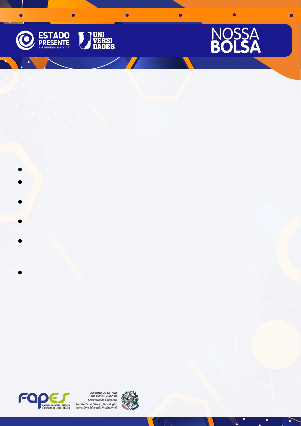 NOSSA BOLSA NOSSA BOLSA NOSSA BOLSA NOSSA BOLSA NOSSA BOLSA NOSSA BOLSA NOSSA BOLSA PARA CONCORRER A UMA BOLSA VOCÊ PRECISA: 1) Ter realizado uma prova do Enem entre 2021 a 2025 (Não será permitida a participação de treineiros) 2) Morar no Espírito Santo 3) Cumprir um dos requisitos abaixo: - Ter cursado todo o Ensino Médio em escola pública localizada no estado do Espírito Santo; - Ter cursado completamente o Ensino Médio em instituição privada, na condição de bolsista integral, localizada no estado do Espírito Santo; - Ter cursado o Ensino Médio parcialmente em escola da rede pública e parcialmente em instituição privada, na condição de bolsista integral, localizada no Espírito Santo; - Ter concluído curso técnico em um dos Centros Estaduais de Educação Técnica (CEETs) no Espírito Santo; - Ter cursado o Ensino Médio e/ou Curso Técnico nas Escolas do Movimento de Educação Promocional do Espírito Santo (Mepes). 4) Ter grupo familiar com renda per capita de até: - Dois salários mínimos vigente em 2025. 20 25 -P 50 60 0 - E -D O C S - D O C U M E N T O O R IG IN A L 02 /1 2/ 20 25 1 4: 38 P Á G IN A 1 / 51 Lançamento do Edital 02 de dezembro de 2025 Período para inscrição (item 4 do Edital) 02 de dezembro de 2025, às 9:00 até às 23 horas e 59 minutos do dia 19 de janeiro de 2026 Primeira Chamada (comprovação na IES) 23 a 29 de janeiro de 2026 Divulgação da lista da Primeira Chamada 22 de janeiro de 2026 Registro da aprovação ou reprovação pela IES 23 a 30 de janeiro de 2026 Divulgação da lista da Segunda Chamada 3 de fevereiro de 2026 Registro da aprovação ou reprovação pela IES 4 a 11 de fevereiro de 2026 Divulgação do Quadro de Vagas para Lista de Espera 24 de fevereiro de 2026 Divulgação da lista de espera 04 de março de 2026 Registro da aprovação ou reprovação pela IES 05 a 20 de março de 2026 Segunda Chamada (comprovação na IES) 4 a 10 de fevereiro de 2026 Prazo final para a IES informar cursos que não formaram turma 12 de fevereiro de 2026 Manifestação de interesse na Lista de Espera 25 de fevereiro de 2026 até 02 de março de 2026 Lista de Espera -período de comprovar as informações na IES 05 a 17 de março de 2026 1 2 7 3 4 6 8 5 9 10 11 12 14 13 NOSSA BOLSA NOSSA BOLSA NOSSA BOLSA NOSSA BOLSA NOSSA BOLSA NOSSA BOLSA NOSSA BOLSA 20 25 -P 50 60 0 - E -D O C S - D O C U M E N T O O R IG IN A L 02 /1 2/ 20 25 1 4: 38 P Á G IN A 2 / 51 1 EDITAL FAPES Nº 26/2025 PROGRAMA NOSSA BOLSA – 1º Semestre PROCESSO FAPES Nº 2025-ZXV07 Chamada para a seleção de bolsistas do Programa Nossa Bolsa para o primeiro semestre do Ano Letivo de 2026 nos termos aqui estabelecidos. A Fundação de Amparo à Pesquisa e Inovação do Espírito Santo - FAPES, pessoa jurídica de direito público vinculada à Secretaria da Ciência, Tecnologia, Inovação e Educação Profissional – SECTI, com o apoio financeiro da Secretaria da Educação – SEDU e conforme Processo E-Docs nº 2025-ZXV07, torna público o presente Edital e convida os interessados que realizaram o Exame Nacional do Ensino Médio (ENEM) entre 2021 a 2025 a se candidatarem às bolsas de graduação ofertadas pelo Programa Nossa Bolsa visando o ingresso no Ano Letivo de 2026 – 1º Semestre. 1. Do Contexto O Programa Nossa Bolsa, criado pelo Governo do Estado do Espírito Santo por meio da Lei nº 9.263/2009 e regulamentado pelo Decreto nº 4181-R/17, tem como objetivo promover a inclusão e o desenvolvimento social e educacional por intermédio do conhecimento, concedendo bolsas a estudantes que desejam cursar a graduação em Instituições de Ensino Superior – IES privadas do estado do Espírito Santo sem condições de custear o estudo. 2. Cronograma ATIVIDADE PRAZO Lançamento do Edital 02 de dezembro de 2025 Período para inscrição (item 4 do Edital) 02 de dezembro de 2025, às 9:00 até às 23 horas e 59 minutos do dia 19 de janeiro de 2026 Divulgação da lista dos CANDIDATOS pré- selecionados para a Primeira Chamada 22 de janeiro de 2026 20 25 -P 50 60 0 - E -D O C S - D O C U M E N T O O R IG IN A L 02 /1 2/ 20 25 1 4: 38 P Á G IN A 3 / 51 https://fapes.es.gov.br/Media/fapes/Lista%20de%20Arquivos/Leis/LEI_N_9.263_08_julho_2009.pdf https://fapes.es.gov.br/Media/fapes/Lista%20de%20Arquivos/Leis/LEI_N_9.263_08_julho_2009.pdf https://fapes.es.gov.br/Media/fapes/Importacao/Decreto%20Regulamentar%20N%204181.R%2012.12.2017.pdf 2 Primeira Chamada (período de comparecimento para comprovação das informações na IES) 23 a 29 de janeiro de 2026 Período para registro da aprovação ou reprovação do CANDIDATO pela IES 23 a 30 de janeiro de 2026 Divulgação da lista dos CANDIDATOS pré- selecionados para a Segunda Chamada 3 de fevereiro de 2026 Segunda Chamada (período de comparecimento para comprovação das informações na IES) 4 a 10 de fevereiro de 2026 Período para registro da aprovação ou reprovação do CANDIDATO pela IES 4 a 11 de fevereiro de 2026 Prazo final para a IES informar os cursos que não formaram turma 12 de fevereiro de 2026 Divulgação do Quadro de Vagas para Lista de Espera 24 de fevereiro de 2026 Período para manifestação de interesse dos CANDIDATOS na Lista de Espera 25 de fevereiro de 2026 até 02 de março de 2026 Divulgação da lista de espera 04 de março de 2026 Período para as IES convocarem os CANDIDATOS da Lista de Espera para comprovação das informações na IES 05 a 17 de março de 2026 Período para registro da aprovação ou reprovação do CANDIDATO pela IES 05 a 20 de março de 2026 Período para submissão de recursos administrativos 18 a 24 de março de 2026 3. Dos Requisitos para Participação Para concorrerem às bolsas, os candidatos devem preencher requisitos mínimos, respeitando as disposições da legislação 9.263/2009, bem como as disposições da Resoluções nº 17, de 31 de outubro de 2019, do Comitê Gestor do Programa Nossa Bolsa, sem prejuízo das demais regras estabelecidas neste Ed