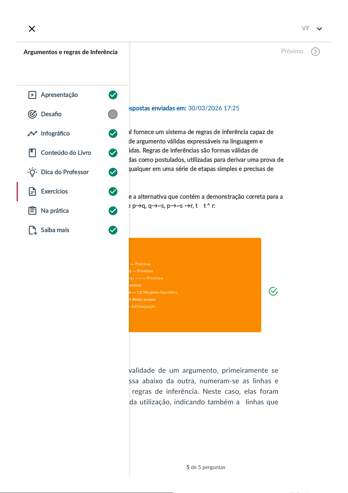 Exercícios Respostas enviadas em: 30/03/2026 17:25 5. O cálculo proposicional fornece um sistema de regras de inferência capaz de gerar todas as formas de argumento válidas expressáveis na linguagem e somente as formas válidas. Regras de inferências são formas válidas de argumento, apresentadas como postulados, utilizadas para derivar uma prova de um argumento válido qualquer em uma série de etapas simples e precisas de raciocínio. Sabendo disso, assinale a alternativa que contém a demonstração correta para a validade do argumento p→q, q→~s, p→~s →r, t├ t ˄ r: Você acertou! A. Ao demonstrar a validade de um argumento, primeiramente se coloca uma premissa abaixo da outra, numeram-se as linhas e depois utilizam-se regras de inferência. Neste caso, elas foram nomeadas após cada utilização, indicando também as linhas que foram usadas. 5 de 5 perguntas Anterior Próximo Argumentos e regras de Inferência Apresentação Desafio Infográfico Conteúdo do Livro Dica do Professor Exercícios Na prática Saiba mais VF Vê-se que todas as regras de inferência foram utilizadas de maneira correta até chegar à conclusão. Logo, o argumento é válido. Resposta incorreta. B. Ao demonstrar a validade de um argumento, primeiramente se coloca uma premissa abaixo da outra, numeram-se as linhas e depois utilizam-se regras de inferência. Neste caso, elas foram nomeadas após cada utilização, indicando também as linhas que foram usadas. 5 de 5 perguntas Anterior Próximo Argumentos e regras de Inferência Apresentação Desafio Infográfico Conteúdo do Livro Dica do Professor Exercícios Na prática Saiba mais VF Vê-se que todas as regras de inferência foram utilizadas de maneira correta até chegar à conclusão. Logo, o argumento é válido. Resposta incorreta. C. Ao demonstrar a validade de um argumento, primeiramente se coloca uma premissa abaixo da outra, numeram-se as linhas e depois utilizam-se regras de inferência. Neste caso, elas foram nomeadas após cada utilização, indicando também as linhas que foram usadas. 5 de 5 perguntas Anterior Próximo Argumentos e regras de Inferência Apresentação Desafio Infográfico Conteúdo do Livro Dica do Professor Exercícios Na prática Saiba mais VF Vê-se que todas as regras de inferência foram utilizadas de maneira correta até chegar à conclusão. Logo, o argumento é válido. Resposta incorreta. D. Ao demonstrar a validade de um argumento, primeiramente se coloca uma premissa abaixo da outra, numeram-se as linhas e depois utilizam-se regras de inferência. Neste caso, elas foram nomeadas após cada utilização, indicando também as linhas que foram usadas. 5 de 5 perguntas Anterior Próximo Argumentos e regras de Inferência Apresentação Desafio Infográfico Conteúdo do Livro Dica do Professor Exercícios Na prática Saiba mais VF Vê-se que todas as regras de inferência foram utilizadas de maneira correta até chegar à conclusão. Logo, o argumento é válido. Resposta incorreta. E. Ao demonstrar a validade de um argumento, primeiramente se coloca uma premissa abaixo da outra, numeram-se as linhas e depois utilizam-se regras de inferência. Neste caso, elas foram nomeadas após cada utilização, indicando também as linhas que foram usadas. 5 de 5 perguntas Anterior Próximo Argumentos e regras de Inferência Apresentação Desafio Infográfico Conteúdo do Livro Dica do Professor Exercícios Na prática Saiba mais VF Vê-se que todas as regras de inferência foram utilizadas de maneira correta até chegar à conclusão. Logo, o argumento é válido. Voltar 5 de 5 perguntas Anterior Próximo Argumentos e regras de Inferência Apresentação Desafio Infográfico Conteúdo do Livro Dica do Professor Exercícios Na prática Saiba mais VF