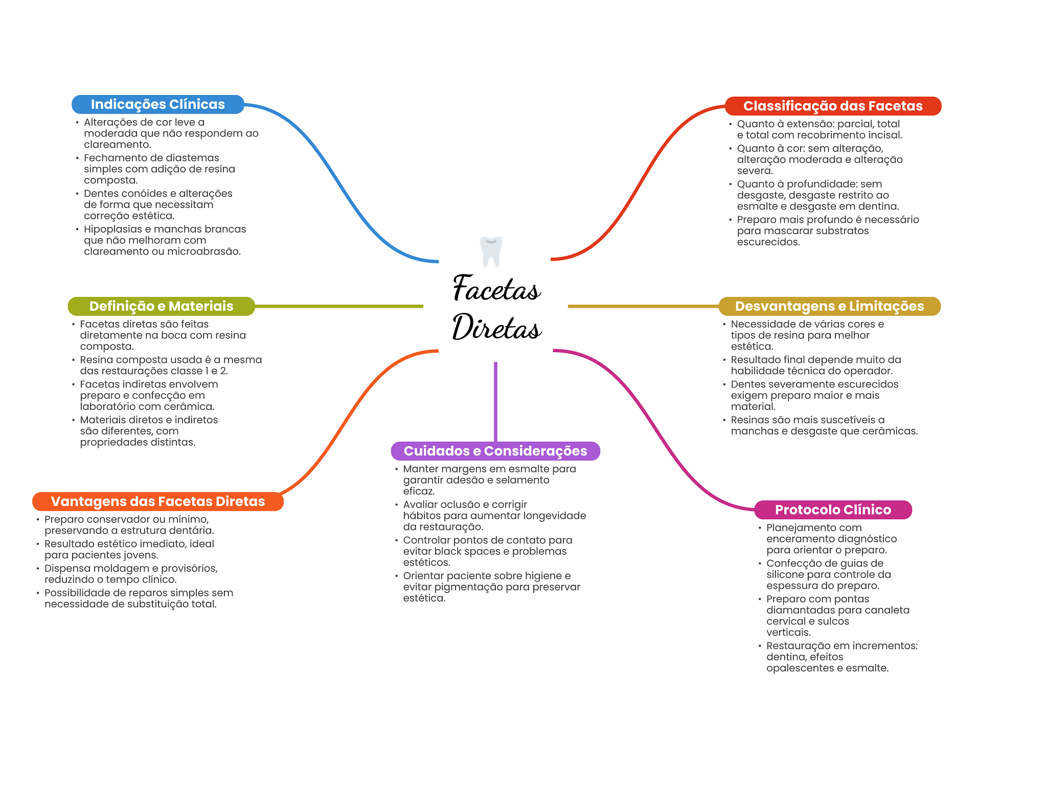 Indicações Clínicas Classificação das Facetas Alterações de cor leve a Quanto à extensão: parcial, total moderada que não respondem ao e total com recobrimento incisal. clareamento. Quanto à cor: sem alteração, Fechamento de diastemas alteração moderada e alteração simples com adição de resina severa. composta. Quanto à profundidade: sem Dentes conóides e alterações desgaste, desgaste restrito ao de forma que necessitam esmalte e desgaste em dentina. correção estética. Preparo mais profundo é necessário Hipoplasias e manchas brancas para mascarar substratos que não melhoram com escurecidos. clareamento ou microabrasão. Facetas Definição e Materiais Desvantagens e Limitações Facetas diretas são feitas diretamente na boca com resina Diretas Necessidade de várias cores e tipos de resina para melhor composta. estética. Resina composta usada é a mesma Resultado final depende muito da das restaurações classe 1 e 2. habilidade técnica do operador. Facetas indiretas envolvem Dentes severamente escurecidos preparo e confecção em exigem preparo maior e mais laboratório com cerâmica. material. Materiais diretos e indiretos Resinas são mais suscetíveis a são diferentes, com manchas e desgaste que cerâmicas. propriedades distintas. Cuidados e Considerações Manter margens em esmalte para garantir adesão e selamento eficaz. Vantagens das Facetas Diretas Avaliar oclusão e corrigir Protocolo Clínico Preparo conservador ou mínimo, hábitos para aumentar longevidade preservando a estrutura dentária. da restauração. Planejamento com Resultado estético imediato, ideal Controlar pontos de contato para enceramento diagnóstico para pacientes jovens. evitar black spaces e problemas para orientar preparo. estéticos. Dispensa moldagem e provisórios, Confecção de guias de reduzindo tempo clínico. Orientar paciente sobre higiene e silicone para controle da Possibilidade de reparos simples sem evitar pigmentação para preservar espessura do preparo. estética. necessidade de substituição total. Preparo com pontas diamantadas para canaleta cervical e sulcos verticais. Restauração em incrementos: dentina, efeitos opalescentes e esmalte.