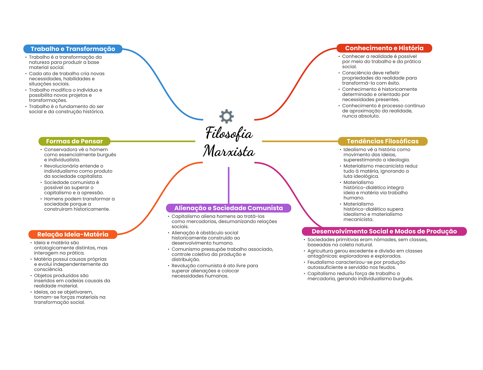 Trabalho e Transformação Conhecimento e História Trabalho é a transformação da Conhecer a realidade é possível natureza para produzir a base por meio do trabalho e da prática material social. social. Cada ato de trabalho cria novas Consciência deve refletir necessidades, habilidades e propriedades da realidade para situações sociais. transformá-la com êxito. Trabalho modifica O indivíduo e Conhecimento é historicamente possibilita novos projetos e determinado e orientado por transformações. necessidades presentes. Trabalho é fundamento do ser Conhecimento é processo contínuo social e da construção histórica. de aproximação da realidade, nunca absoluto. Filosofia Formas de Pensar Tendências Filosóficas Conservadora vê homem Marxista Idealismo vê a história como como essencialmente burguês movimento das ideias, e individualista. superestimando a ideologia. Revolucionária entende Materialismo mecanicista reduz individualismo como produto tudo à matéria, ignorando a da sociedade capitalista. luta ideológica. Sociedade comunista é Materialismo possível ao superar histórico-dialético integra capitalismo e a opressão. ideia e matéria via trabalho Homens podem transformar a humano. sociedade porque a Materialismo construíram historicamente. Alienação e Sociedade Comunista histórico-dialético supera Capitalismo aliena homens ao tratá-los idealismo e materialismo como mercadorias, desumanizando relações mecanicista. sociais. Relação Ideia-Matéria Alienação é obstáculo social Desenvolvimento Social e Modos de Produção historicamente construído ao Sociedades primitivas eram nômades, sem classes, Ideia e matéria são desenvolvimento humano. baseadas na coleta natural. ontologicamente distintas, mas Comunismo pressupõe trabalho associado, interagem na prática. Agricultura gerou excedente e divisão em classes controle coletivo da produção e antagônicas: exploradores e explorados. Matéria possui causas próprias distribuição. e evolui independentemente da Feudalismo caracterizou-se por produção Revolução comunista é ato livre para consciência. autossuficiente e servidão nos feudos. superar alienações e colocar Objetos produzidos são necessidades humanas. Capitalismo reduziu força de trabalho a inseridos em cadeias causais da mercadoria, gerando individualismo burguês. realidade material. Ideias, ao se objetivarem, tornam-se forças materiais na transformação social.
