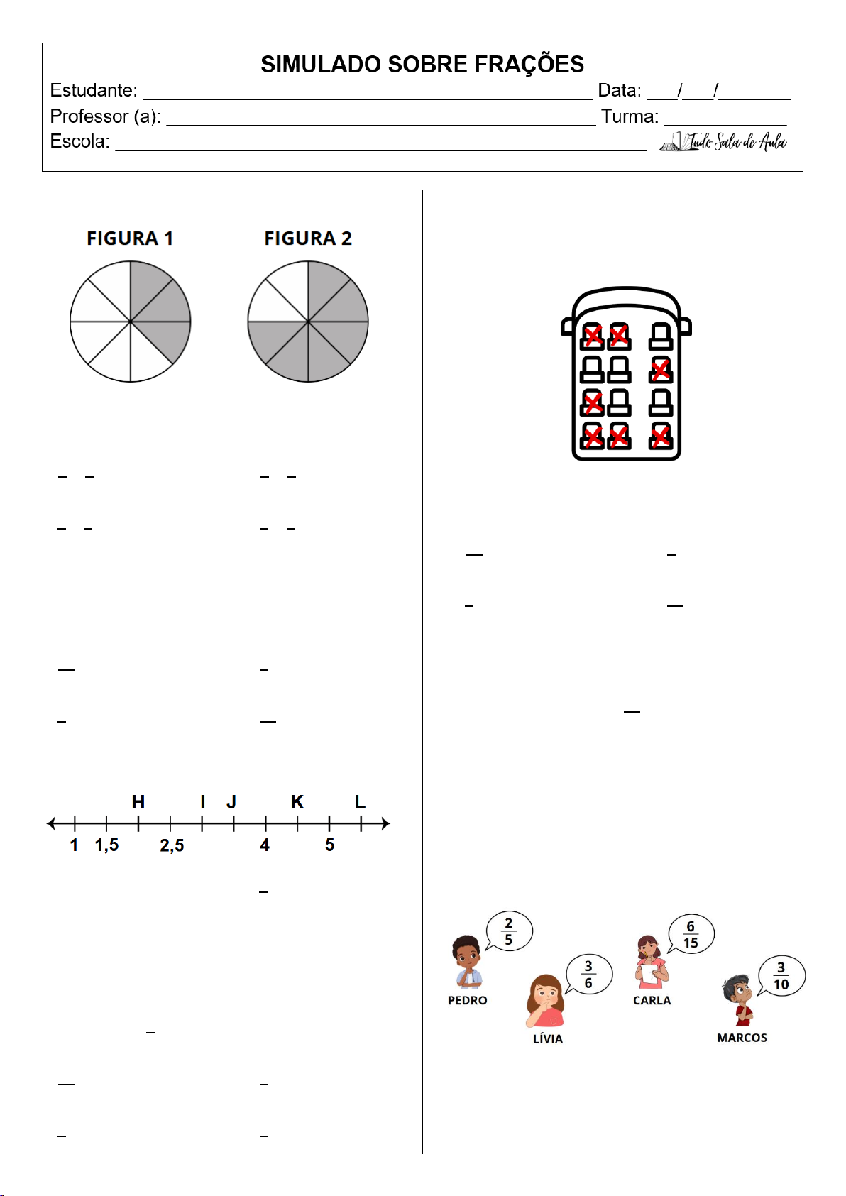 1. Observe as figuras a seguir. Quais frações representam a parte cinza de cada figura, respectivamente? a) 3 8 e 6 8 b) 5 8 e 2 8 c) 3 5 e 6 2 d) 5 3 e 2 6 2. Angélica comprou um bolo de chocolate e o dividiu em 12 pedaços. Ela comeu 1 pedaço e seu filho Arthur comeu 3. Qual fração representa a parte do bolo que ainda restou? a) 4 12 b) 4 8 c) 8 4 d) 8 12 3. Observe a reta a seguir. Em qual ponto da reta a fração 9 2 está localizada? a) I. b) J. c) K. d) L. 4. Marque a alternativa que apresenta uma fração equivalente de 3 9 . a) 4 10 b) 1 3 c) 2 8 d) 2 4 5. Jadson foi comprar uma passagem de ônibus para viajar e recebeu o mapa dos assentos para escolher onde sentar. Os bancos ocupados estavam marcados com um X. Qual fração representa os assentos disponíveis nesse ônibus? a) 5 12 b) 5 7 c) 7 5 d) 7 12 6. Alana estava no trabalho e pediu que seu filho Heitor comprasse um pudim para a sobremesa do almoço. Ao chegar em casa, no fim do dia, Heitor contou que havia comido 3 14 do pudim. Isso significa que: a) Heitor dividiu o pudim em 17 fatias e comeu 3. b) Heitor dividiu o pudim em 14 fatias e comeu 3. c) Heitor dividiu o pudim em 14 fatias e comeu 11. d) Heitor dividiu o pudim em 17 fatias e comeu 14. 7. A professora Celina colocou algumas frações no quadro e pediu que cada aluno escolhesse uma. Quais alunos escolheram frações equivalentes? a) Pedro e Lívia. b) Carla e Marcos. c) Pedro e Carla. d) Lívia e Marcos. https://tudosaladeaula.com/ https://www.tudosaladeaula.com/ https://tudosaladeaula.com/ https://www.tudosaladeaula.com/ 8. Observe a reta numérica abaixo. Qual a localização da fração 9 4 nessa reta? a) Entre 1 e 2. b) Exatamente em 2. c) Entre 2 e 3. d) Exatamente em 3. 9. Qual das frações abaixo é equivalente a 4 16 ? a) 2 12 b) 1 4 c) 8 24 d) 2 4 10. Observe a imagem a seguir. Qual número está faltando para que essas frações sejam equivalentes? a) 3 b) 6 c) 9 d) 12 11. Indique as frações 2 4 e 1 2 na reta numérica abaixo. É possível afirmar que a) as frações estão em lugares diferentes. b) 2 4 é maior que 1 2 . c) as duas frações ocupam o mesmo ponto na reta. d) 2 4 é menor que 1 2 . 12. Yago precisava montar uma moldura usando 28 quadradinhos. Depois de algum tempo de trabalho, a montagem ficou da seguinte forma. Qual fração representa a quantidade de quadradinhos que ainda faltam ser colocados na moldura? a) 4 20 b) 20 28 c) 8 20 d) 8 28 Tudo Sala de Aula https://tudosaladeaula.com/ https://www.tudosaladeaula.com/ https://tudosaladeaula.com/ https://tudosaladeaula.com/