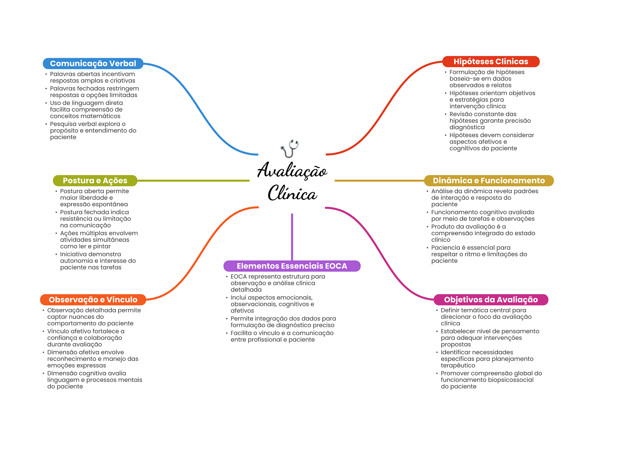 Comunicação Verbal Hipóteses Clínicas Palavras abertas incentivam Formulação de hipóteses respostas amplas e criativas baseia-se em dados observados e relatos Palavras fechadas restringem respostas a opções limitadas Hipóteses orientam objetivos Uso de linguagem direta e estratégias para facilita compreensão de intervenção clínica conceitos matemáticos Revisão constante das Pesquisa verbal explora hipóteses garante precisão propósito e entendimento do diagnóstica paciente Hipóteses devem considerar aspectos afetivos e cognitivos do paciente Avaliação Postura e Ações Dinâmica e Funcionamento Postura aberta permite Clínica Análise da dinâmica revela padrões maior liberdade e de interação e resposta do expressão espontânea paciente Postura fechada indica Funcionamento cognitivo avaliado resistência ou limitação por meio de tarefas e observações na comunicação Produto da avaliação é a Ações múltiplas envolvem compreensão integrada do estado atividades simultâneas clínico como ler e pintar Paciencia é essencial para Iniciativa demonstra respeitar ritmo e limitações do autonomia e interesse do paciente paciente nas tarefas Elementos Essenciais EOCA EOCA representa estrutura para observação e análise clínica detalhada Observação e Vínculo Inclui aspectos emocionais, Objetivos da Avaliação observacionais, cognitivos e Observação detalhada permite afetivos Definir temática central para captar nuances do Permite integração dos dados para direcionar foco da avaliação comportamento do paciente formulação de diagnóstico preciso clínica Vínculo afetivo fortalece a Facilita O vínculo e a comunicação Estabelecer nível de pensamento confiança e colaboração entre profissional e paciente para adequar intervenções durante avaliação propostas Dimensão afetiva envolve Identificar necessidades reconhecimento e manejo das específicas para planejamento emoções expressas terapêutico Dimensão cognitiva avalia Promover compreensão global do linguagem e processos mentais funcionamento biopsicossocial do paciente do paciente