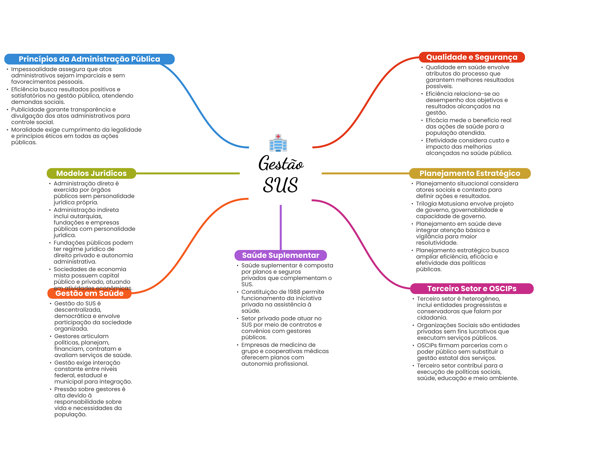 Princípios da Administração Pública Qualidade e Segurança Impessoalidade assegura que atos Qualidade em saúde envolve administrativos sejam imparciais e sem atributos do processo que favorecimentos pessoais. garantem melhores resultados Eficiência busca resultados positivos e possíveis. satisfatórios na gestão pública, atendendo Eficiência relaciona-se ao demandas sociais. desempenho dos objetivos e Publicidade garante transparência e resultados alcançados na divulgação dos atos administrativos para gestão. controle social. Eficácia mede O benefício real Moralidade exige cumprimento da legalidade das ações de saúde para a e princípios éticos em todas as ações população atendida. públicas. Efetividade considera custo e impacto das melhorias alcançadas na saúde pública. Gestão Modelos Jurídicos Planejamento Estratégico Administração direta é SUS Planejamento situacional considera exercida por órgãos atores sociais e contexto para públicos sem personalidade definir ações e resultados. jurídica própria. Trilogia Matusiana envolve projeto Administração indireta de governo, governabilidade e inclui autarquias, capacidade de governo. fundações e empresas Planejamento em saúde deve públicas com personalidade integrar atenção básica e jurídica. vigilância para maior Fundações públicas podem resolutividade. ter regime jurídico de Planejamento estratégico busca direito privado e autonomia Saúde Suplementar ampliar eficiência, eficácia e administrativa. Saúde suplementar é composta efetividade das políticas Sociedades de economia por planos e seguros públicas. mista possuem capital privados que complementam público e privado, atuando SUS. em atividades Terceiro Setor e OSCIPs Gestão em Saúde Constituição de 1988 permite funcionamento da iniciativa Terceiro setor é heterogêneo, Gestão do SUS é privada na assistência à inclui entidades progressistas e descentralizada, saúde. conservadoras que falam por democrática e envolve Setor privado pode atuar no cidadania. participação da sociedade SUS por meio de contratos e Organizações Sociais são entidades organizada. convênios com gestores privadas sem fins lucrativos que Gestores articulam públicos. executam serviços públicos. políticas, planejam, Empresas de medicina de financiam, contratam e OSCIPs firmam parcerias com grupo e cooperativas médicas poder público sem substituir a avaliam serviços de saúde. oferecem planos com gestão estatal dos serviços. Gestão exige interação autonomia profissional. constante entre níveis Terceiro setor contribui para a federal, estadual e execução de políticas sociais, saúde, educação e meio ambiente. municipal para integração. Pressão sobre gestores é alta devido à responsabilidade sobre vida e necessidades da população.