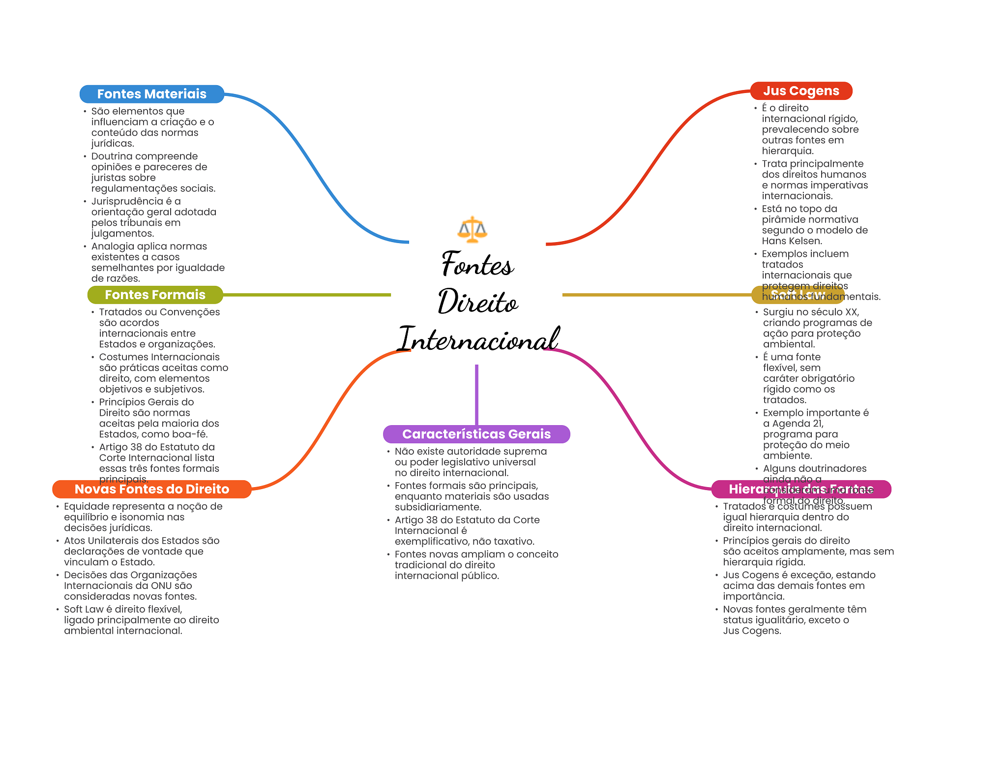 Fontes Materiais Jus Cogens São elementos que É direito influenciam a criação e o internacional rígido, conteúdo das normas prevalecendo sobre jurídicas. outras fontes em Doutrina compreende hierarquia. opiniões e pareceres de Trata principalmente juristas sobre dos direitos humanos regulamentações sociais. e normas imperativas internacionais. Jurisprudência é a orientação geral adotada Está no topo da pelos tribunais em pirâmide normativa julgamentos. segundo O modelo de Hans Kelsen. Analogia aplica normas existentes a casos Fontes Exemplos incluem semelhantes por igualdade tratados de razões. internacionais que protegem direitos Fontes Formais Direito human os damentais. Tratados ou Convenções Surgiu no século XX, são acordos criando programas de internacionais entre Estados e organizações. Internacional ação para proteção ambiental. Costumes Internacionais É uma fonte são práticas aceitas como flexível, sem direito, com elementos caráter obrigatório objetivos e subjetivos. rígido como os Princípios Gerais do tratados. Direito são normas Exemplo importante é aceitas pela maioria dos a Agenda 21, Estados, como boa-fé. Características Gerais programa para Artigo 38 do Estatuto da proteção do meio Não existe autoridade suprema Corte Internacional lista ambiente. ou poder legislativo universal essas três fontes formais no direito internacional. Alguns doutrinadores principais ainda Novas Fontes do Direito Fontes formais são principais, dms enquanto materiais são usadas formal.do direito Equidade representa a noção de subsidiariamente. Tratados e costumes possuem equilíbrio e isonomia nas Artigo 38 do Estatuto da Corte igual hierarquia dentro do decisões jurídicas. Internacional é direito internacional. Atos Unilaterais dos Estados são exemplificativo, não taxativo. Princípios gerais do direito declarações de vontade que Fontes novas ampliam conceito são aceitos amplamente, mas sem vinculam O Estado. tradicional do direito hierarquia rígida. Decisões das Organizações internacional público. Jus Cogens é exceção, estando Internacionais da ONU são acima das demais fontes em consideradas novas fontes. importância. Soft Law é direito flexível, Novas fontes geralmente têm ligado principalmente ao direito status igualitário, exceto ambiental internacional. Jus Cogens.