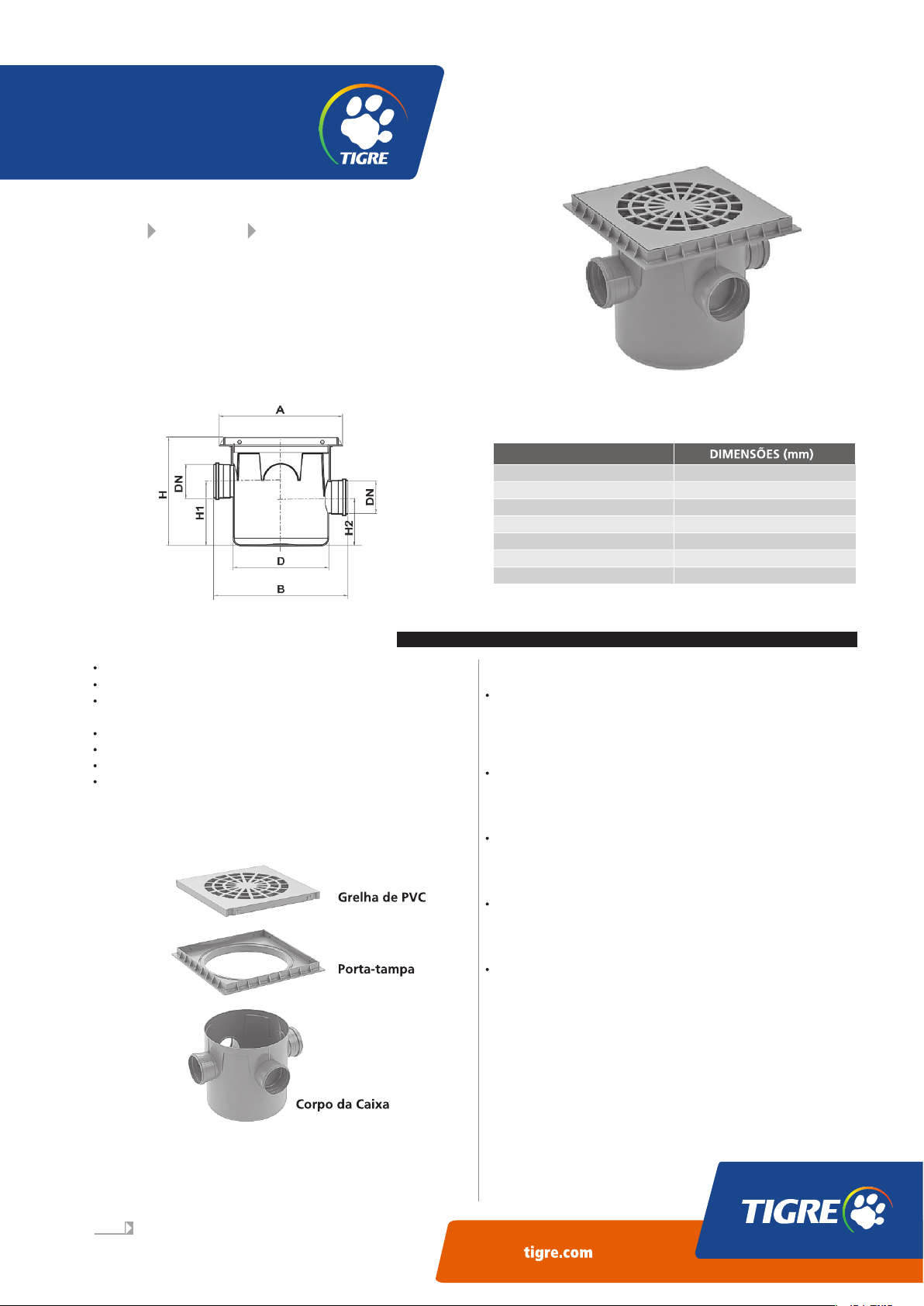 1. CARACTERÍSTICAS TÉCNICAS: 01/04 Caixa de Areia M A RÇ O /2 01 6 Ficha Técnica Localização no Website Tigre: Predial Águas Pluviais CAIXA DE AREIA Função: A Caixa de Areia completa o sistema de drenagem pluvial residencial. Através dela é possível fazer a limpeza de folhas e outros objetos que entram na tubulação através das calhas de chuva. Aplicação: Utililizadas em redes enterradas de drenagem até DN 100mm em obras residenciais e outras. Matéria prima: PVC; Cor: Cinza; Diâmetros: 3 entradas DN 100 e 1 saída de 100mm (juntas de dupla atuação); Temperatura máxima: 45ºC; Dimensões: 311mmx300mm; Pressão Máxima: conduto livre/sem pressão; Uma versão acompanha Grelha de PVC com porta-grelha e outra versão somente o corpo da caixa. Atenção: A Caixa de Areia é vendida em 2 versões: uma com Grelha de PVC e porta-tampa e outra somente o corpo. 1.1 - NORMAS DE REFERÊNCIA: Cotas A B D DN H H1 H2 388 420 300 100 348 201 151 1.2 - ÍTENS COMPLEMENTARES: NBR 10844 - Instalações prediais de águas pluviais. Grelha de PVC Reforçada Formato quadrado para facilitar acabamento com o piso; Resistente a tráfego de veículos leves - suporta até 500kg de carga. Grelha de a Alumínio Formato quadrado para facilitar acabamento com o piso; Resistente a tráfego de veículos leves - suporta até 500kg de carga. Prolongador Sem Entrada Possui uma altura total de 17 cm de área útil podendo ser cortado a cada 1 cm, conforme pré-cortes existentes no produto. Prolongador com Entrada Possui uma altura útil total de 17 cm e não pode ser cortado. Caixa de Areia 02/04 Fácil instalação: basta unir as peças utilizando o Adesivo Plástico Tigre; Durabilidade Total: não se degrada em contato com o esgoto; Estanqueidade: não vaza e impede a infiltração de esgoto para o solo; Pode ser utilizada em regiões com lençol freático elevado; Fácil fixação: ranhuras externas no corpo e na base favorecem a fixação no terreno (ancoragem), dispensando concreto; Fácil acabamento com piso: formato quadrado das Grelhas facilita o acabamento para qualquer tipo de piso (cimentado, cerâmico, pavimentado); Profundidade ajustável: com a utilização de prolongadores que podem ser cortados a cada 1cm; Permite ligações com desnível: através de Prolongadores com entrada; Fácil Transporte: leve com embalagem prática; Fácil de limpar: superfície totalmente lisa, não gera acúmulo de sujeira e facilita a remoção dos sedimentos. 2. BENEFÍCIOS: 3. INSTRUÇÕES: 3.1.1 MONTAGEM / INSTALAÇÃO CAIXA DE AREIA 3.1.2 MONTAGEM / INSTALAÇÃO PROLONGADOR Passo 1: Separe todas as peças e confira o conteúdo da embalagem; Importante: 1 - Base para assentamento A caixa deve ser assentada sempre sobre uma camada de areia bem compactada, lançada no fundo da vala da rede de esgoto; 2 - Reaterro lateral O solo de reaterro em volta da caixa deve ser muito bem compactado para garantir um apoio firme para o port-tampa; 3 - Uso da Curvar Tigre A Curvar serve para ajustar o ângulo ou saída da caixa (consulte o TeleTigre; 4 - Acabamento do piso Faça-o em volta do porta tampa com a grelha instalada para evitar deformação lateral do porta tampa; Passo 2: Monte as partes da caixa aplicando Adesivo Plástico entre as partes; Passo 1: Se necessário, corte o prolongador sem entrada no local indicado, usando um arco de serra. O prolongador pode ser cortado a cada centímetro; Passo 2: Faça o encaixe manualmente do p ro longado r na ca i xa de inspeção/interligação com adesivo plástico Tigre, empurrando até encostar no fundo da bolsa; Atenção: A profundidade final das caixas deve ser limitada a no máximo 1 metro para garantia de resistência e acesso para limpeza. Exemplo da Caixa de Areia com prolongador; Passo 3: Encaixe manualmente as peças, empurrando até encostar ao fundo da bolsa; Passo 4: Encaixe a Grelha de PVC ao Porta-Tampa da caixa antes de concretar ao redor; Passo 5: Ligue os tubos na caixa. Siga as recomendações Tigre para execução de juntas de dupla atuação em instalações de esgoto, optando pela junta soldável ou junta elástica. Para as entradas que serão utilizadas, faça o recorte com serra copo.; Passo 6: Se necessário, para ajustar a profundidade, utilize prolongador; 03/04 3.2 TRANSPORTE / MANUSEIO 3.3 EMBALAGEM / ESTOCAGEM Caixa de Areia Prolongador sem Entrada Prolongador com Entrada 3.4 MANUTENÇÃO Devido a sua leveza, apresentam grande facilidade de manuseio, especialmente se comparados a outros materiais, porém deve-se evitar abusos no trato dos mesmos, que poderão torná-los inadequados para uma utilização normal; Nas operações de carga e descarga deve-se evitar choques, batidas e atrito das embalagens para prevenir quebras e/ou rachaduras que danifiquem o produto. A estocagem deve ser feita em locais abrigados do sol, de livre acesso, e onde seja possível um fácil controle; Para empilhamento de caixas de papelão, recomenda-se que a altura máxima das pilhas seja de 2 metros. Preventiva: É importante ao terminar do instalar a Caixa de Areia, forrar o fundo da caixa com uma camada de areia para evitar a proliferação do mosquito Aedes Aegypti, responsável por disseminar a Dengue, Zika Vírus e Chikungunya, já que a Caixa é instalada em locais externos e pode acumular água parada. A limpeza deve ser feita quando necessário, para que o volume de acúmulo de sedimentos (folhas, galhos e outras sujeiras) não obstrua a rede de drenagem. Corretiva: Se instalado corretamente, o produto não deverá exigir manutenção corretiva. 4. ITENS DA LINHA: Cotas Cotas Cotas A B D DN H H1 H2 A e H A DN H 388 420 300 100 348 201 151 300 10 200 300 100 200 04/04 Grelha Quadrada de Piso com Porta Tampa Grelha DE aLUMÍNIO com Porta Tampa Cotas Cotas A B C D E F A B C D E F 348 348 388 293 50 31 348 348 388 293 50 31