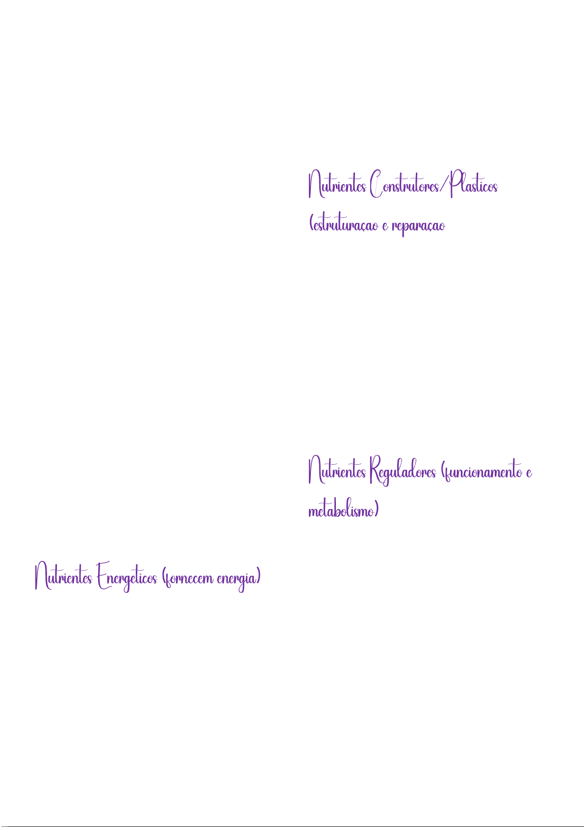 Classificação dos Nutrientes Segundo suas Funções Conceito Os nutrientes são classificados funcionalmente em 3 grupos principais: energéticos (carboidratos e lipídios), que fornecem energia imediata ou reserva; construtores ou plásticos (proteínas), responsáveis pela formação e reparação de tecidos; e reguladores (vitaminas e sais minerais), que controlam o metabolismo e processos fisiológicos. A água também é vital para regulação térmica e transporte. Classificação Funcional dos Nutrientes Carboidratos: fonte principal e imediata de energia para o corpo (ex.: pães, arroz, massas, açúcares). Lipídios (Gorduras): fonte de energia de reserva, isolante térmico e estrutural (ex.: azeite, abacate, gorduras naturais). Proteínas: fundamentais para a construção e reparação de tecidos, músculos, pele, além de compor enzimas e hormônios (ex.: carnes, ovos, leite, leguminosas). Vitaminas: substâncias orgânicas essenciais para o metabolismo, sistema imunológico e visão (ex.: vitaminas A, C, D, E, K, complexo B). Sais Minerais: substâncias inorgânicas que regulam funções orgânicas, como contração muscular e impulsos nervosos, e compõem estruturas (ex.: cálcio, ferro. Zinco). Nutrientes Segundo a Necessidade de Quantidade Macronutrientes: necessários em grandes quantidades (proteínas, carboidratos, lipídios, água). Micronutrientes: necessários em pequenas concentrações, mas vitais (vitaminas e sais minerais).