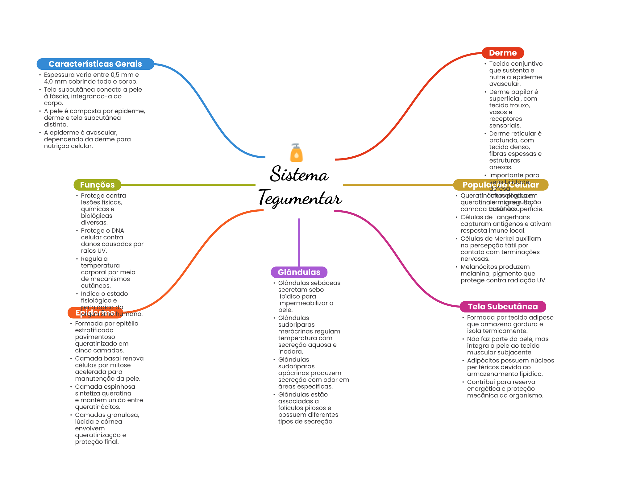 Derme Características Gerais Tecido conjuntivo que sustenta e Espessura varia entre 0,5 mm e nutre a epiderme 4,0 mm cobrindo todo corpo. avascular. Tela subcutânea conecta a pele Derme papilar é à fáscia, integrando-a ao superficial, com corpo. tecido frouxo, A pele é composta por epiderme, vasos e derme e tela subcutânea receptores distinta. sensoriais. A epiderme é avascular, Derme reticular é dependendo da derme para profunda, com nutrição celular. tecido denso, fibras espessas e estruturas Sistema anexas. Importante para Funções Protege contra lesões físicas, Tegumentar químicas e camada biológicas Células de Langerhans diversas. capturam antígenos e ativam Protege DNA resposta imune local. celular contra Células de Merkel auxiliam danos causados por na percepção tátil por raios UV. contato com terminações Regula a nervosas. temperatura Melanócitos produzem corporal por meio Glândulas melanina, pigmento que de mecanismos Glândulas sebáceas protege contra radiação UV. cutâneos. secretam sebo Indica estado lipídico para fisiológico e impermeabilizar a patológico do Tela Subcutânea imano. pele. Glândulas Formada por tecido adiposo Formada por epitélio sudoríparas que armazena gordura e estratificado merócrinas regulam isola termicamente. pavimentoso temperatura com Não faz parte da pele, mas queratinizado em secreção aquosa e integra a pele ao tecido cinco camadas. inodora. muscular subjacente. Camada basal renova Glândulas Adipócitos possuem núcleos células por mitose periféricos devido ao acelerada para apócrinas produzem armazenamento lipídico. manutenção da pele. secreção com odor em Contribui para reserva Camada espinhosa áreas específicas. energética e proteção sintetiza queratina Glândulas estão mecânica do organismo. e mantém união entre associadas a queratinócitos. folículos pilosos e Camadas granulosa, possuem diferentes lúcida e córnea tipos de secreção. envolvem queratinização e proteção final.