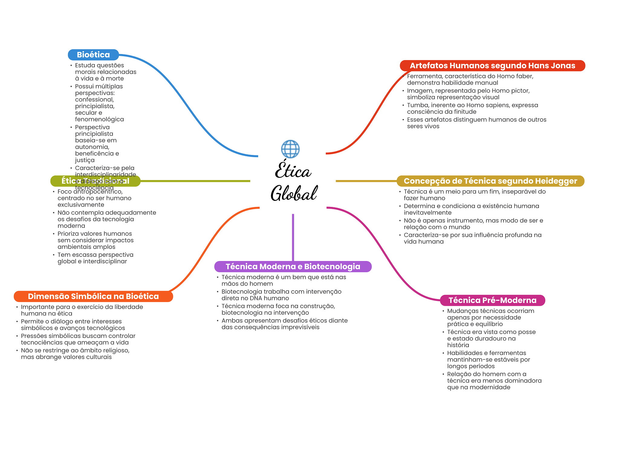 Bioética Estuda questões Artefatos Humanos segundo Hans Jonas morais relacionadas à vida e à morte Ferramenta, característica do Homo faber, demonstra habilidade manual Possui múltiplas perspectivas: Imagem, representada pelo Homo pictor, confessional, simboliza representação visual principialista, Tumba, inerente ao Homo sapiens, expressa secular e consciência da finitude fenomenológica Esses artefatos distinguem humanos de outros Perspectiva seres vivos principialista baseia-se em autonomia, beneficência e justiça Caracteriza-se pela Ética Concepção de Técnica segundo Heidegger tecnociência Foco antropocentrico, Global Técnica é um meio para um fim, inseparável do centrado no ser humano fazer humano exclusivamente Determina e condiciona a existência humana Não contempla adequadamente inevitavelmente desafios da tecnologia Não é apenas instrumento, mas modo de ser e moderna relação com mundo Prioriza valores humanos Caracteriza-se por sua influência profunda na sem considerar impactos vida humana ambientais amplos Tem escassa perspectiva global e interdisciplinar Técnica Moderna e Biotecnologia Técnica moderna é um bem que está nas mãos do homem Biotecnologia trabalha com intervenção Dimensão Simbólica na Bioética direta no DNA humano Técnica Pré-Moderna Importante para exercício da liberdade Técnica moderna foca na construção, humana na ética biotecnologia na intervenção Mudanças técnicas ocorriam Ambas apresentam desafios éticos diante apenas por necessidade Permite diálogo entre interesses das consequências imprevisíveis prática e equilíbrio simbólicos e avanços tecnológicos Técnica era vista como posse Pressões simbólicas buscam controlar e estado duradouro na tecnociências que ameaçam a vida história Não se restringe ao âmbito religioso, Habilidades e ferramentas mas abrange valores culturais mantinham-se estáveis por longos períodos Relação do homem com a técnica era menos dominadora que na modernidade