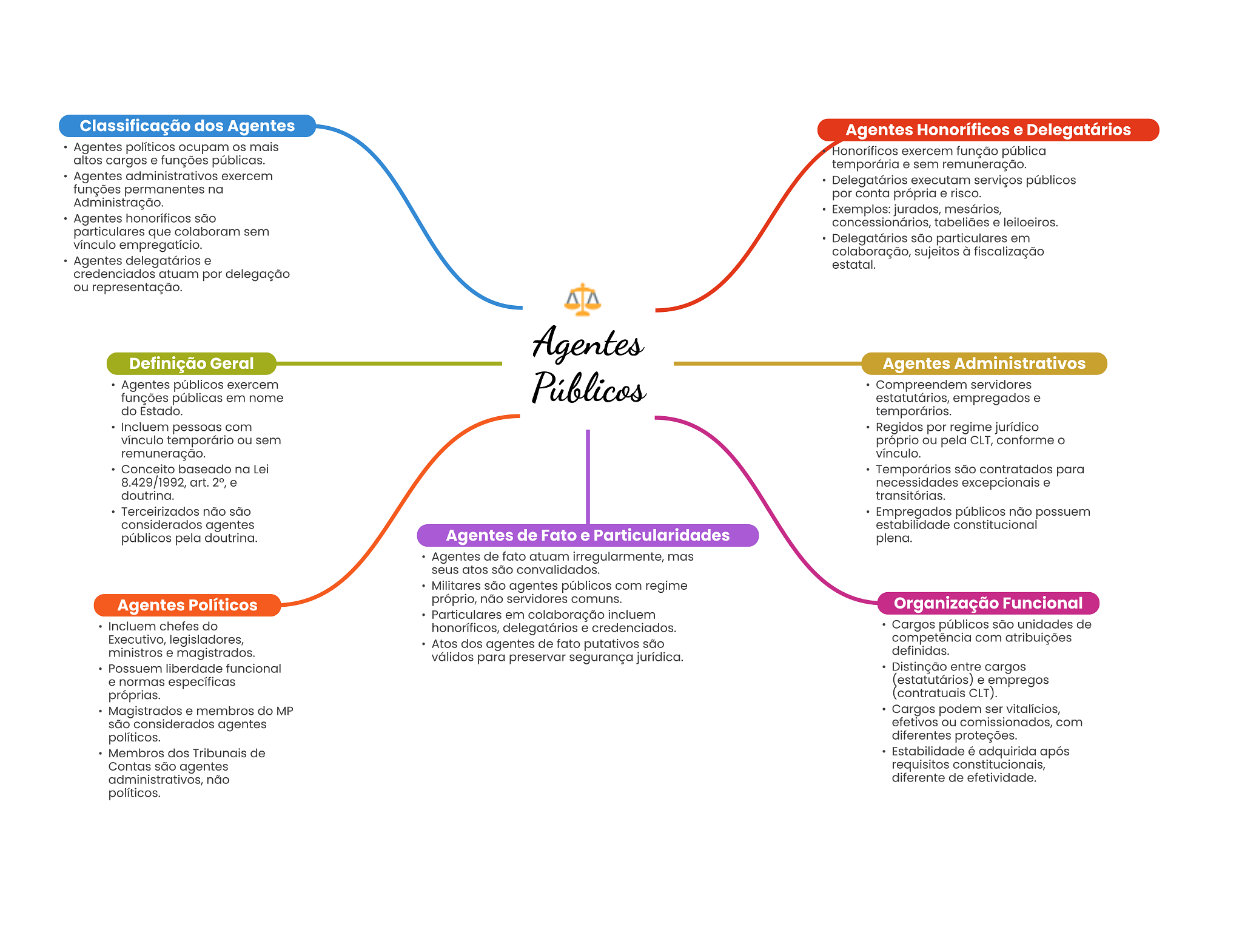 Classificação dos Agentes Agentes Honoríficos e Delegatários Agentes políticos ocupam mais Honoríficos exercem função pública altos cargos e funções públicas. temporária e sem remuneração. Agentes administrativos exercem Delegatários executam serviços públicos funções permanentes na por conta própria e risco. Administração. Exemplos: jurados, mesários, Agentes honoríficos são concessionários, tabeliães e leiloeiros. particulares que colaboram sem vínculo Delegatários são particulares em colaboração, sujeitos à fiscalização Agentes delegatários e estatal. credenciados atuam por delegação ou representação. Agentes Definição Geral Agentes Administrativos Agentes públicos exercem Públicos Compreendem servidores funções públicas em nome estatutários, empregados e do Estado. temporários. Incluem pessoas com Regidos por regime jurídico vínculo temporário ou sem próprio ou pela CLT, conforme remuneração. vínculo. Conceito baseado na Lei Temporários são contratados para 8.429/1992, art. 2°, e necessidades excepcionais e doutrina. transitórias. Terceirizados não são Empregados públicos não possuem considerados agentes estabilidade constitucional públicos pela doutrina. Agentes de Fato e Particularidades plena. Agentes de fato atuam irregularmente, mas seus atos são convalidados. Militares são agentes públicos com regime Agentes Políticos próprio, não servidores comuns. Organização Funcional Particulares em colaboração incluem Incluem chefes do honoríficos, delegatários e credenciados. Cargos públicos são unidades de Executivo, legisladores, Atos dos agentes de fato putativos são competência com atribuições ministros e magistrados. definidas. válidos para preservar segurança jurídica. Possuem liberdade funcional Distinção entre cargos e normas específicas (estatutários) e empregos próprias. (contratuais CLT). Magistrados e membros do MP Cargos podem ser vitalícios, são considerados agentes efetivos ou comissionados, com políticos. diferentes proteções. Membros dos Tribunais de Estabilidade é adquirida após Contas são agentes requisitos constitucionais, administrativos, não diferente de efetividade. políticos.