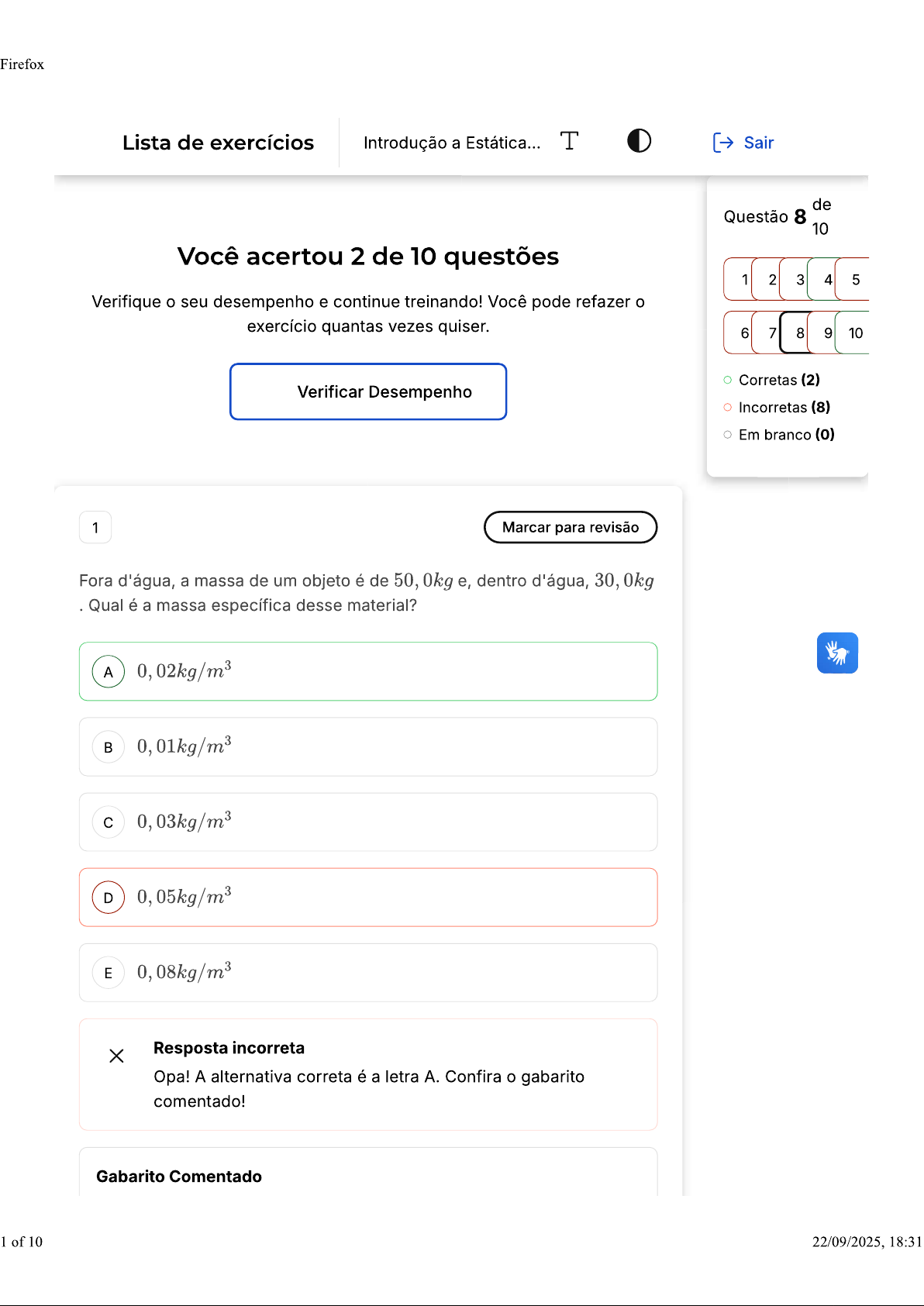 Firefox Lista de exercícios Introdução a Estática... T Sair Questão 8 de 10 Você acertou 2 de 10 questões 1 2 3 4 5 Verifique o seu desempenho e continue treinando! Você pode refazer exercício quantas vezes quiser. 6 7 8 9 10 Corretas (2) Verificar Desempenho Incorretas (8) Em branco (0) 1 Marcar para revisão Fora d'água, a massa de um objeto é de 50, 0kg e, dentro d'água, 30, 0kg Qual é a massa específica desse material? A 0,02kg/m³ 0,01kg/m³ c D E 0,08kg/m³ X Resposta incorreta Opa! A alternativa correta é a letra Confira gabarito comentado! Gabarito Comentado 1 of 10 22/09/2025, 18:31