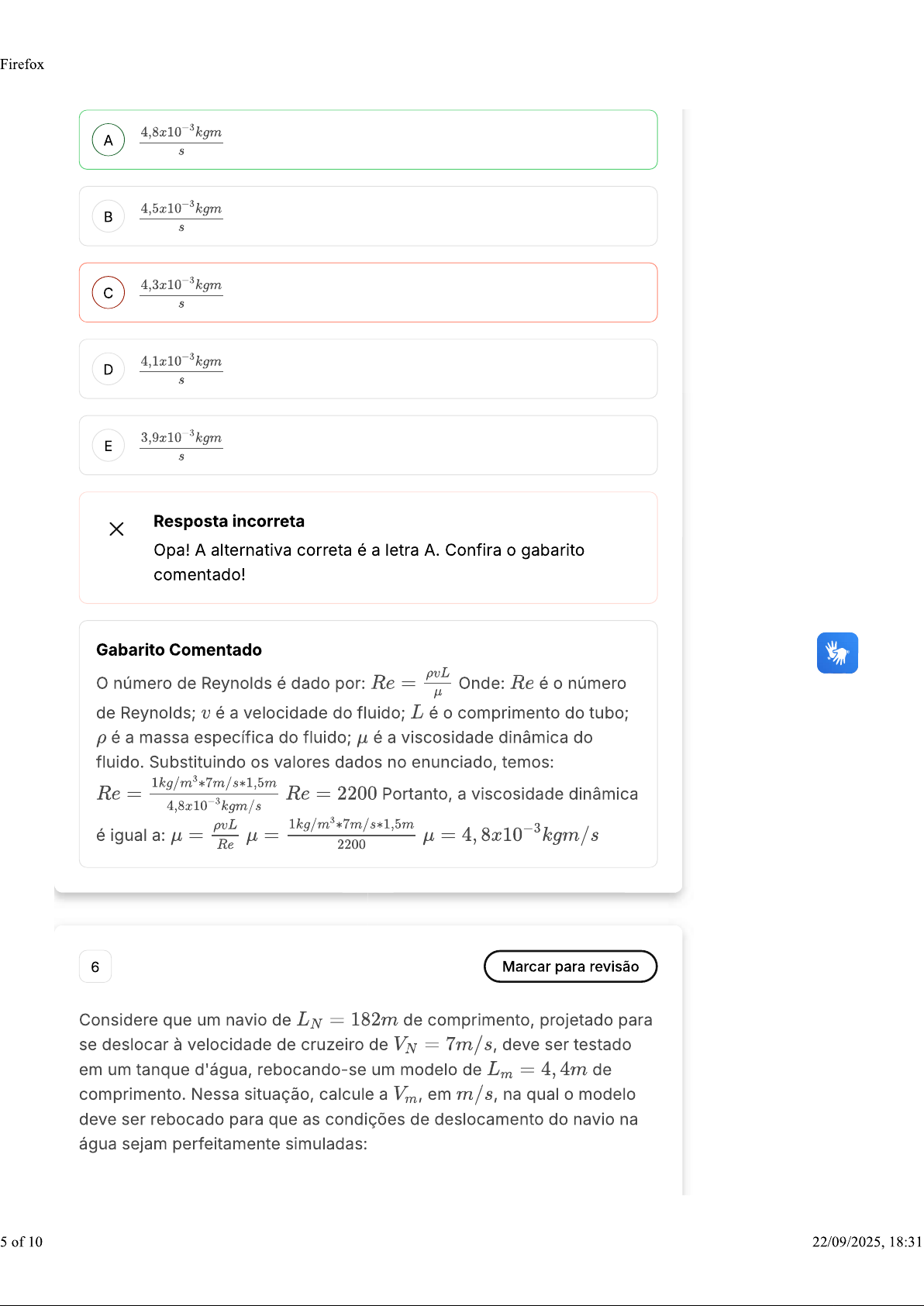 Firefox 4,8x10⁻³kgm A 4,5x10⁻³kgm c D 3,9x10⁻³kgm E S X Resposta incorreta Opa! A alternativa correta é a letra Confira gabarito comentado! Gabarito Comentado número de Reynolds é dado por: Re = Onde: Re é número de Reynolds; v é a velocidade do fluido; L é comprimento do tubo; é a massa específica do fluido; é a viscosidade dinâmica do fluido. Substituindo os valores dados no enunciado, temos: Re = 1kg/m³*7m/s*1,5m Re = 2200 Portanto, a viscosidade dinâmica é igual a: puL Re 2200 6 Marcar para revisão Considere que um navio de LN = 182m de comprimento, projetado para se deslocar à velocidade de cruzeiro de VN = 7m/s, deve ser testado em um tanque d'água, rebocando-se um modelo de Lₘ = 4, 4m de comprimento. Nessa situação, calcule a Vₘ, em m/s, na qual modelo deve ser rebocado para que as condições de deslocamento do navio na água sejam perfeitamente simuladas: 5 of 10 22/09/2025, 18:31Firefox A 7 1,1 c 289 D 0,17 E 10 X Resposta incorreta A alternativa correta é a letra Confira o gabarito comentado! Gabarito Comentado A resposta correta é: 1,1. A velocidade de um navio é proporcional ao seu comprimento. Portanto, para que as condições de deslocamento do navio na água sejam perfeitamente simuladas, modelo deve ser rebocado a uma velocidade de 1,1 m/s. 7 Marcar para revisão A Figura a seguir ilustra um recipiente cilíndrico totalmente fechado, contendo gás e óleo. A, B e C são pontos no interior do recipiente, estando A em seu tampo, C em sua base e na interface gás-óleo. As densidades do óleo e do gás valem, respectivamente, 0, 8g/cm³ e A 4,0 m Gás 6 of 10 22/09/2025, 18:31
