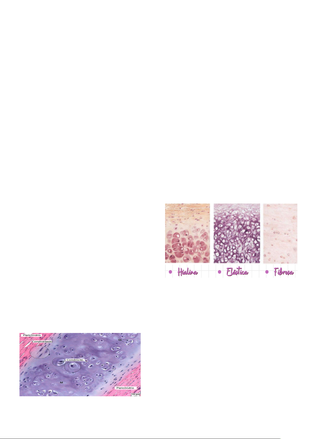 Roberta Freitas – M1 1 Caracteríicas ® O tecido cartilaginoso é uma matriz sólida e firme, mas flexível, composta por glicosaminoglicanos e colágeno. Sua estrutura é mantida pela água de solvatação, e é avascular, dependendo do pericôndrio para nutrição. Encontrado em articulações móveis, proporciona resistência mecânica e flexibilidade ao corpo. Função ® Suporte de tecidos moles ® Revestir superfícies articulares (absorve choques/deslizamento do osso) ® Formação e crescimento dos ossos longos Pericôndrio ® Constituído de tecido conjuntivo denso; Encontra-se em superfícies de cartilagens hialinas, exceto nas cartilagens articulares; ® Produção de energia por anaerobiose ® É formado de condroblasto (geram Condrócitos) que está localizado no pericôndrio; ® Fontes de novos Condrócitos ® Presença de vasos linfáticos e sanguíneos ® Oxigenação, nutrição e excreção Condrócito ® Originado do condroblasto ® Conjunto de condrócitos (de dois a oito) dentro de uma única lacuna são chamados de grupos isógenos ® Superfície é formada de reentrâncias e saliências para nutrição dos condrócitos e trocas com o meio extracelular ® Isolado de vasos ® Secretam colágeno do tipo 2 ® Oxigenação deficiente/baixa ® Produção de energia por anaerobiose Tip de cartilagens Cartilagem Hialina ® Mais frequente; ® Primeiro esqueleto do embrião; ® Esqueleto ósseo; ® Disco epifisário – cartilagem; ® Localização: Fossas nasais, traqueia, brônquios e costela – extremidade ventral; ® Ossos longos. Tecido cilaginoso Roberta Freitas – M1 2 Cartilagem Eláica ® Semelhante – cartilagem hialina; ® Fibrilas elásticas – contínuas pericôndrio; ® Coloração de orceína; ® Menos sujeitas a processos degenerativos; ® Localização: Conduto auditivo externo, tuba auditiva, epiglote e laringe. Cartilagem Fibra ® Substância fundamental escassa; ® Condrócitos fileiras; ® Matriz – acidófila; ® Não existe pericôndrio; ® Tecido conjuntivo denso + cartilagem hialina; ® Localização: Disco intervertebral; ® Inserção – ligamentos e tendões; ® Sínfise pubiana. Lâminas