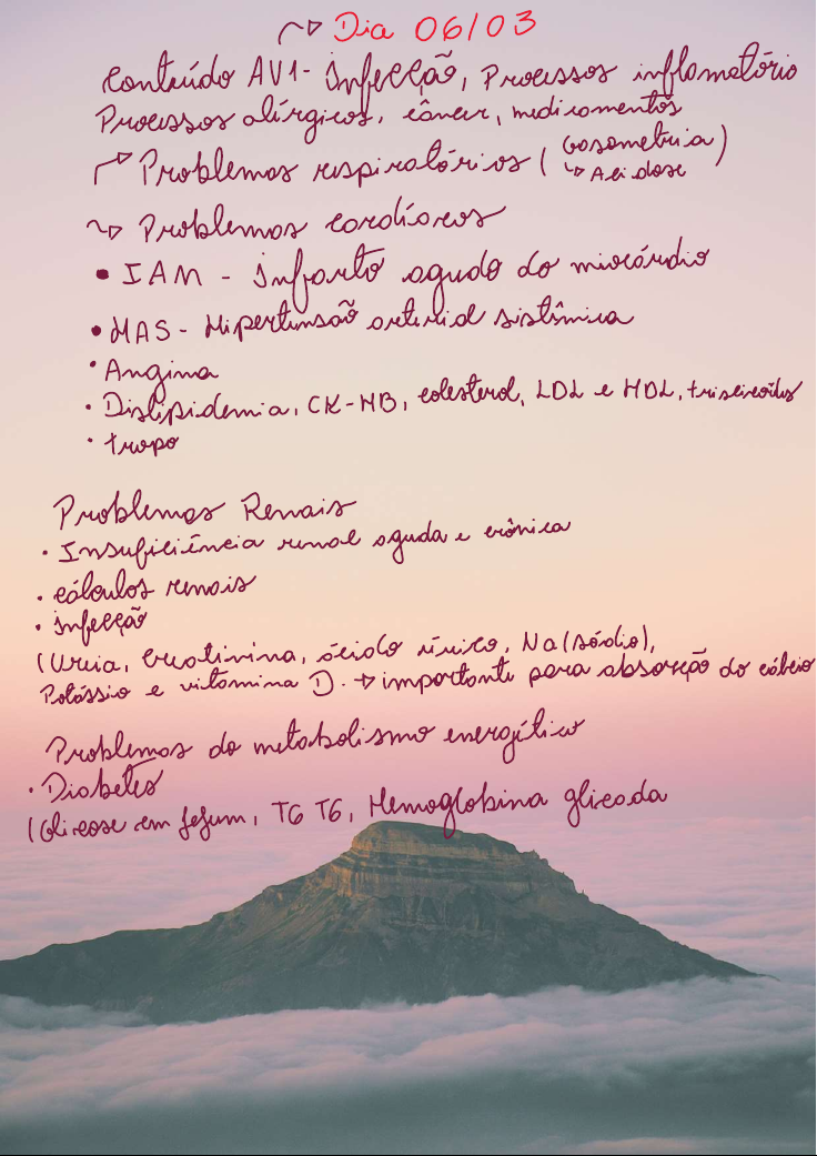 Dia 06/03 AV1- medicomentos Problemos respiratorios ( Problemos IAM - do MAS- Angima LDL e sguda e Uria, ( e vitomina D. pera do eóbeio Problemos do metobolismo Diobetes T6 T6, Hemoglobina glieodaQuando for falar da glicose vamos saber a concentracao de acucar no sangue. se paciente tem diabete. Entao a bioquimica clinica esta ligada as questoes de concentração no organismo. 2 tipos de lipideos: exogenos (aquilo que a gente come) e endogenas. Laboratorio clinico: serviço destinado à analise de amostras de pacientes com a finalidade de oferecer apoio ao diagnostico e terapêutico. Laboratorio de apoio: Laboratorio clinico que realiza analises em amostras enviadas por outros Laboratorios clinico. Catabolismo: Destruicao compostos organicos degradados em moleculas. Anabolismo: Construcao formação de moléculas mais complexas a partir de moléculas mais simples. ocorrendo consumo de energia. Compostos inorganicos: agua > consegue atravessar as membranas plasmaticas (osmolaridades) - coesao por causa da atracao das molecula de agua entre pelas pontes de hidrogenio. Adesao (unem outras moleculas polares) E minerais > micronutrientes: ferro. selênio. zinco, corbre. iodo. fluor. cobre. colbato. macronutrientes: calcio. fosforo. potassio. sodio, cloro. enxofre e magnesio. Compostos organicos: Carboidratos. lipideos. proteinas. acidos nucleicos. vitaminas Garantia e Controle da Qualidade (CQ) sistema de qualidade é vital para assegurar a precisao dos resultados e deve incluir programas documentados de avaliação regular. Controlo Interno: Avalia a precisao através da analise repetida da mesma amostra (ex: soro ou urina controlo) no proprio laboratorio. Controlo Externo (Ensaio de Proficiência): Avalia a exatidao comparando OS resultados do laboratorio com um "valor de consenso" ou padrao de referência através de comparações interlaboratoriais.as proteinas sao no arandelas formados pela sequencia de varios aminoacidos. unido por peptidica. Proteinas nutrientes e de reserva: caseina do leite e ovoalbumina na clara de TRANSAMINASE Enzima a tubulino do CK - Conjunto de enzima > mm ( musculo esqueletico) bb ( (cerebro) mb (coracac Isoenzimas - Proteinas quase iguais. Proteinas estruturais e de protecao: colageno el stina e queratina Proteinas reguladoras (hormonios): insulina e glucagon de defesa: fibrinogênio e trombina VIAS DE UTILIZAÇÃO PA GLICOSE molecula de glicose - é importamte para a formcao do glicogenio. Acido nucleico é tranformado em acido urico > ha muito acido urico nas C - articulacoes e forma cristais vistos na urina. creatinina serica. ureia e proteinuria elevada > insuficiência renal no exame colesterol lipoprotina (LDL) voj os A osmoloridode depende do sódio Hemocultura iD primiro sem EDTA 2- hemogramapra w fotor du trabalho monual, codostro de pacients d voil I exame Anolita: pois uma escome du MIV podu di foma C6M1206 02 CO2 amidrase + ferro M2C03 + Dentro do olveolo muito residual Ar inspirado = mmHg = mmHg AM inspirado + AM residual moior pressão do 40 mmHg se e o volume da e sobe -Doa Álido Recebe M2O + A quem reomonda é o pulmão I do que I sair Abcolose respiratoria: Aumento do Acidose tampao protige contra a seidez a du uma uma -D Aholose 4 -D Abeolose -D Acidose b Acidose meto Alidose A du e PM de bose nos metobolica pulmoo que tinta equilibror a lozer uma 1° pora depois a confirmer D escome m m ( CK m b ( BB ( mois pora tipo tempo curto pora I inforto Renol: glomerular, of polients tim I AM pois filtron o ICC HAS D não i pelo pois eousa dos da rmal Uréia da 110 a diária proporeional a mossa a