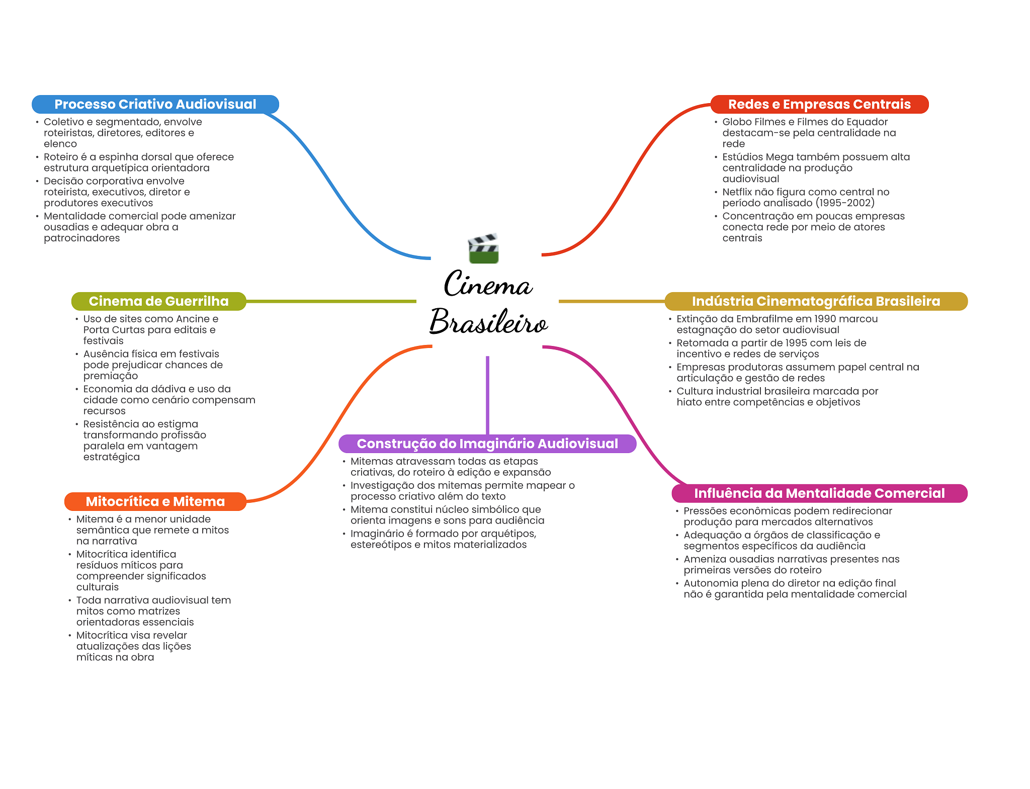 Processo Criativo Audiovisual Redes e Empresas Centrais Coletivo e segmentado, envolve Globo Filmes e Filmes do Equador roteiristas, diretores, editores e destacam-se pela centralidade na elenco rede Roteiro é a espinha dorsal que oferece Estúdios Mega também possuem alta estrutura arquetípica orientadora centralidade na produção Decisão corporativa envolve audiovisual roteirista, executivos, diretor e Netflix não figura como central no produtores executivos período analisado (1995-2002) Mentalidade comercial pode amenizar Concentração em poucas empresas ousadias e adequar obra a conecta rede por meio de atores patrocinadores centrais Cinema Cinema de Guerrilha Indústria Cinematográfica Brasileira Uso de sites como Ancine e Brasileiro Extinção da Embrafilme em 1990 marcou Porta Curtas para editais e estagnação do setor audiovisual festivais Retomada a partir de 1995 com leis de Ausência física em festivais incentivo e redes de serviços pode prejudicar chances de Empresas produtoras assumem papel central na premiação articulação e gestão de redes Economia da dádiva e uso da Cultura industrial brasileira marcada por cidade como cenário compensam hiato entre competências e objetivos recursos Resistência ao estigma transformando profissão paralela em vantagem Construção do Imaginário Audiovisual estratégica Mitemas atravessam todas as etapas criativas, do roteiro à edição e expansão Investigação dos mitemas permite mapear processo criativo além do texto Influência da Mentalidade Comercial Mitocrítica e Mitema Mitema constitui núcleo simbólico que Pressões econômicas podem redirecionar Mitema é a menor unidade orienta imagens e sons para audiência produção para mercados alternativos semântica que remete a mitos Imaginário é formado por arquétipos, na narrativa Adequação a órgãos de classificação e estereótipos e mitos materializados segmentos específicos da audiência Mitocrítica identifica resíduos míticos para Ameniza ousadias narrativas presentes nas compreender significados primeiras versões do roteiro culturais Autonomia plena do diretor na edição final Toda narrativa audiovisual tem não é garantida pela mentalidade comercial mitos como matrizes orientadoras essenciais Mitocrítica visa revelar atualizações das lições míticas na obra