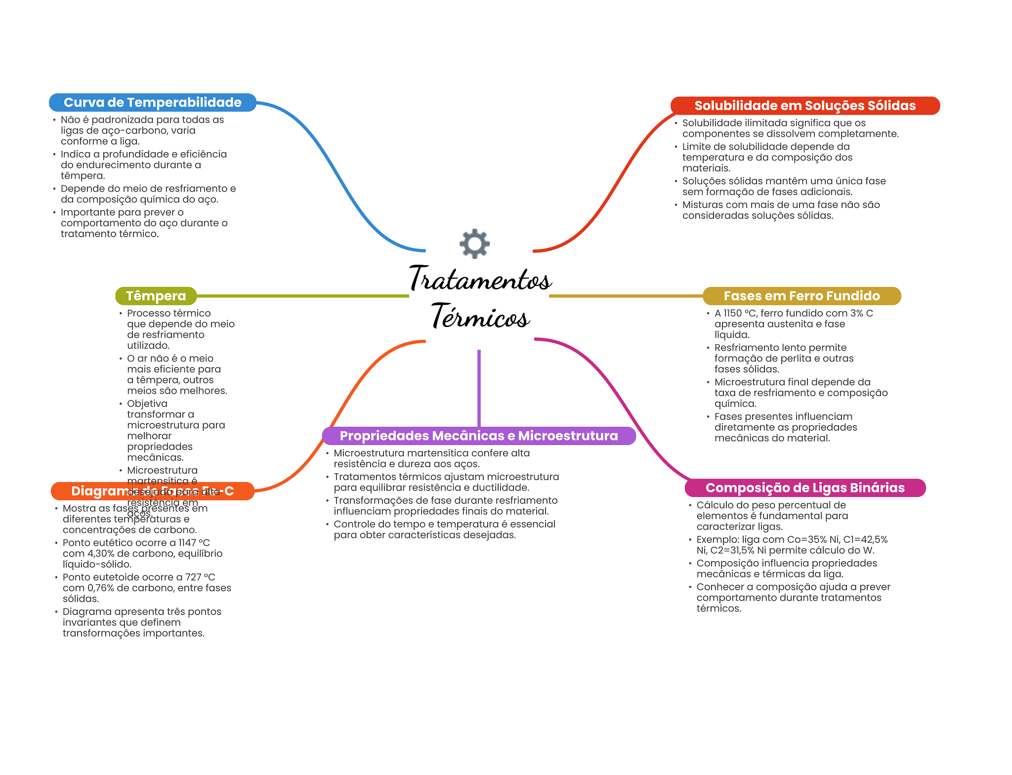 Curva de Temperabilidade Solubilidade em Soluções Sólidas Não é padronizada para todas as Solubilidade ilimitada significa que os ligas de aço-carbono, varia componentes se dissolvem completamente. conforme a liga. Limite de solubilidade depende da Indica a profundidade e eficiência temperatura e da composição dos do endurecimento durante a materiais. têmpera. Soluções sólidas mantêm uma única fase Depende do meio de resfriamento e sem formação de fases adicionais. da composição química do aço. Misturas com mais de uma fase não são Importante para prever consideradas soluções sólidas. comportamento do aço durante tratamento térmico. Tratamentos Têmpera Fases em Ferro Fundido Processo térmico Térmicos A 1150 °C, ferro fundido com 3% C que depende do meio apresenta austenita e fase de resfriamento líquida. utilizado. Resfriamento lento permite não é meio formação de perlita e outras mais eficiente para fases sólidas. a têmpera, outros Microestrutura final depende da meios são melhores. taxa de resfriamento e composição Objetiva química. transformar a Fases presentes influenciam microestrutura para diretamente as propriedades melhorar Propriedades Mecânicas e Microestrutura mecânicas do material. propriedades mecânicas. Microestrutura martensítica confere alta resistência e dureza aços. Microestrutura martensítica é Tratamentos térmicos ajustam microestrutura para equilibrar resistência e ductilidade. Composição de Ligas Binárias resistência em Transformações de fase durante resfriamento Mostra as fases presentes em Cálculo do peso percentual de influenciam propriedades finais do material. diferentes temperaturas e elementos é fundamental para Controle do tempo e temperatura é essencial concentrações de carbono. caracterizar ligas. para obter características desejadas. Ponto eutético ocorre a 1147 °C Exemplo: liga com Co=35% Ni, C1=42,5% com 4,30% de carbono, equilíbrio Ni, C2=31,5% Ni permite cálculo do W. Composição influencia propriedades Ponto eutetoide ocorre a 727 mecânicas e térmicas da liga. com 0,76% de carbono, entre fases Conhecer a composição ajuda a prever sólidas. comportamento durante tratamentos Diagrama apresenta três pontos térmicos. invariantes que definem transformações importantes.