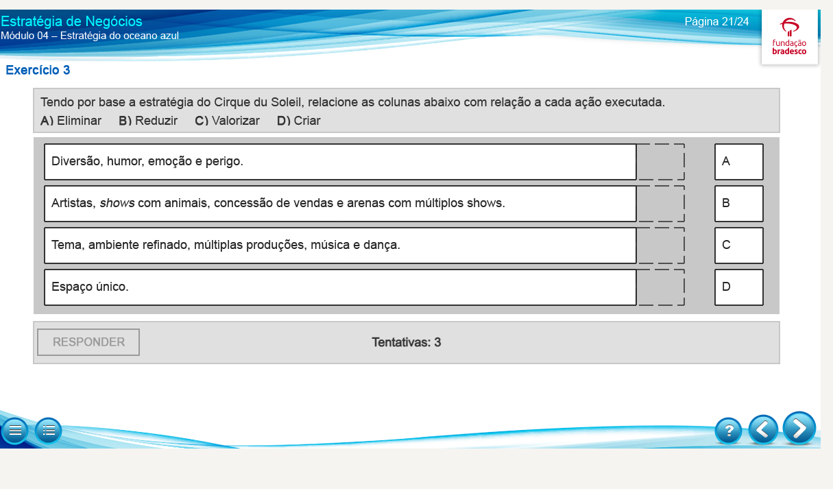 Estratégia de Negócios Página 21/24 Módulo 04 - Estratégia do oceano azul fundação bradesco Exercício 3 Tendo por base a estratégia do Cirque du Soleil, relacione as colunas abaixo com relação a cada ação executada. A) Eliminar B) Reduzir C) Valorizar D) Criar Diversão, humor, emoção e perigo. A Artistas, shows com animais, concessão de vendas e arenas com múltiplos shows. B Tema, ambiente refinado, múltiplas produções, música e dança. C Espaço único. D RESPONDER Tentativas: 3 ?