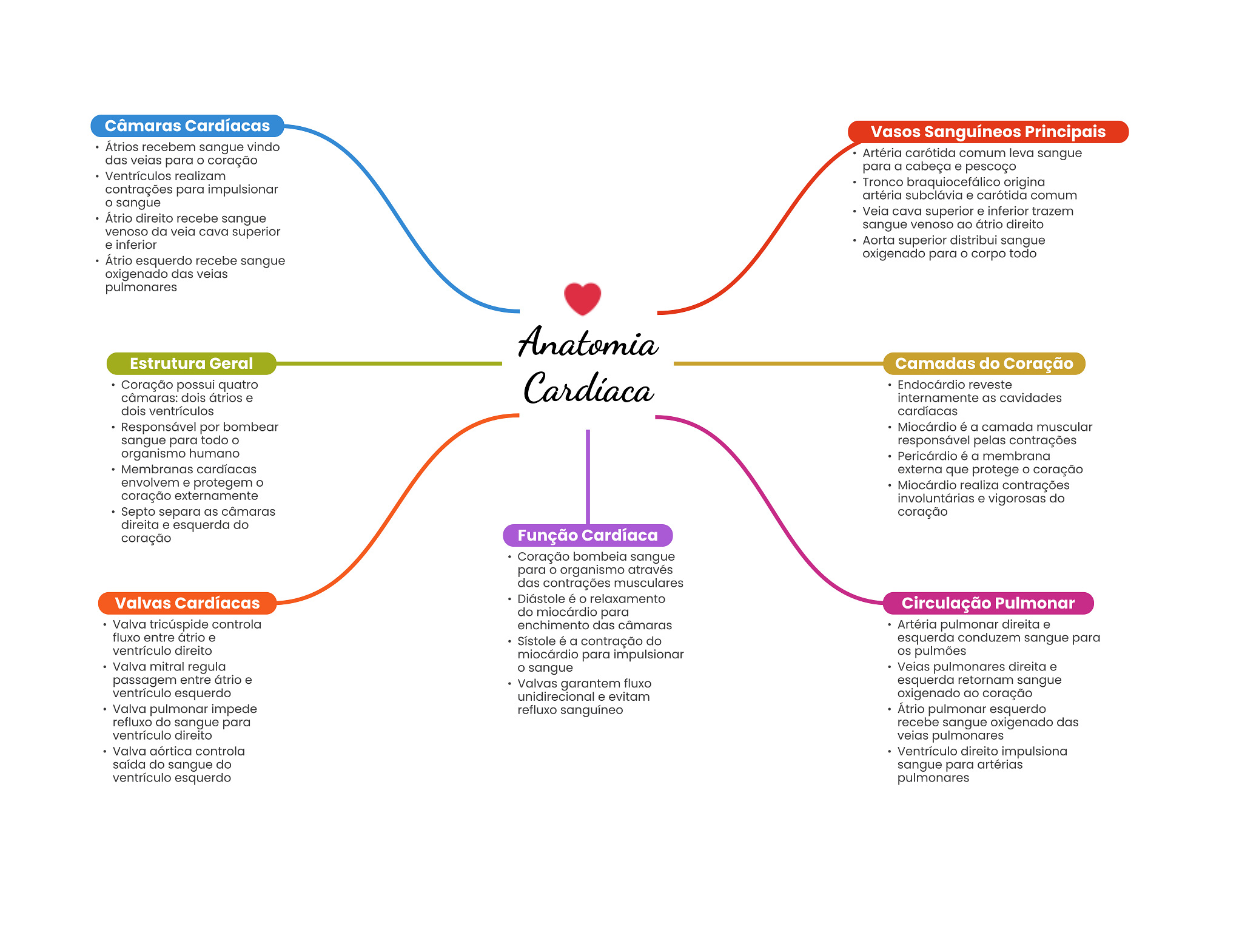 Câmaras Cardíacas Vasos Sanguíneos Principais Átrios recebem sangue vindo Artéria carótida comum leva sangue das veias para coração para a cabeça e pescoço Ventrículos realizam contrações para impulsionar Tronco braquiocefálico origina artéria subclávia e carótida comum sangue Átrio direito recebe sangue Veia cava superior e inferior trazem venoso da veia cava superior sangue venoso ao átrio direito e inferior Aorta superior distribui sangue Átrio esquerdo recebe sangue oxigenado para corpo todo oxigenado das veias pulmonares Anatomia Estrutura Geral Camadas do Coração Coração possui quatro Cardíaca Endocárdio reveste câmaras: dois átrios e internamente as cavidades dois ventrículos cardíacas Responsável por bombear Miocárdio é a camada muscular sangue para todo responsável pelas contrações organismo humano Pericárdio é a membrana Membranas cardíacas externa que protege coração envolvem e protegem O Miocárdio realiza contrações coração externamente involuntárias e vigorosas do Septo separa as câmaras coração direita e esquerda do coração Função Cardíaca Coração bombeia sangue para O organismo através das contrações musculares Valvas Cardíacas Diástole é O relaxamento do miocárdio para Circulação Pulmonar Valva tricúspide controla enchimento das câmaras Artéria pulmonar direita e fluxo entre átrio e Sistole é a contração do esquerda conduzem sangue para ventrículo direito miocárdio para impulsionar OS pulmões Valva mitral regula O sangue Veias pulmonares direita e passagem entre átrio e Valvas garantem fluxo esquerda retornam sangue ventrículo esquerdo unidirecional e evitam oxigenado ao coração Valva pulmonar impede refluxo sanguíneo Átrio pulmonar esquerdo refluxo do sangue para recebe sangue oxigenado das ventrículo direito veias pulmonares Valva aórtica controla Ventrículo direito impulsiona saída do sangue do sangue para artérias ventrículo esquerdo pulmonares