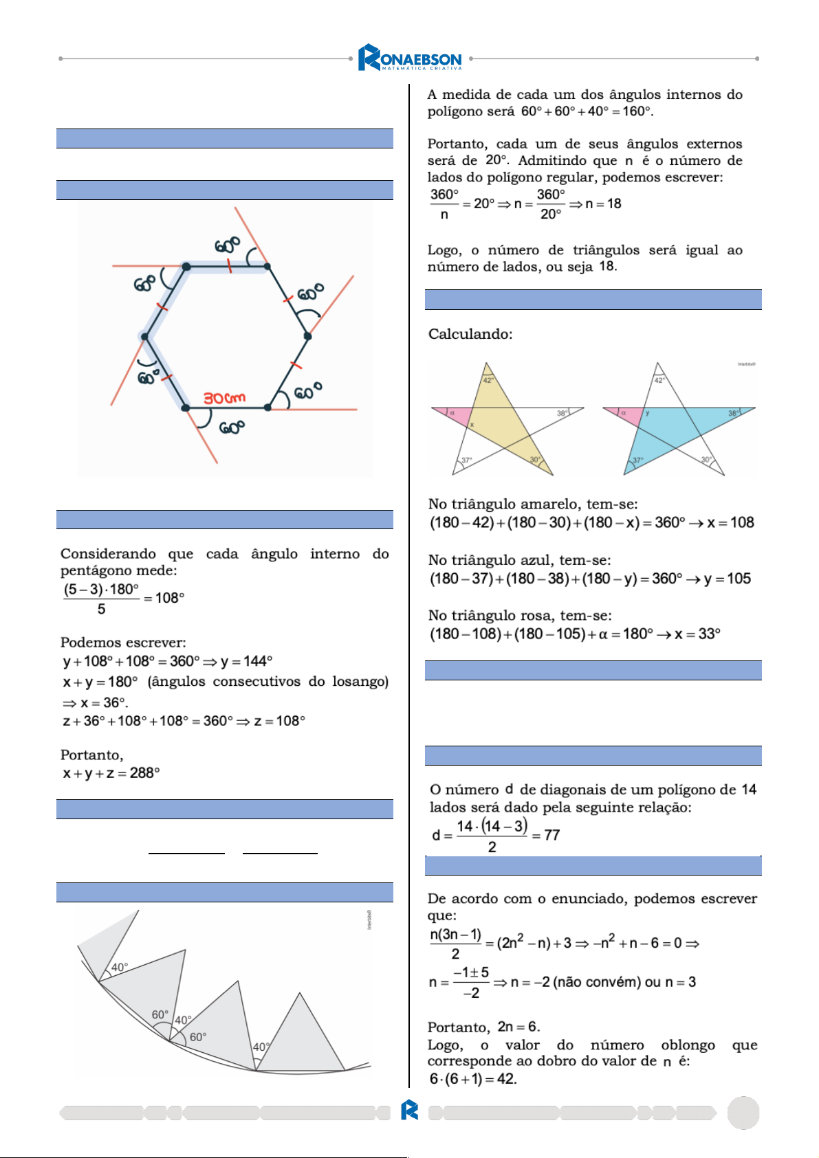 1 Capítulo 27: Polígonos Resposta da questão 01: [C] Resposta da questão 02: [D] 30 ∙ 6 = 180 𝑐𝑚 Resposta da questão 03: [B] Resposta da questão 04: [B] Â𝑛𝑔𝑢𝑙𝑜 = (𝑛 − 2) ∙ 180 𝑛 = (5 − 2) ∙ 180 5 = 108° Resposta da questão 05: [E] Resposta da questão 06: [B] Resposta da questão 07: [B] Sendo o polígono da figura um heptágono, a resposta é 180°× (7 − 2) = 900° Resposta da questão 08: [A] Resposta da questão 09: [D] 2 Resposta da questão 10: [D] Resposta da questão 11: [A] Sabendo que um dodecágono possui doze lados, temos Resposta da questão 12: [B] Resposta da questão 13: [B] Calculando a soma dos ângulos internos de cada polígono, temos: 180° × (𝑛 − 2 − 2) + 180° × (𝑛 − 2) + 180°(𝑛 + 2 − 2) = 2160° Dividindo os dois membros da igualdade por 180°, temos: 𝑛 − 4 + 𝑛 − 2 + 𝑛 = 12 → 3𝑛 = 18 → 𝑛 = 6 Portanto, 𝑛 − 2 = 4 e o polígono com o menor número de lados é um quadrilátero. Resposta da questão 14: [E] Resposta da questão 15: [B] Resposta da questão 16: [E] 𝛼 + 𝛽 + 𝛾 + 𝛿 + 180 = (𝑛 − 2) ∙ 180 𝛼 + 𝛽 + 𝛾 + 𝛿 + 180 = (6 − 2) ∙ 180 𝛼 + 𝛽 + 𝛾 + 𝛿 + 180 = 540° Resposta da questão 17: [ 𝑇 = 2𝑛 + 3 ] Soma dos ângulos internos de um pentágono: 180°(5 − 2) = 540° Ao redor de cada bolha temos 360° Seja 𝑇 o número de triângulos e 𝑛 o número de bolhas, temos a seguinte relação: 𝑇 × 180° − 𝑛 × 360° = 540°(: 180°) 𝑇 − 2𝑛 = 3 𝑇 = 2𝑛 + 3 3 Resposta da questão 18: [E] Â𝑛𝑔𝑢𝑙𝑜 "#$%&#' = (𝑛 − 2) ∙ 180 𝑛 = (7 − 2) ∙ 180 7 ≅ 128,5° Â𝑛𝑔𝑢𝑙𝑜 ()$%&#' = 180 − 128,5 = 51,43° ≅ 51° Resposta da questão 19: [C] A soma dos ângulos internos de um polígono de 𝑛 lados é sempre 360°, daí, temos: 𝑛 × 15° = 360° → 𝑛 = 24 Logo, o número de diagonais de um polígono de 24 lados será dado por: Resposta da questão 20: [E] Do texto, as peças do Tangram são dois quadriláteros e cinco triângulos, pois tanto o quadrado quanto o paralelogramo são quadriláteros Resposta da questão 21: [C] Como trata-se de um polígono regular, a soma dos ângulos internos será igual a 144° × 𝑛, sendo 𝑛 o número de lados do polígono. Pela fórmula da soma dos ângulos internos, tem-se: 𝑆 = 144𝑛 = 180 × (𝑛 − 2) 144𝑛 − 180𝑛 = −360 36𝑛 = 360 → 𝑛 = 10 Sabendo que o polígono tem n = 10 lados, aplica-se a fórmula do número de diagonais: Resposta da questão 22: [C] 2𝛽 + 180° = 180° → 2𝛽 = 72 → 𝛽 = 36° 2𝛽 + 𝛼 = 108° → 2 ∙ 36 + 𝛼 = 180° 𝛼 = 108° − 72° → 𝛼 = 36° Resposta da questão 23: [C] 10 ∙ 5 = 50 50 − 10(𝑖𝑛𝑡𝑒𝑟𝑠𝑒çõ𝑒𝑠) = 40 40 ∙ 10𝑔 = 400𝑔 400 24 ∙ 8 = 300𝑔 Resposta da questão 24: [D] 3 ∙ (â𝑛𝑔𝑢𝑙𝑜 𝑖𝑛𝑡𝑒𝑟𝑛𝑜 𝑑𝑜 𝑝𝑒𝑛𝑡á𝑔𝑜𝑛𝑜) + 𝜃 = 360° 3 ∙ 108 + 𝜃 = 360 𝜃 = 36° Resposta da questão 25: [C] 4 Resposta da questão 26: [B] Resposta da questão 27: [B] Resposta da questão 28: [A] Resposta da questão 29: [A] Resposta da questão 30: [C] Resposta da questão 31: [C] 5 Resposta da questão 32: [A] Resposta da questão 33: [A] Do exposto, temos: Assim, a área do pentágono hachurado é igual a área do triângulo ABC menos a soma das áreas dos triângulos AFG e CDE, assim: 𝐴*%#$á,'#' = 8 ⋅ 8 2 − f 3 ⋅ 3 2 − 5√2 2 ⋅ 5√22 2 h 𝐴*%#$á,'#' = 32 − (4,5 + 6,25) = 21,25 𝑐𝑚- Resposta da questão 34: [C] 𝑥- = (2ℎ)- + (6)- 𝑥- = k2√3l - + 36 𝑥- = 12 + 36 𝑥 = √48 → 𝑥 = 4√3 Resposta da questão 35: [B] Resposta da questão 36: [B] Á𝑟𝑒𝑎 𝑚𝑒𝑛𝑜𝑟 = 6 ∙ 𝑙-√3 4 = 6 ∙ 1 ∙ √3 4 = 3√3 2 Á𝑟𝑒𝑎 𝑚𝑎𝑖𝑜𝑟 = 6 ∙ 𝑙-√3 4 = 6 ∙ 9 ∙ √3 4 = 27√3 2 27√3 2 − 3√3 2 = 24√3 2 = 12√3 6 Resposta da questão 37: [B] Calculando a medida do ângulo interno do pentágono regular: 5 × 𝑒 = 360° → 𝑒 = 72° Logo, a medida de seu ângulo interno será: 180° − 72° = 108° Calculando a medida do ângulo interno do hexágono regular: 6 × 𝑒 = 360° → 𝑒 = 60° Logo, a medida de seu ângulo interno será: 180° − 60° = 120° 𝑥 + 108° + 2 × 120° = 360° → 𝑥 = 12° Resposta da questão 38: [C] Resposta da questão 39: [A] Resposta da questão 40: [D] Resposta da questão 41: [B] Resposta da questão 42: [C] Um hexágono regular possui lado igual ao raio da circunferência a qual está inscrito. Assim, o comprimento do muro será igual ao diâmetro, ou 24 metros. Pode- se desenhar: Resposta da questão 43: [A] 7 Resposta da questão 44: [C] Resposta da questão 45: [A] Resposta da questão 46: [B] Resposta da questão 47: [D] Resposta da questão 48: [C] O hexágono regular da figura pode ser decomposto em 6 triângulos congruentes, como mostra a figura abaixo. Como os triângulos são congruentes, eles possuem a mesma área, o que nos permite concluir que a área pedida corresponde a metade da área do hexágono regular. Resposta da questão 49: [E] 8 Resposta da questão 50: [A] 𝜃 = 360° 6 = 60° Resposta da questão 51: [D] Resposta da questão 52: [D] 𝑄𝑢𝑎𝑑𝑟𝑎𝑑𝑜 → 5- ∙ 6 = 150 𝑇𝑟𝑖â𝑛𝑔𝑢𝑙𝑜 → 6 ∙ 5-√3 4 = 75√3 2 𝐻𝑒𝑥á𝑔𝑜𝑛𝑜 → 6 ∙ 5-√3 4 = 75√3 2 𝐴. = 150 + 75√3 2 + 75√3 2 𝐴. = 150 + 75√3 Resposta da questão 53: [A] Resposta da questão 54: [C] 9 Resposta da questão 55: [C] Resposta da questão 56: [E] 𝑎 + 8 + 𝑎 = 19,4 → 𝑎 = 5,7 𝑚 𝐴. = 4 ∙ 𝐼 + 2 ∙ 𝐼𝐼 + 1 ∙ 𝐼𝐼𝐼 𝐴. = 4 ∙ s 5,7 ∙ 5,7 2 t + 2 ∙ (8 ∙ 5,7) + 1 ∙ (8 ∙ 19,4) 𝐴. = 64,98 + 91,2 + 155,2 𝐴. = 311,38 𝑚- Resposta da questão 57: [C] Resposta da questão 58: [E] Resposta da questão 59: [C] Resposta da questão 60: [D]