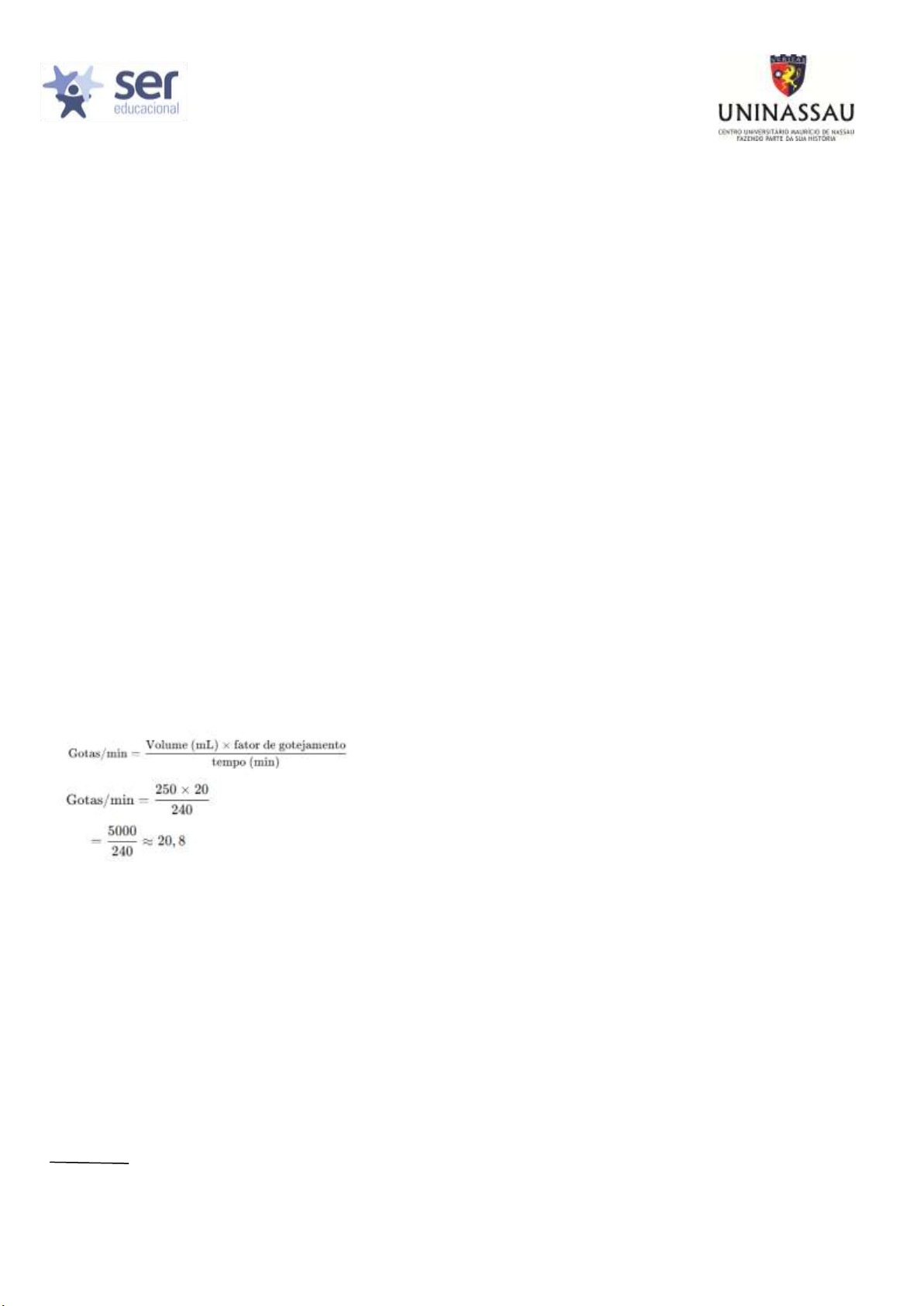 CENTRO UNIVERSITÁRIO MAURÍCIO DE NASSAU - UNINASSAU CURSO DE GRADUAÇÃO EM ENFERMAGEM DISCIPLINA: TÓPICOS INTEGRADORES III 3ª ATIVIDADE – ESTUDO DIRIGIDO CÁLCULO E ADMINISTRAÇÃO DE MEDICAMENTOS 1- (OMNI – 2021) Para uma criança em hipoglicemia, o médico prescreveu 4,2 mL de glicose de uma ampola de glicose 50%/20 mL. Qual a dosagem de glicose prescrita? A 2000 mg. B 2100 mg. C 2150 mg. D 2250 mg. RESPOSTA LETRA B Uma solução de glicose 50% significa: 50 g de glicose em 100 mL de solução Ou seja: 0,5 g por mL O médico prescreveu 4,2 mL. Agora multiplicamos: 4,2× ×0,5=2,1 g 2- (UNIFIL – 2021) Diante de uma prescrição médica com 250ml de uma solução, para correr em 4 horas, assinale a alternativa que apresenta o gotejamento aproximado que a solução deverá ser instalada. A 10 gotas por minuto B 21 gotas por minuto C 42 gotas por minuto D 63 gotas por minuto RESPOSTA LETRA B Volume = 250 mL Tempo = 4 horas = 240 minutos Fator = 20 gotas/mL 3- (UNIFIL – 2021) Utilizando-se o frasco de 5.000.000U de penicilina cristalina, após diluição do frasco com 8 ml de água destilada, assinale a alternativa que apresenta o volume que deverá ser administrado para seguir uma prescrição de 4.000.000U. A 4,8ml B 6,4ml C 8ml D 12ml RESPOSTA LETRA C Temos: Frasco: 5.000.000 U Diluição: 8 mL + 2ml = 10 ml Então a concentração fica: 5.000.000 = 500.000 10 Prescrição: 4.000.000 U Agora: CENTRO UNIVERSITÁRIO MAURÍCIO DE NASSAU - UNINASSAU CURSO DE GRADUAÇÃO EM ENFERMAGEM DISCIPLINA: TÓPICOS INTEGRADORES III 3ª ATIVIDADE – ESTUDO DIRIGIDO Volume= 4.000.000 = 8 ml 500.000 4- (OMNI – 2021) 10 mg de dexametasona foram diluídas em 50 mL de soro fisiológico. Dessa solução, a prescrição médica é de infusão de, apenas, 32 mL. Qual dosagem de dexametasona o paciente receberá? A 0,8 mg. B 4,5 mg. C 6,4 mg. D 32 mg. RESPOSTA LETRA C Temos: 10 mg em 50 mL Então: Volume prescrito: 32 mL 32×0,2=6,4 mg 5- (IMPARH – 2021) Carlos, 32 anos, tinha em sua prescrição Penicilina Cristalina 2.000.000 UI EV, de 4 em 4 horas. Há na unidade apenas FA de 5.000.000UI. Quantos mililitros devem ser administrados no paciente, se foi utilizado 8 ml para diluição? A. 3,2 ml. B. 4 ml. C. 3,5 ml. D. 4,2 ml. RESPOSTA LETRA B Dados do problema: Prescrição: 2.000.000 UI Frasco disponível: 5.000.000 UI Diluição feita com: 8 mL 8 ml + 2ml=10ml Se 5.000.000 UI estão em 8 mL, então: 5.000.000 Então a concentração fica: 5.000.000 = 500.000 10 Prescrição: 2.000.000 U Agora: Volume= 2.000.000 = 4 ml 500.000 6- (UNIOESTE – 2021) Está prescrito, para um paciente, 1500mg de Cefalotina. A farmácia dispensa ao paciente dois frascos de 1g de Cefalotina. O membro da equipe de enfermagem responsável por administrar a+ medicação no paciente dilui os dois frascos de Cefalotina em 10 mL. Quantos mL serão administrados no paciente? A. 2,5 ml. B. 7,5 ml. C. 10 ml. D. 3 ml. RESPOSTA CENTRO UNIVERSITÁRIO MAURÍCIO DE NASSAU - UNINASSAU CURSO DE GRADUAÇÃO EM ENFERMAGEM DISCIPLINA: TÓPICOS INTEGRADORES III 3ª ATIVIDADE – ESTUDO DIRIGIDO LETRA B 1. Quantidade disponível: Foram dispensados 2 frascos de 1 g cada → total = 2 g = 2000 mg 2. Diluição: Os 2000 mg foram diluídos em 10 mL 3. Concentração resultante: 2000 mg → 10 mL Logo: 200 mg por 1 mL 4. Dose prescrita: O paciente precisa de 1500 mg 5. Cálculo do volume a administrar: 7-(MS CONCURSOS – 2021) Você trabalha no setor de clínica cirúrgica, prepara-se para administrar a seguinte prescrição: 30mg de dipirona EV. O paciente perdeu o acesso venoso e está difícil puncionar um novo. Ao comunicar o médico, o mesmo modifica via de administração para VO, na prescrição. Na instituição, está disponível, somente frasco em gotas com 15mg/mL. Sendo assim, quantas gotas serão necessárias? A. 120 B. 100 C. 60 D. 40 RESPOSTA LETRA D 1. Dose prescrita: 30 mg de dipirona VO 2. Apresentação disponível: 15 mg/mL 3. Calcular o volume necessário: 4. Converter mL em gotas: Regra geral: 1 mL = 20 gotas 2 mL×20=40gotas 8- (MS CONCURSO – 2021) Ao preparar a seguinte prescrição: SG 15% 500 ml + SG 50% 40 ml + KCl 10% 10 ml, na vazão de 40 gts/min e levá-la para ser administrada, o seu paciente ansioso, pergunta quanto tempo levará para finalizar esse soro, pois já está de alta, e quer muito ir para casa, você prontamente calcula o tempo e o informa que levará exatamente: A. 5 horas e 30 minutos. B. 5 horas e 15 minutos. C. 4 horas e 35 minutos. D. 4 horas e 05 minutos. RESPOSTA LETRA C 1. Volume total da solução: SG 15% = 500 mL SG 50% = 40 mL CENTRO UNIVERSITÁRIO MAURÍCIO DE NASSAU - UNINASSAU CURSO DE GRADUAÇÃO EM ENFERMAGEM DISCIPLINA: TÓPICOS INTEGRADORES III 3ª ATIVIDADE – ESTUDO DIRIGIDO KCl 10% = 10 mL Total: 500+40+10=550 ml 2. Vazão: 40 gotas/min Considerando equipo macrogotas: 1 mL = 20 gotas 3. Converter gotas/min para mL/min: Calcular o tempo: 5. Converter para horas: 275 min = 4 horas e 35 minutos 9- (FUNDATEC -2021) Assinale a alternativa correta relacionada à dosagem a ser administrada, conforme a seguinte prescrição: Tramadol 60 mg com apresentação em ampola de 3 ml (25 mg/ml). A. 3,00 ml. B. 6,4 ml. C. 2,4 ml. D. 2,0 ml. RESPOSTA LETRA C 1. Concentração disponível: 25 mg/mL 2. Dose prescrita: 60 mg 3. Calcular o volume necessário: 10- (FUNDATEC – 2021) Para administrar 500 ml de soro glicosado a 5% em 12 horas, considerando o arredondamento padrão, o cálculo do gotejamento deverá ser de: A. 10 gotas/min. B. 14gotas/min. C. 13 gotas/min. D. 12 gotas/min. RESPOSTA LETRA C 1. Volume total: 500 mL 2. Tempo: 12 horas = 720 minutos 3. Fórmula do gotejamento (macrogotas): CENTRO UNIVERSITÁRIO MAURÍCIO DE NASSAU - UNINASSAU CURSO DE GRADUAÇÃO EM ENFERMAGEM DISCIPLINA: TÓPICOS INTEGRADORES III 3ª ATIVIDADE – ESTUDO DIRIGIDO Arredondamento: 14 gotas/min 11- UNIRIO (2017) Foi prescrito preparar 500 ml de KMnO4a 1:10.000, usando comprimidos de KMnO4 de 50 mg. Ser