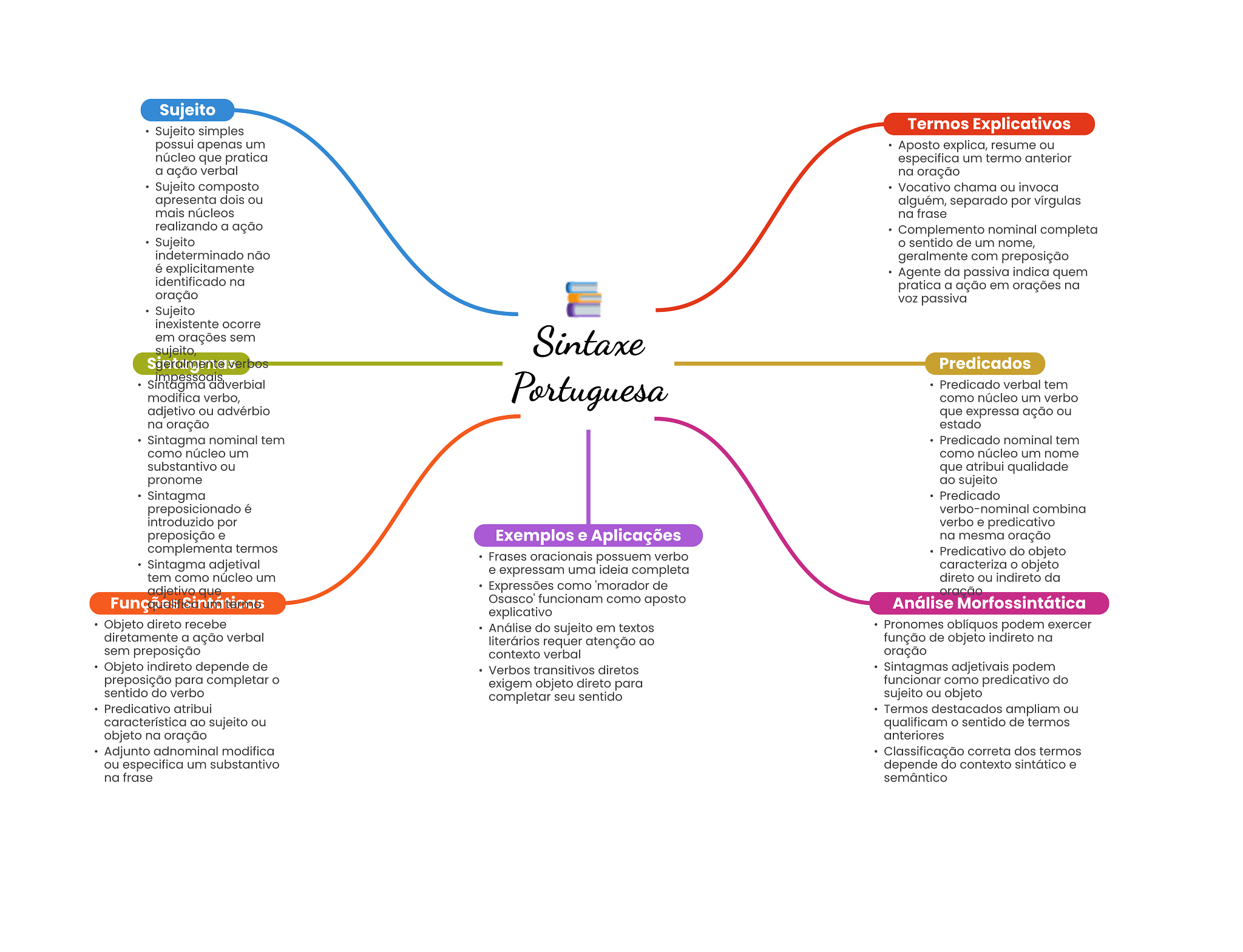 Sujeito Sujeito simples Termos Explicativos possui apenas um Aposto explica, resume ou núcleo que pratica especifica um termo anterior a ação verbal na oração Sujeito composto Vocativo chama ou invoca apresenta dois ou alguém, separado por vírgulas mais núcleos na frase realizando a ação Complemento nominal completa Sujeito O sentido de um nome, indeterminado não geralmente com preposição é explicitamente Agente da passiva indica quem identificado na pratica a ação em orações na oração passiva Sujeito inexistente ocorre em orações sem sujeito, Sintaxe bos Predicados Sintagma adverbial modifica verbo, Portuguesa Predicado verbal tem como núcleo um verbo adjetivo ou advérbio que expressa ação ou na oração estado Sintagma nominal tem Predicado nominal tem como núcleo um como núcleo um nome substantivo ou que atribui qualidade pronome ao sujeito Sintagma Predicado preposicionado é verbo-nominal combina introduzido por verbo e predicativo preposição e Exemplos e Aplicações na mesma oração complementa termos Frases oracionais possuem verbo Predicativo do objeto Sintagma adjetival e expressam uma ideia completa caracteriza objeto tem como núcleo um direto ou indireto da adjetivo que Expressões como 'morador de Osasco funcionam como aposto Análise Morfossintática explicativo Objeto direto recebe Análise do sujeito em textos Pronomes oblíquos podem exercer diretamente a ação verbal literários requer atenção ao função de objeto indireto na sem preposição contexto verbal oração Objeto indireto depende de Verbos transitivos diretos Sintagmas adjetivais podem preposição para completar exigem objeto direto para funcionar como predicativo do sentido do verbo completar seu sentido sujeito ou objeto Predicativo atribui Termos destacados ampliam ou característica ao sujeito ou qualificam O sentido de termos objeto na oração anteriores Adjunto adnominal modifica Classificação correta dos termos ou especifica um substantivo depende do contexto sintático e na frase semântico