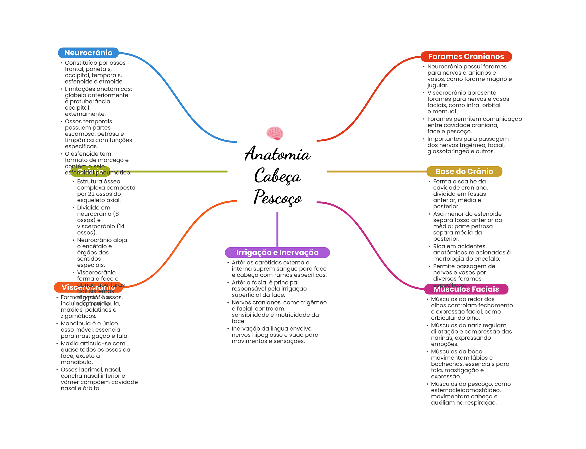 Neurocrânio Forames Cranianos Constituído por frontal, parietais, Neurocrânio possui forames occipital, temporais, para nervos cranianos e esfenoide e etmoide. vasos, como forame magno e jugular. Limitações anatômicas: glabela anteriormente Viscerocrânio apresenta e protuberância forames para nervos e vasos occipital faciais, como infra-orbital e mentual. externamente. Ossos temporais Forames permitem comunicação possuem partes entre cavidade craniana, escamosa, petrosa e face e pescoço. timpânica com funções Importantes para passagem específicas. dos nervos trigêmeo, facial, esfenoide tem Anatomia glossofaríngeo e outros. formato de morcego e contém seio esfenoidal Estrutura óssea Cabeça Base do Crânio Forma soalho da complexa composta cavidade craniana, por 22 OSSOS do esqueleto axial. Pescoço dividida em fossas anterior, média e Dividido em posterior. neurocrânio (8 Asa menor do esfenoide ossos) e separa fossa anterior da viscerocrânio (14 média; parte petrosa ossos). separa média da Neurocrânio aloja posterior. encéfalo e Rica em acidentes órgãos dos Irrigação e Inervação anatômicos relacionados à sentidos morfologia do encéfalo. Artérias carótidas externa e especiais. interna suprem sangue para face Permite passagem de Viscerocrânio forma a face e e cabeça com ramos específicos. nervos e vasos por diversos forames Viscero aberturas Artéria facial é principal responsável pela irrigação Músculos Faciais superficial da face. Músculos ao redor dos Nervos cranianos, como trigêmeo olhos controlam fechamento maxilas, palatinos e e facial, controlam sensibilidade e motricidade da e expressão facial, como zigomáticos. orbicular do olho. Mandíbula é único face. móvel, essencial Inervação da língua envolve Músculos do nariz regulam dilatação e compressão das para mastigação e fala. nervos hipoglosso e vago para Maxila articula-se com movimentos e sensações. narinas, expressando emoções. quase todos OS OSSOS da Músculos da boca face, exceto a movimentam lábios e mandíbula. bochechas, essenciais para Ossos lacrimal, nasal, fala, mastigação e concha nasal inferior e expressão. vômer compõem cavidade Músculos do pescoço, como nasal e órbita. esternocleidomastóideo, movimentam cabeça e auxiliam na respiração.