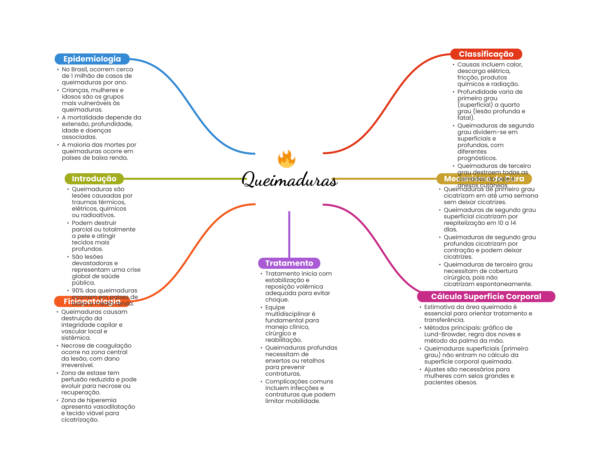 Classificação Epidemiologia Causas incluem calor, No Brasil, ocorrem cerca descarga elétrica, de 1 milhão de casos de fricção, produtos queimaduras por ano. químicos e radiação. Crianças, mulheres e Profundidade varia de idosos são OS grupos primeiro grau mais vulneráveis às (superficial) a quarto queimaduras. grau (lesão profunda e A mortalidade depende da fatal). extensão, profundidade, Queimaduras de segundo idade e doenças grau dividem-se em associadas. superficiais e A maioria das mortes por profundas, com queimaduras ocorre em diferentes países de baixa renda. prognósticos. Queimaduras de terceiro Introdução Queimaduras grau destroem todas as da anexos cutâneos Queimaduras são Queimaduras de primeiro grau lesões causadas por cicatrizam em até uma semana traumas térmicos, sem deixar cicatrizes. elétricos, químicos Queimaduras de segundo grau ou radioativos. superficial cicatrizam por Podem destruir reepitelização em 10 a 14 parcial ou totalmente dias. a pele e atingir Queimaduras de segundo grau tecidos mais profundas cicatrizam por profundos. contração e podem deixar São lesões cicatrizes. devastadoras e Tratamento Queimaduras de terceiro grau representam uma crise global de saúde Tratamento inicia com necessitam de cobertura pública. estabilização e cirúrgica, pois não reposição volêmica cicatrizam espontaneamente. 90% das queimaduras adequada para evitar países de choque. Cálculo Superfície Corporal Equipe Estimativa da área queimada é Queimaduras causam multidisciplinar é essencial para orientar tratamento e destruição da fundamental para transferência. integridade capilar e manejo clínico, vascular local e Métodos principais: gráfico de cirúrgico e Lund-Browder, regra dos noves e sistêmica. reabilitação. método da palma da mão. Necrose de coagulação Queimaduras profundas Queimaduras superficiais (primeiro ocorre na zona central necessitam de grau) não entram no cálculo da da lesão, com dano enxertos ou retalhos irreversível. superfície corporal queimada. para prevenir Zona de estase tem Ajustes são necessários para contraturas. perfusão reduzida e pode mulheres com seios grandes e Complicações comuns pacientes obesos. evoluir para necrose ou incluem infecções e recuperação. contraturas que podem Zona de hiperemia limitar mobilidade. apresenta vasodilatação e tecido viável para cicatrização.