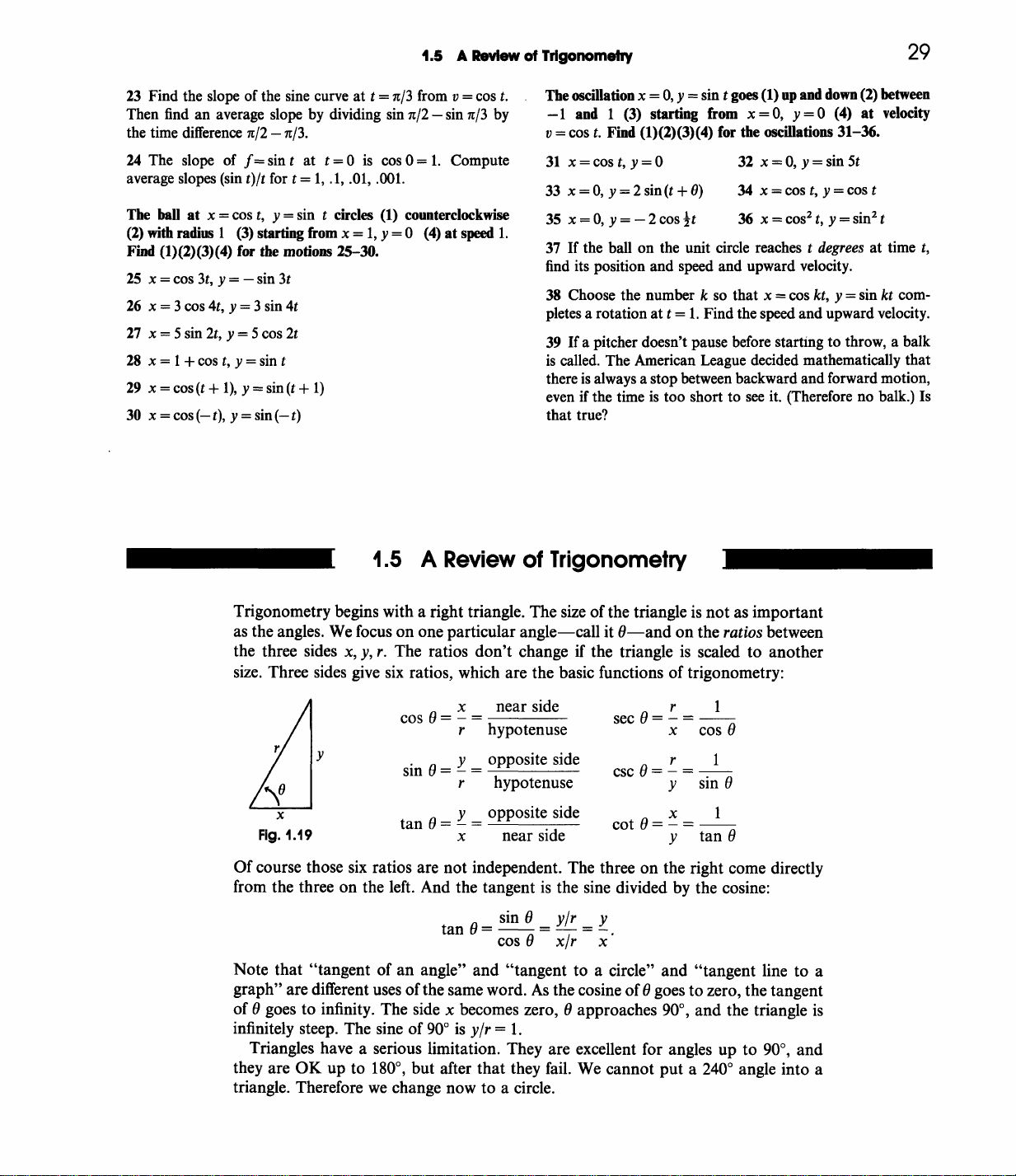 23 Find the slope of the sine curve at t = 4 3 from v = cos t. The oscillation x = 0, y = sin t goes (1)up and down (2)between Then find an average slope by dividing sin n/2 -sin 4 3 by -1 and 1 (3) starting from x = 0, y = 0 (4) at velocity the time difference 4 2 -43. v = cos t. Find (1)(2)(3)(4) for the oscillations 31-36. 24 The slope of f = sin t at t = 0 is cos 0 = 1. Compute 31 x=cost, y=O 32 x = 0, y = sin 5t average slopes (sin t)/t for t = 1, .l, .01, .001. 33 x=O, y=2sin(t+O) 34 x=cost, y=cost The ball at x = cos t, y = sin t circles (1) counterclockwise 35 x=O, y=-2cos i t 36 x=cos2t, y=sin2t (2)with radius 1 (3)starting from x = 1, y = 0 (4)at speed 1. Find (1)(2)(3)(4) for the motions 25-30. 37 If the ball on the unit circle reaches t degrees at time t, find its position and speed and upward velocity. 25 x=cos3t, y=-sin3t 38 Choose the number k so that x = cos kt, y = sin kt com- 26 x = 3 cos 4t, y = 3 sin 4t pletes a rotation at t = 1. Find the speed and upward velocity. 27 x = 5 sin 2t, y = 5 cos 2t 39 If a pitcher doesn't pause before starting to throw, a balk is called. The American League decided mathematically that there is always a stop between backward and forward motion, even if the time is too short to see it. (Therefore no balk.) Is 30 x =cos (- t), y = sin (- t) that true? 1.5 A Review of Trigonometry Trigonometry begins with a right triangle. The size of the triangle is not as important as the angles. We focus on one particular angle-call it 8-and on the ratios between the three sides x, y, r. The ratios don't change if the triangle is scaled to another size. Three sides give six ratios, which are the basic functions of trigonometry: n r 1 cos 8 = - x = near side set 8 = - = - r hypo tenuse x cos 8 sin 8 = - y = opposite side csc 8 = -r = -1 r hypotenuse y sin 8R X I y y opposite side x 1 tan 8 = - = cot g = - = - Fig. 1.19 x near side y tan 8 Of course those six ratios are not independent. The three on the right come directly from the three on the left. And the tangent is the sine divided by the cosine: Note that "tangent of an angle" and "tangent to a circle" and "tangent line to a graph" are different uses of the same word. As the cosine of 8 goes to zero, the tangent of 8 goes to infinity. The side x becomes zero, 8 approaches 90", and the triangle is infinitely steep. The sine of 90" is y/r = 1. Triangles have a serious limitation. They are excellent for angles up to 90°, and they are OK up to 180", but after that they fail. We cannot put a 240" angle into a triangle. Therefore we change now to a circle. 1 Introduction to Calculus Fig. 1.20 Trigonometry on a circle. Compare 2 sin 8 with sin 28 and tan 8 (periods 2n, n, n). Angles are measured from the positive x axis (counterclockwise). Thus 90" is straight up, 180" is to the left, and 360" is in the same direction as 0". (Then 450" is the same as 90°.) Each angle yields a point on the circle of radius r. The coordinates x and y of that point can be negative (but never r). As the point goes around the circle, the six ratios cos 8, sin 9, tan 8, .. . trace out six graphs. The cosine waveform is the same as the sine waveform-just shifted by 90". One more change comes with the move to a circle. Degrees are out. Radians are in. The distance around the whole circle is 2nr. The distance around to other points is Or. We measure the angle by that multiple 8. For a half-circle the distance is m, so the angle is n radians-which is 180". A quarter-circle is 4 2 radians or 90". The distance around to angle 8 is r times 8. When r = 1 this is the ultimate in simplicity: The distance is 8. A 45" angle is Q of a circle and 27118 radians-and the length of the circular arc is 27~18.Similarly for 1": 360" = 2n radians 1" = 27~1360radians 1 radian = 3601271 degrees. An angle going clockwise is negative. The angle -n /3 is -60" and takes us 4of the wrong way around the circle. What is the effect on the six functions? Certainly the radius r is not changed when we go to -8. Also x is not changed (see Figure 1.20a). But y reverses sign, because -8 is below the axis when +8 is above. This change in y affects y/r and y / x but not xlr: The cosine is even (no change). The sine and tangent are odd (change sign). The same point is 2 of the right way around. Therefore 2 of 2n radians (or 300") gives the same direction as -n /3 radians or -60". A diflerence of 2n makes no di$erence to x , y, r. Thus sin 8 and cos 8 and the other four functions have period 27~. We can go five times or a hundred times around the circle, adding 10n or 200n to the angle, and the six functions repeat themselves. EXAMPLE Evaluate the six trigonometric functions at 8 = 2n/3 (or 8 = -4 4 3 ) . This angle is shown in Figure 1.20a (where r = 1). The ratios are cos 8 = x/r = -1/2 sin 8 = y/r = &/2 tan 8 = y /x = -& sec e = - 2 csc e = 2/& cot e = -i/d Those numbers illustrate basic facts about the sizes of four functions: The tangent and cotangent can fall anywhere, as long as cot 8 = l/tan 8. 1.5 A Review of Ttlgonometry The numbers reveal more. The tangent -3 is the ratio of sine to cosine. The secant -2 is l/cos 8. Their squares are 3 and 4 (differing by 1). That may not seem remarkable, but it is. There are three relationships in the squares of those six numbers, and they are the key identities of trigonometry: Everything flows fvom the Pythagoras formula x2 + y2 = r2. Dividing by r2 gives ( ~ / r ) ~+ (y/r)2= 1. That is cos2 8+ sin28= 1. Dividing by x2 gives the second identity, which is 1 + ( y / ~ ) ~ Dividing by y2 gives the third. All three will be needed = ( r / ~ ) ~ . throughout the book-and the first one has to be unforgettable. DISTANCES AND ADDITION FORMULAS To compute the distance between points we stay with Pythagoras. The points are in Figure 1.21a. They are known by their x and y coordinates, and d is the distance between them. The third point completes a right triangle. For the x distance along the bottom we don't need help. It is x, - xl (or