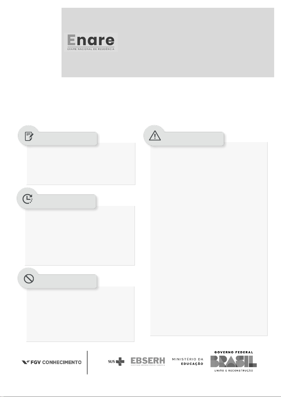 EXAME NACIONAL DE RESIDÊNCIA PROVA OBJETIVA – TARDE MULTIPROFISSIONAL FISIOTERAPIA TIPO 4 – AZUL • Além deste caderno contendo 100 (cem) questões objetivas, você receberá do fiscal de prova o cartão de respostas; • As questões objetivas têm 5 (cinco) opções de resposta (A, B, C, D e E) e somente uma delas está correta. • • Verifique se seu caderno de questões está completo, sem repetição de questões ou falhas. Caso contrário, notifique imediatamente o fiscal da sala, para que sejam tomadas as devidas providências; • Confira seus dados pessoais, especialmente nome, número de inscrição e documento de identidade e leia atentamente as instruções para preencher o cartão de respostas; • Para o preenchimento do cartão de respostas, use somente caneta esferográfica, fabricada em material transparente, com tinta preta ou azul; • Assine seu nome apenas no(s) espaço(s) reservado(s) no cartão de respostas; • Confira seu cargo, cor e tipo do caderno de questões. Caso tenha recebido caderno de cargo ou cor ou tipo diferente do impresso em seu cartão de respostas, o fiscal deve ser obrigatoriamente informado para o devido registro na ata da sala; • Reserve tempo suficiente para o preenchimento do seu cartão de respostas. O preenchimento é de sua responsabilidade e não será permitida a troca do cartão de respostas em caso de erro cometido pelo candidato; • Para fins de avaliação, serão levadas em consideração apenas as marcações realizadas no cartão de respostas; • A FGV coletará as impressões digitais dos candidatos na lista de presença; • Os candidatos serão submetidos ao sistema de detecção de metais quando do ingresso e da saída de sanitários durante a realização das provas. • Boa sorte! • Você dispõe de 5 (cinco) horas para a realização da prova, já incluído o tempo para a marcação do cartão de respostas; • 1 (uma) hora após o início da prova, é possível retirar-se da sala, sem levar o caderno de questões; • A partir dos 30 (trinta) minutos anteriores ao término da prova, é possível retirar-se da sala, levando o caderno de questões. • Qualquer tipo de comunicação entre os candidatos durante a aplicação da prova; • Anotar informações relativas às respostas em qualquer outro meio que não seja o caderno de questões; • Levantar da cadeira sem autorização do fiscal de sala; • Usar o sanitário ao término da prova, após deixar a sala. SUA PROVA TEMPO NÃO SERÁ PERMITIDO INFORMAÇÕES GERAIS EXAME NACIONAL DE RESIDÊNCIA FGV CONHECIMENTO MULTIPROFISSIONAL – FISIOTERAPIA – TARDE TIPO 4 AZUL – PÁGINA 2 Conhecimentos Gerais 1 A Reforma Sanitária Brasileira, gestada desde a década de 1970 e consolidada na década de 1980, desenvolveu-se em meio a disputas entre diferentes atores sociais, políticos e econômicos. Havia a expectativa de que a reorganização da sociedade após o fim do período autoritário poderia abrir caminho para que se erigisse a Saúde Pública sobre novas bases. Considerando os atores envolvidos nesse processo de reforma, cabe destacar o papel desempenhado (A) pelas grandes instituições hospitalares privadas, que assumiram a liderança política do processo de unificação dos sistemas de saúde existentes. (B) por setores empresariais e financeiros, que defenderam o financiamento integral do novo sistema público de saúde pelo Estado. (C) por movimentos sociais, que articularam propostas voltadas à universalização do acesso e à democratização das políticas públicas de saúde. (D) por corporações médicas tradicionais, que se colocaram à frente da formulação de políticas de descentralização e regionalização da saúde. (E) por setores do regime militar, que buscaram garantir a expansão dos serviços públicos de saúde sem romper com a lógica do mercado. 2 A Portaria nº 2.436/2017 do Ministério da Saúde estabelece as responsabilidades das esferas do governo no âmbito da Política Nacional de Atenção Básica (PNAB). Assinale a opção que exemplifica um caso em que uma dessas responsabilidades é violada. (A) A União direcionou parte maior de seus repasses financeiros relativos à cobertura de Atenção Básica para municípios com maior densidade populacional. (B) Um Estado estabeleceu metas de expansão da cobertura de serviços, priorizando inicialmente regiões metropolitanas e, em etapas posteriores, áreas rurais. (C) Equipes de Saúde utilizaram os sistemas oficiais de informação da Atenção Básica para monitorar atendimentos, analisar indicadores e planejar intervenções. (D) Um Município ampliou a infraestrutura de suas Unidades Básicas de Saúde (UBS), criando consultórios adicionais e adaptando gradualmente os espaços para atender melhor à população adscrita. (E) Conselhos Municipais de Saúde organizaram encontros periódicos com representantes da comunidade para discutir prioridades locais e avaliar o desempenho das equipes. 3 Relacione os princípios clássicos da bioética listados a seguir ao seu respectivo exemplo de violação. 1. Autonomia 2. Justiça 3. Não-maleficência 4. Beneficência ( ) Um paciente é submetido a um procedimento cirúrgico invasivo sem ter sido previamente informado sobre os riscos, as alternativas e as possíveis consequências. ( ) Uma equipe médica prescreve um medicamento cuja toxicidade já era conhecida e superior ao benefício terapêutico esperado para aquele caso. ( ) Em um hospital público, pacientes com convênios privados são sistematicamente priorizados em detrimento daqueles atendidos via SUS. ( ) Um médico decide manter um tratamento agressivo e doloroso a um paciente terminal, mesmo quando já se sabe que não há nenhum possível benefício. Assinale a opção que indica a relação correta, segundo a ordem apresentada. (A) 1, 3, 2 e 4. (B) 1, 4, 2 e 3. (C) 4, 2, 3 e 1. (D) 2, 4, 3 e 1. (E) 4, 3, 2 e 1. 4 A Política Nacional de Educação Permanent