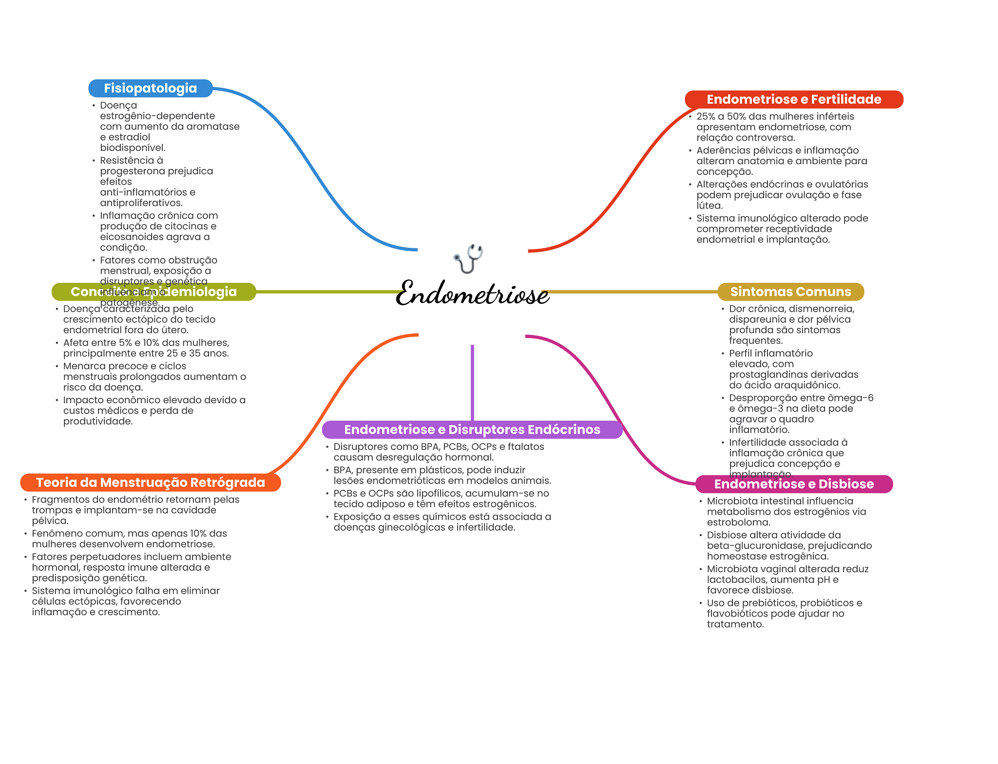 Fisiopatologia Endometriose e Fertilidade Doença estrogênio-dependente 25% a 50% das mulheres inférteis com aumento da aromatase apresentam endometriose, com e estradiol relação controversa. biodisponível. Aderências pélvicas e Resistência à alteram anatomia e ambiente para progesterona prejudica concepção. efeitos Alterações endócrinas e ovulatórias anti-inflamatórios e podem prejudicar ovulação e fase antiproliferativos. lútea. Inflamação crônica com Sistema imunológico alterado pode produção de citocinas e comprometer receptividade eicosanoides agrava a endometrial e implantação. condição. Fatores como obstrução menstrual, exposição a disruptores e genética e Epidemiologia Endometriose Sintomas Comuns patogênese pelo Dor crônica, dismenorreia, crescimento ectópico do tecido dispareunia e dor pélvica endometrial fora do útero. profunda são sintomas Afeta entre 5% e 10% das mulheres, frequentes. principalmente entre 25 e 35 anos. Perfil inflamatório Menarca precoce e ciclos elevado, com menstruais prolongados aumentam O prostaglandinas derivadas risco da doença. do ácido araquidônico. Impacto econômico elevado devido a Desproporção entre ômega-6 custos médicos e perda de e ômega-3 na dieta pode produtividade. agravar O quadro Endometriose e Disruptores Endócrinos inflamatório. Disruptores como BPA, PCBs, OCPs e ftalatos Infertilidade associada à causam desregulação hormonal. inflamação crônica que prejudica concepção e BPA, presente em plásticos, pode induzir implantação Teoria da Menstruação Retrógrada lesões endometrióticas em modelos animais. Endometriose e Disbiose PCBs e OCPs são lipofílicos, acumulam-se no Fragmentos do endométrio retornam pelas tecido adiposo e têm efeitos estrogênicos. Microbiota intestinal influencia trompas e implantam-se na cavidade Exposição a esses químicos está associada a metabolismo dos estrogênios via pélvica. estroboloma. doenças ginecológicas e infertilidade. Fenômeno comum, mas apenas 10% das Disbiose altera atividade da mulheres desenvolvem endometriose. beta-glucuronidase, prejudicando Fatores perpetuadores incluem ambiente homeostase estrogênica. hormonal, resposta imune alterada e Microbiota vaginal alterada reduz predisposição genética. lactobacilos, aumenta pH e Sistema imunológico falha em eliminar favorece disbiose. células ectópicas, favorecendo Uso de prebióticos, probióticos e inflamação e crescimento. flavobióticos pode ajudar no tratamento.