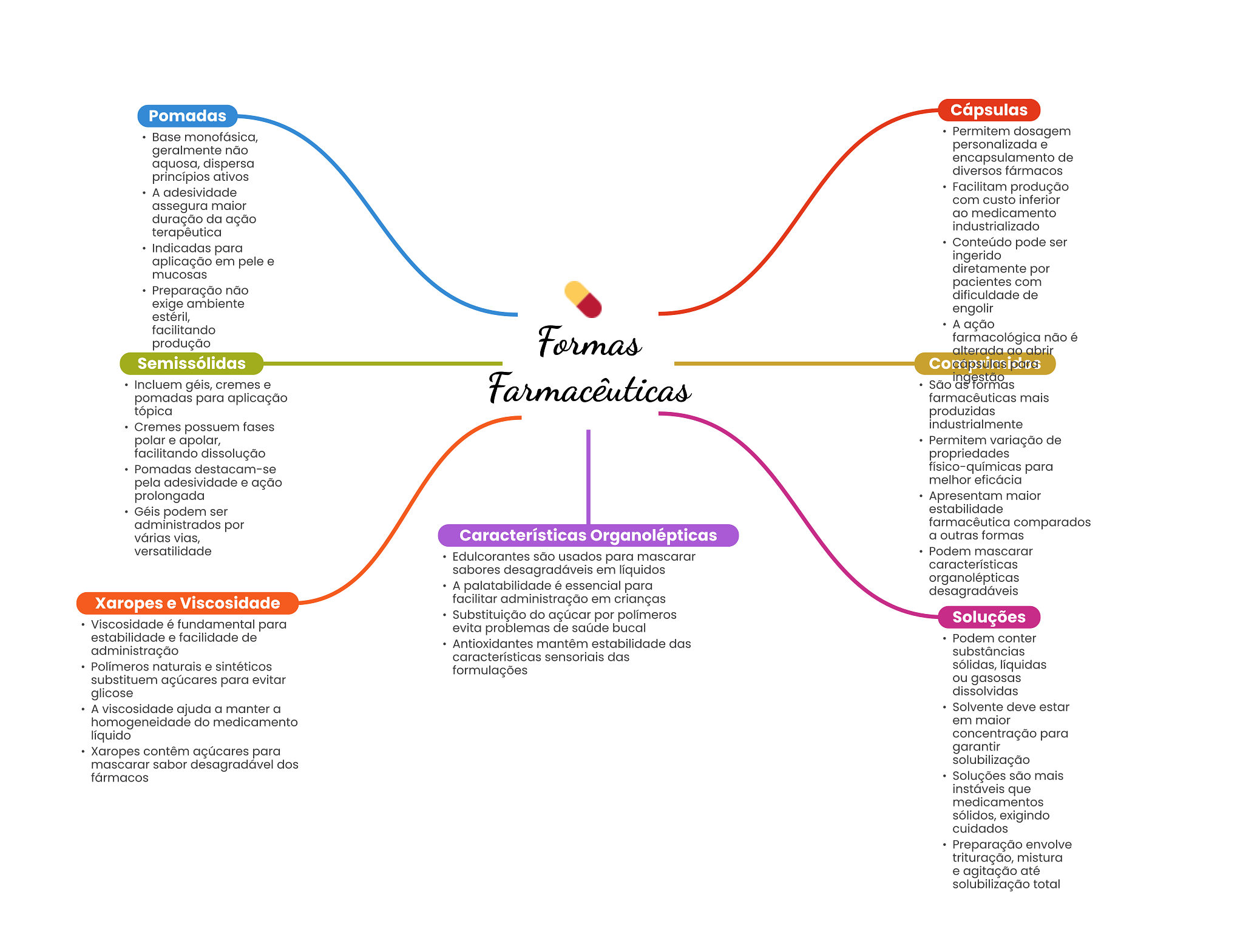 Pomadas Cápsulas Base monofásica, Permitem dosagem geralmente não personalizada e aquosa, dispersa encapsulamento de diversos fármacos princípios ativos A adesividade Facilitam produção com custo inferior assegura maior ao medicamento duração da ação industrializado terapêutica Indicadas para Conteúdo pode ser aplicação em pele e ingerido mucosas diretamente por pacientes com Preparação não dificuldade de exige ambiente engolir estéril, facilitando A ação produção Formas farmacológica não é alterada ao abrir Semissólidas para Incluem géis, cremes e Farmacêuticas ingestão São as formas pomadas para aplicação farmacêuticas mais tópica produzidas Cremes possuem fases industrialmente polar e apolar, Permitem variação de facilitando dissolução propriedades Pomadas destacam-se físico-químicas para pela adesividade e ação melhor eficácia prolongada Apresentam maior Géis podem ser estabilidade administrados por farmacêutica comparados várias vias, Características Organolépticas a outras formas versatilidade Podem mascarar Edulcorantes são usados para mascarar características sabores desagradáveis em líquidos organolépticas A palatabilidade é essencial para desagradáveis Xaropes e Viscosidade facilitar administração em crianças Substituição do açúcar por polímeros Viscosidade é fundamental para Soluções evita problemas de saúde bucal estabilidade e facilidade de Podem conter Antioxidantes mantêm estabilidade das administração características sensoriais das substâncias Polímeros naturais e sintéticos formulações sólidas, líquidas substituem açúcares para evitar ou gasosas glicose dissolvidas A viscosidade ajuda a manter a Solvente deve estar homogeneidade do medicamento em maior líquido concentração para Xaropes contêm açúcares para garantir mascarar sabor desagradável dos solubilização fármacos Soluções são mais instáveis que medicamentos sólidos, exigindo cuidados Preparação envolve trituração, mistura e até solubilização total
