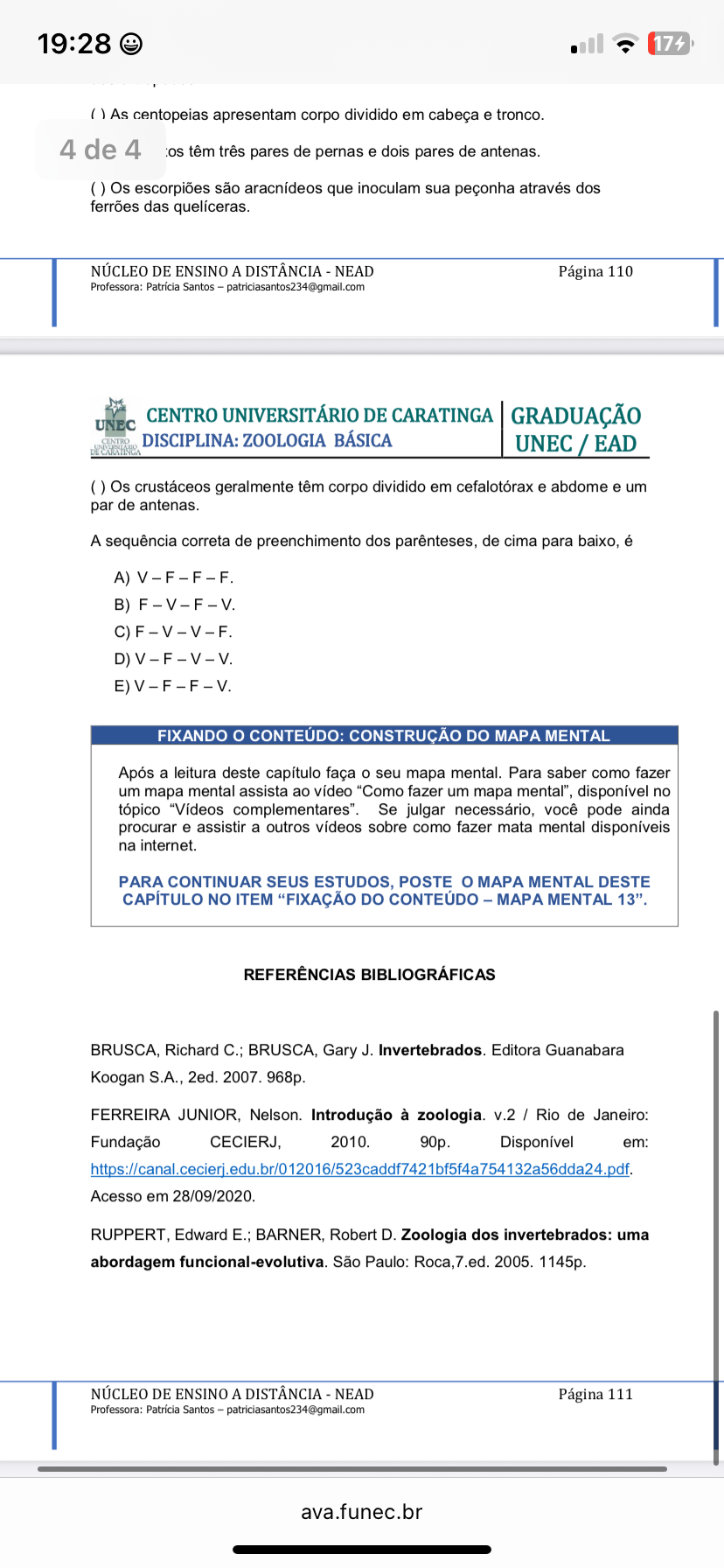 19:28 174 As centopeias apresentam corpo dividido em cabeça e tronco. 4 de 4 têm três pares de pernas e dois pares de antenas. () Os escorpiões são aracnídeos que inoculam sua peçonha através dos ferrões das quelíceras. NÚCLEO DE ENSINO A DISTÂNCIA NEAD Página 110 Professora: Santos patriciasantos234@gmail.com CENTRO UNIVERSITÁRIO DE CARATINGA UNEC GRADUAÇÃO DISCIPLINA: ZOOLOGIA BÁSICA UNEC / EAD () Os crustáceos geralmente têm corpo dividido em cefalotórax e abdome e um par de antenas. A sequência correta de preenchimento dos parênteses, de cima para baixo, é A)V-F-F-F. B) F-V-F-V. C)F-V-V-F. D) V F V V. E)V-F-F-V. FIXANDO CONTEÚDO: CONSTRUÇÃO DO MENTAL Após a leitura deste capítulo faça seu mapa mental. Para saber como fazer um mapa mental assista ao vídeo "Como fazer um mapa mental", disponível no tópico "Vídeos complementares". Se julgar necessário, você pode ainda procurar e assistir a outros vídeos sobre como fazer mata mental disponíveis na internet. PARA CONTINUAR SEUS ESTUDOS, POSTE o MENTAL DESTE CAPÍTULO NO ITEM "FIXAÇÃO DO CONTEÚDO MAPA MENTAL 13". REFERÊNCIAS BIBLIOGRÁFICAS BRUSCA, Richard C.; BRUSCA, Gary J. Invertebrados. Editora Guanabara Koogan S.A., 2ed. 2007. 968p. FERREIRA JUNIOR, Nelson. Introdução à zoologia. v.2 / Rio de Janeiro: Fundação CECIERJ, 2010. 90p. Disponível em: https://canal.cecierj.edu.br/012016/523caddf7421bf5f4a754132a56dda24.pdf. Acesso em 28/09/2020. RUPPERT, Edward BARNER, Robert D. Zoologia dos invertebrados: uma abordagem funcional-evolutiva. São Paulo: Roca,7.ed. 2005. 1145p. NÚCLEO DE ENSINO A DISTÂNCIA NEAD Página 111 Professora: Santos patriciasantos234@gmail.com ava.funec.br