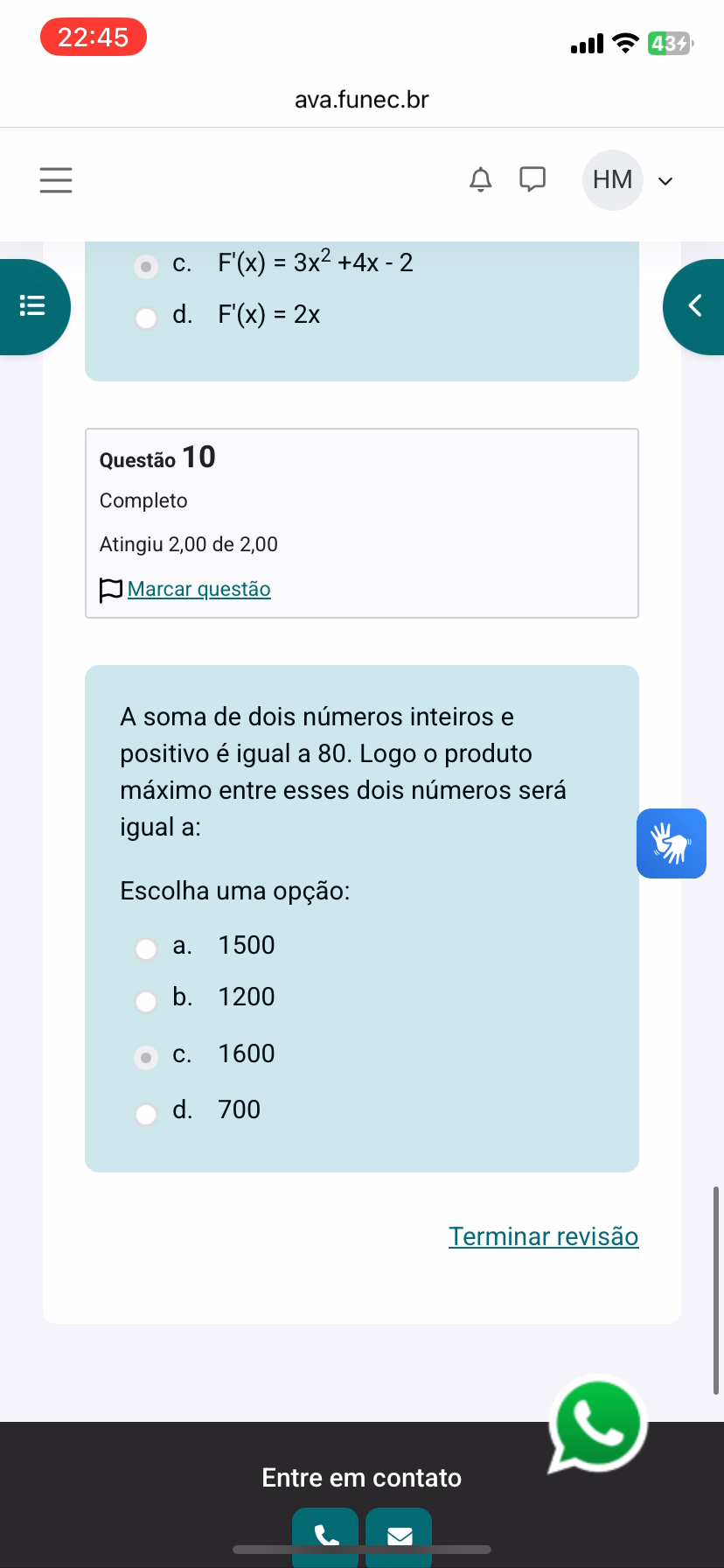 22:45 434 ava.funec.br HM !!! d. F'(x) = 2x Questão 10 Completo Atingiu 2,00 de 2,00 Marcar questão A soma de dois números inteiros e positivo é igual a 80. Logo o produto máximo entre esses dois números será igual a: Escolha uma opção: a. 1500 b. 1200 1600 d. 700 Terminar revisão Entre em contato