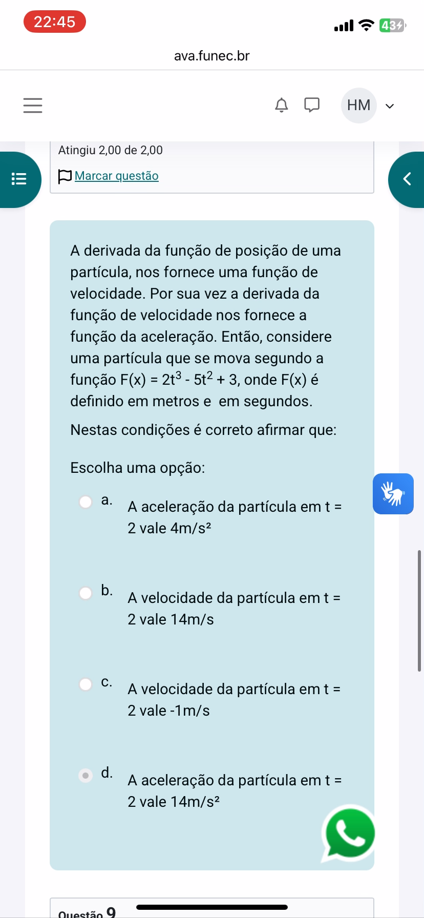 22:45 434 ava.funec.br HM Atingiu 2,00 de 2,00 Marcar questão A derivada da função de posição de uma partícula, nos fornece uma função de velocidade. Por sua vez a derivada da função de velocidade nos fornece a função da aceleração. Então, considere uma partícula que se mova segundo a função F(x) = 2t³ + 3, onde F(x) é definido em metros e em segundos. Nestas condições é correto afirmar que: Escolha uma opção: a. A aceleração da partícula em t = 2 vale b. A velocidade da partícula em t = 2 vale 14m/s A velocidade da partícula em t = 2 vale -1m/s d. A aceleração da partícula em t = 2 vale 9