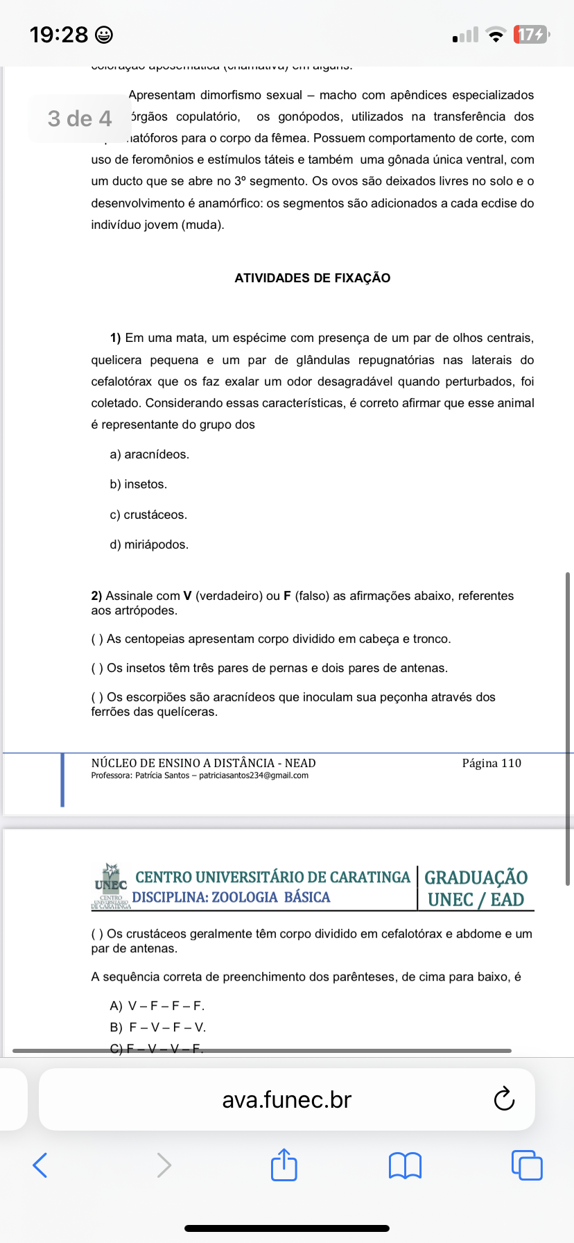 19:28 174 Apresentam dimorfismo sexual macho com apêndices especializados órgãos copulatório, gonópodos, utilizados na transferência dos para corpo da fêmea. Possuem comportamento de corte, com uso de feromônios e estímulos táteis e também uma gônada única ventral, com um ducto que se abre no 3° segmento. Os ovos são deixados livres no solo e desenvolvimento é anamórfico: segmentos são adicionados a cada ecdise do indivíduo jovem (muda). ATIVIDADES DE FIXAÇÃO 1) Em uma mata, um espécime com presença de um par de olhos centrais, quelicera pequena e um par de glândulas repugnatórias nas laterais do cefalotórax que faz exalar um odor desagradável quando perturbados, foi coletado. Considerando essas características, é correto afirmar que esse animal é representante do grupo dos a) aracnídeos. b) insetos. c) crustáceos. d) miriápodos. 2) Assinale com V (verdadeiro) ou F (falso) as afirmações abaixo, referentes aos artrópodes. As centopeias apresentam corpo dividido em cabeça e tronco. Os insetos têm três pares de pernas e dois pares de antenas. Os escorpiões são aracnídeos que inoculam sua peçonha através dos ferrões das quelíceras. NÚCLEO DE ENSINO A DISTÂNCIA NEAD Página 110 Professora: Santos patriciasantos234@gmail.com CENTRO UNIVERSITÁRIO DE CARATINGA UNEC GRADUAÇÃO DISCIPLINA: ZOOLOGIA BÁSICA UNEC / EAD Os crustáceos geralmente têm corpo dividido em cefalotórax e abdome e um par de antenas. A sequência correta de preenchimento dos parênteses, de cima para baixo, é A) V F - F - F. B) F V - F V. V V ava.funec.br
