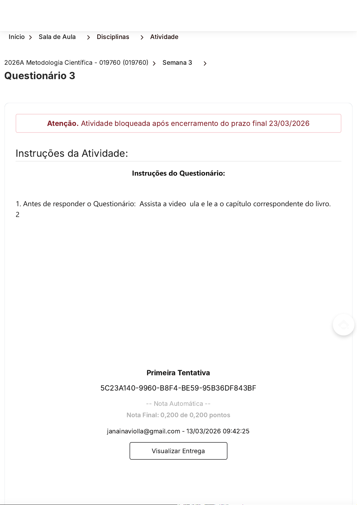 Início 〉 Sala de Aula 〉 Disciplinas 〉 Atividade 2026A Metodologia Científica - 019760 (019760) 〉 Semana 3 〉 Questionário 3 Instruções da Atividade: Instruções do Questionário: 1. Antes de responder o Questionário: Assista a videoaula e leia o capítulo correspondente do livro. 2. Abra o questionário somente quando for responder; 3. Ao abrir o questionário você terá 2 questões para responder; 4. Leia com calma todas as questões e entenda o que pede a questão: se pede a incorreta, a correta e qual o tema da questão; 5. Lembre-se de Clicar no botão "Enviar"; 6. Você tem duas tentativas para fazer o teste, a segunda tentativa é opcional; 7. As perguntas e alternativas podem ser diferentes e trocadas na segunda tentativa. Leia com atenção. 8. As respostas corretas só aparecem após o envio da segunda tentativa; 9. O sistema considera a maior nota entre as duas tentativas. 10. Na segunda tentativa zera TODAS as questões, inclusive as que você acertou na primeira tentativa. Bons estudos! Primeira Tentativa 5C23A140-9960-B8F4-BE59-95B36DF843BF -- Nota Automática -- Nota Final: 0,200 de 0,200 pontos janainaviolla@gmail.com - 13/03/2026 09:42:25 Visualizar Entrega Atenção. Atividade bloqueada após encerramento do prazo final 23/03/2026 https://ava.uca.edu.br/aluno/sala-de-aula/disciplina/modulo/atividade/682564 https://ava.uca.edu.br/aluno/sala-de-aula/disciplina/modulo/atividade/682564 https://ava.uca.edu.br/aluno/sala-de-aula/disciplina https://ava.uca.edu.br/aluno/sala-de-aula/disciplina/modulo/atividade/:id/:nome javascript:void(0); Atividade bloqueada em 23/03/2026 Perguntas Pergunta 1. Pergunta 2. pontos: 0,100Pergunta 1. Como passar dos anos a dialética foi perdendo espaço, como foi durante o processo de feudalismo em que nas sociedades feudais e no período da Idade Média a dialética passou a sofrer inúmeras derrotas e fico muito enfraquecida, pois durante aquele regime feudal as pessoas eram completamente dominadas pela ideologia das classes dominantes e o monopólio da igreja era muito forte a partir de que a dialética acabou se tornando praticamente sinônimo de lógica, o qual não fazia parte da estratificação da idade média e do feudalismo. Com tais mudanças, é necessário entendermos um pouco sobre as quatro leis fundamentais da dialética. Algumas delas são: Múltipla Escolha: A. Interpenetração e interpretação B. Método durkheimiano e análise neutra C. Método weberiano e análise sistemática D. Ação recíproca e mudança dialética Fazer Segunda Tentativa javascript:void(0); E. Metodologia dialética e análise reflexiva pontos: 0,100Pergunta 2. Aprendemos que uma pesquisa deve ser iniciada primeiramente com um levantamento bibliográfico sobre o tema a ser pesquisado, pois isso é primordial para que o pesquisador consiga definir melhor sua hipótese inicial, ou seu problema de pesquisa, assim como seja capaz de identificar o que já foi avaliado dentro do tema e, assim, definir sua metodologia de forma mais precisa. Entendemos que na pesquisa de campo as técnicas, bem como os métodos de coleta dos dados, são essenciais para que o pesquisador consiga fazer anotações de campo com o diário de campo. Dessa forma, os tipos de pesquisa de campo existentes são: Múltipla Escolha: A. Quantitativo-descritivo, exploratório e experimentais B. Dialética C. Documentais D. Técnicas e experimentais E. Observação participante Avaliação Nota Avaliada: 0,100 de 0,100 javascript:void(0); Fechar Visualização 〈 Voltar aos Módulos 〈 Anterior Próxima 〉 Avaliação Nota Avaliada: 0,100 de 0,100 Faculdade Católica Paulista Contato WhatsApp : (14) 9.8826-3000 Telefone Sede: (14) 3422-1815 Central de Atendimento: 0800 664 5583 E-mail : secretaria@uca.edu.br https://www.instagram.com/faculdadecatolicaead/ https://facebook.com/ucaead https://www.youtube.com/@UcaEduBr https://www.linkedin.com/school/faculdade-catolica-paulista/?originalSubdomain=br https://api.whatsapp.com/send?phone=5514988263000&text=Suporte tel:14-3422-1815 tel:14-3422-1815 tel:0800-664-5583 tel:0800-664-5583 mailto:secretaria@uca.edu.br javascript:void(0); Endereço Avenida Cristo Rei, 305 – Banzato Marília, São Paulo – CEP: 17515-200 Horário De Funcionamento Segunda a quinta, das 8:00 às 20:00 horas As sextas, das 8:00 às 18:00 horas. https://maps.app.goo.gl/wWsD9QX5fVPa3h6PA javascript:void(0);
