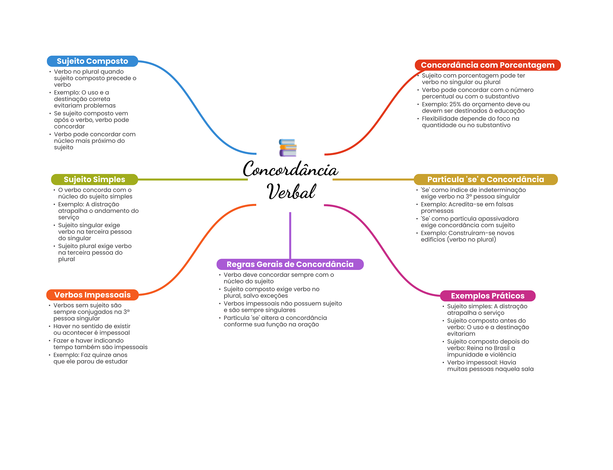 Sujeito Composto Concordância com Porcentagem Verbo no plural quando sujeito composto precede Sujeito com porcentagem pode ter verbo verbo no singular ou plural Exemplo: uso e a Verbo pode concordar com número destinação correta percentual ou com o substantivo evitariam problemas Exemplo: 25% do orçamento deve ou Se sujeito composto vem devem ser destinados à educação após verbo, verbo pode Flexibilidade depende do foco na concordar quantidade ou no substantivo Verbo pode concordar com núcleo mais próximo do sujeito Concordância Sujeito Simples Partícula 'se' e Concordância verbo concorda com O Verbal 'Se' como índice de indeterminação núcleo do sujeito simples exige verbo na pessoa singular Exemplo: A distração Exemplo: Acredita-se em falsas atrapalha andamento do promessas serviço 'Se' como partícula apassivadora Sujeito singular exige exige concordância com sujeito verbo na terceira pessoa Exemplo: novos do singular edifícios (verbo no plural) Sujeito plural exige verbo na terceira pessoa do plural Regras Gerais de Concordância Verbo deve concordar sempre com núcleo do sujeito Sujeito composto exige verbo no Verbos Impessoais plural, salvo exceções Exemplos Práticos Verbos sem sujeito são Verbos impessoais não possuem sujeito Sujeito simples: A distração sempre conjugados na e são sempre singulares atrapalha serviço pessoa singular Partícula 'se' altera a concordância Sujeito composto antes do Haver no sentido de existir conforme sua função na oração verbo: O uso e a destinação ou acontecer é impessoal evitariam Fazer e haver indicando Sujeito composto depois do tempo também são impessoais verbo: Reina no Brasil a Exemplo: Faz quinze anos impunidade e violência que ele parou de estudar Verbo impessoal: Havia muitas pessoas naquela sala