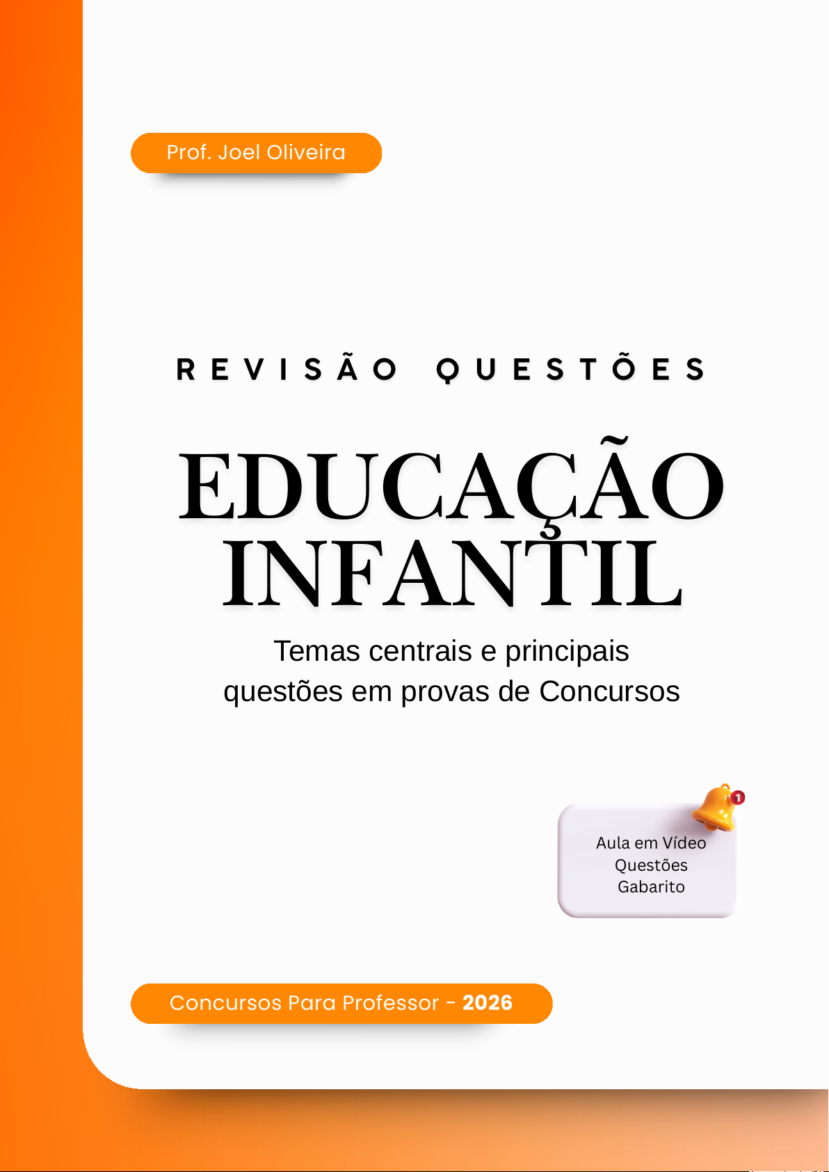 Concursos Para Professor - 2026 Prof. Joel Oliveira R E V I S Ã O Q U E S T Õ E S EDUCAÇÃO INFANTIL Aula em Vídeo Questões Gabarito Temas centrais e principais questões em provas de Concursos C O N C U R S O S P A R A P R O F E S S O R Concursos Para Professor Todos os direitos reservados. É proibida a reprodução total ou parcial desta obra sem autorização do autor. O rateio de material configura crime, pois viola o direito autoral (artigo 184 do Código Penal). Além de quem vende, o comprador também pode acabar enquadrado no crime de receptação (artigo 180). "Art. 184. Violar direitos de autor e os que lhe são conexos: Pena – detenção, de 3 (três) meses a 1 (um) ano, ou multa. § 1º Se a violação consistir em reprodução total ou parcial, com intuito de lucro direto ou indireto, por qualquer meio ou processo, de obra intelectual, interpretação, execução ou fonograma, sem autorização expressa do autor, do artista intérprete ou executante, do produtor, conforme o caso, ou de quem os represente: Pena – reclusão, de 2 (dois) a 4 (quatro) anos, e multa. CONFORME O CÓDIGO PENAL BRASILEIRO https://www.planalto.gov.br/ccivil_03/Decreto-Lei/Del2848.htm#art184 1 Revisão Por Questões Educação Infantil 01. Prova: DECORP - Prefeitura de Sena Madureira - AC - Assistente de Sala A educação infantil será oferecida em: ( ) creches, ou entidades equivalentes, para crianças de até três anos de idade. ( ) pré-escolas, para as crianças de quatro a cinco anos de idade. ( ) educação infantil, para crianças de três a cinco anos de idade. Assinale a alternativa que apresente a sequência correta. A V – V – V. B F – V – F. C V – F – V. D V – V – F. 02. Prova: Avança SP - Prefeitura de São Miguel Arcanjo - SP - Professor de Educação Infantil De acordo com o artigo 29 da LDB, destaque a alternativa que melhor define o papel da educação infantil em relação à ação da família e da comunidade. A ção educacional B Ação normativa C Ação lúdica D A Ação complementar E Ação normativa 03. Prova: Avança SP - Prefeitura de Morungaba - SP - Professor de Educação Básica I - Ensino Fundamental - Anos Iniciais Segundo a LDB, como deve ser a avaliação na educação infantil? A Avaliação informal, sem considerar qualquer forma de mensuração. B Não existe avaliação na educação infantil. C Avaliação pedagógica, a fim de avaliar a capacidade para o ingresso no ensino fundamental. D Avaliação compartilhada entre família e comunidade escolar. E Avaliação mediante acompanhamento e registro do desenvolvimento das crianças, sem o objetivo de promoção, mesmo para o acesso ao ensino fundamental. Prof. Joel Oliveira 2 04. Prova: PS Concursos - Prefeitura de São João do Sul - SC - Professor de Educação Infantil Com base na Lei de Diretrizes e Bases da Educação Nacional (LDB), Lei nº 9.394/96, analise as afirmativas abaixo sobre a Educação Infantil: I. A Educação Infantil é a primeira etapa da educação básica e tem como finalidade o desenvolvimento integral da criança em seus aspectos físico, psicológico, intelectual e social. II. A LDB estabelece que a Educação Infantil deve ser oferecida em creches e pré-escolas, sendo obrigatória a matrícula na creche para todas as crianças a partir dos 4 anos de idade. III. A LDB determina que a carga horária mínima da Educação Infantil seja de 800 horas anuais. IV. A LDB estabelece que a avaliação na Educação Infantil deve ser realizada mediante acompanhamento e registro do desenvolvimento da criança. V. A LDB determina que a Educação Infantil deve ser oferecida em tempo integral, garantindo assim o cuidado integral da criança. Assinale a alternativa CORRETA: A Apenas a I, III e IV estão corretas B Todas as afirmativas estão corretas C Apenas a II, IV e V estão corretas D Apenas a I, IV e V estão corretas E Apenas a I, II, III e IV estão corretas 05. Prova: COMPERVE - UFRN - Prefeitura de Natal - RN - Professor Pedagogo para Educação Infantil e Ensino Fundamental Na Lei de Diretrizes e Bases da Educação Nacional (Lei nº 9.394/96), está estabelecido um conjunto de exigências e normativas necessárias à Educação Infantil. Em relação a essa educação, considere as afirmações abaixo. I A Educação Infantil é oferecida em creches ou em entidades equivalentes e na pré-escola. II O controle pela instituição de educação pré-escolar exige da criança a frequência mínima de 90% do total de horas. III A expedição do documento que permite atestar os processos de desenvolvimento e aprendizagem da criança é obrigatória. IV A avaliação da criança mediante o acompanhamento e o registro tem como objetivo a promoção da criança de um ano para outro. Prof. Joel Oliveira 3 São exigências da referida LDB para a Educação Infantil as presentes nos itens A I e III. B II e III. C II e IV. D I e IV. 06. Prova: Inovaty - Prefeitura de Belém do Piauí - PI - Monitor da Educação Infantil e Ensino Fundamental A Lei de Diretrizes e Bases da Educação Nacional determina várias diretrizes para a organização da Educação infantil. Com base no Art. 31, considere as afirmativas a seguir: I. A avaliação na Educação Infantil deve ser feita com base no acompanhamento e registro do desenvolvimento das crianças, mas não possui como objetivo a promoção para o Ensino Fundamental. II. A carga horária mínima anual para a Educação Infantil é de 600 horas, distribuídas por um mínimo de 180 dias de trabalho educacional. III. O atendimento às crianças na Educação Infantil pode ser de no mínimo 4 horas diárias para o turno integral e 7 horas para o turno parcial. IV. A documentação que atesta os processos de desenvolvimento e aprendizagem da criança deve ser expedida pelas instituições de educação pré-escolar. Assinale V para as afirmativas verdadeiras e F para as falsas. A I – V, II – F, III – F, IV – V B I – V, 