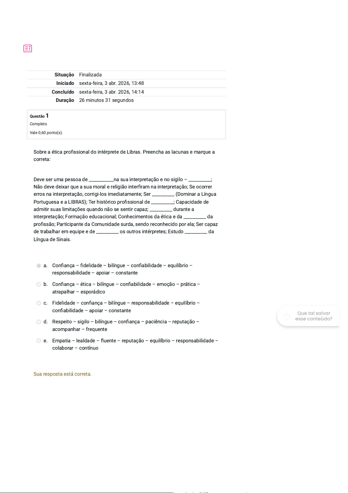 Situação Finalizada Iniciado sexta-feira, 3 abr. 2026, 13:48 Concluído sexta-feira, 3 abr. 2026, 14:14 Duração 26 minutos 31 segundos Questão 1 Completo Vale 0,60 ponto(s). Sobre a ética profissional do intérprete de Libras. Preencha as lacunas e marque a correta: Deve ser uma pessoa de ___________na sua interpretação e no sigilo – __________; Não deve deixar que a sua moral e religião interfiram na interpretação; Se ocorrer erros na interpretação, corrigi-los imediatamente; Ser __________ (Dominar a Língua Portuguesa e a LIBRAS); Ter histórico profissional de __________; Capacidade de admitir suas limitações quando não se sentir capaz; __________ durante a interpretação; Formação educacional; Conhecimentos da ética e da __________ da profissão; Participante da Comunidade surda, sendo reconhecido por ela; Ser capaz de trabalhar em equipe e de __________ os outros intérpretes; Estudo __________ da Língua de Sinais. a. Confiança – fidelidade – bilíngue – confiabilidade – equilíbrio – responsabilidade – apoiar – constante b. Confiança – ética – bilíngue – confiabilidade – emoção – prática – atrapalhar – esporádico c. Fidelidade – confiança – bilíngue – responsabilidade – equilíbrio – confiabilidade – apoiar – constante d. Respeito – sigilo – bilíngue – confiança – paciência – reputação – acompanhar – frequente e. Empatia – lealdade – fluente – reputação – equilíbrio – responsabilidade – colaborar – contínuo Sua resposta está correta. Que tal salvar esse conteúdo? Questão 2 Completo Vale 0,60 ponto(s). Questão 3 Completo Vale 0,60 ponto(s). Flexibilizar para que o acesso ao currículo seja adequado às condições dos estudantes surdos por meio de adequações/adaptações é necessário: a. Todas as alternativas são adequadas. b. Respeitar seu caminhar próprio e favorecendo seu progresso escolar; Trabalhar as potencialidades e não os limites do aluno. c. Trabalhar com aprendizagem significativa. d. Em caso de dificuldade de atuação busque apoios especializados na coordenação pedagógica, numa conversa com o intérprete de Libras, em cursos e capacitações nessa área. e. Adotar metodologias de ensino diversificadas, respeitando as singularidades do estudante. Sua resposta está correta. O ensino de Língua Portuguesa, como segunda língua compõe o atendimento educacional especializado para estudantes surdos. Nesta perspectiva, segundo Alves, Ferreira e Damázio (2010, p. 18-19) a sala de recursos para esse atendimento deverá ser organizada didaticamente, espeitando alguns princípios. a. Realizado todos os dias, para alunos com surdez, no mesmo horário das aulas comuns, por um professor de Língua Portuguesa, graduado nesta área, preferencialmente. b. Realizado todos os dias, para alunos com surdez, à parte das aulas comuns, por um professor de Língua Portuguesa, graduado nesta área, preferencialmente. c. Realizado todos os dias, para alunos ouvintes e com surdez, à parte das aulas comuns, por um professor de Língua Portuguesa, graduado nesta área, preferencialmente. d. Realizado todos os dias, para alunos ouvintes, à parte das aulas comuns, por um professor de Língua Portuguesa, graduado nesta área, preferencialmente. e. Realizado esporadicamente, para alunos com surdez, à parte das aulas comuns, por um professor de Língua Portuguesa, graduado nesta área, preferencialmente. Sua resposta está correta. Que tal salvar esse conteúdo? Questão 4 Completo Vale 0,60 ponto(s). Questão 5 Completo Vale 0,60 ponto(s). Teve alto índice de rejeição na educação dos surdos, porque se utilizava de todos os modos linguísticos: gestos criados pelas crianças, língua de sinais, fala, leitura orofacial, alfabeto manual, leitura e escrita, para a comunicação do surdo. Tudo isso causou grande confusão no ensino e na aprendizagem desses sujeitos. a. Oralismo. b. Libras. c. Bilinguismo. d. Comunicação Total. e. Pedagogia da Diferença. Sua resposta está correta. É na visão desses Surdos o modelo educacional que mais corresponde à proposta de ensino para surdos, que apresenta como pressuposto básico o uso da língua de sinais, língua natural do surdo no Brasil, prioriza a Libras e o Português escrito como línguas de instrução. a. Libras. b. Comunicação Total. c. Bilinguismo. d. Pedagogia da Diferença. e. Oralismo. Sua resposta está correta. Que tal salvar esse conteúdo? Questão 6 Completo Vale 0,60 ponto(s). Questão 7 Completo Vale 0,60 ponto(s). Analise as alternativas e marque a(s) correta(s): I. As línguas de sinais são usadas para pensar, são usadas para desempenhar diferentes funções. Você pode argumentar em sinais, pode fazer poesia em sinais, pode simplesmente informar, pode persuadir, pode dar ordens, fazer perguntas em sinais. II. A língua de sinais não é regida por regras, visto que os sinais podem ser produzidos de qualquer maneira, não exigindo um padrão na língua. III. A língua de sinais é uma língua autônoma, com suas próprias regras gramaticais. IV. A língua de sinais pode ser analisada nos nı́veis fonológico, morfológico, sintático, semântico e pragmático. a. As alternativas I, III e IV estão corretas. b. As alternativas I, II, III e IV estão corretas. c. As alternativas I e II estão corretas. d. As alternativas I e IV estão corretas. e. Apenas a alternativa II está correta. Sua resposta está correta. Considera-se pessoa surda aquela que: a. Todas a alternativas estão corretas. b. Não tem perda auditiva, compreende e interage com o mundo por meio de experiências sonoras, manifestando sua cultura e principalmente pelo uso da língua oral. c. Denomina-se surdo-mudo. d. Tem perda bilateral, parcial ou total de quarenta e um decibéis, ou mais, aferida por audiograma. e. Tem perda auditiva, mas compreende e interage com o mundo por meio de experiências visuais, manifestando sua cultura e 